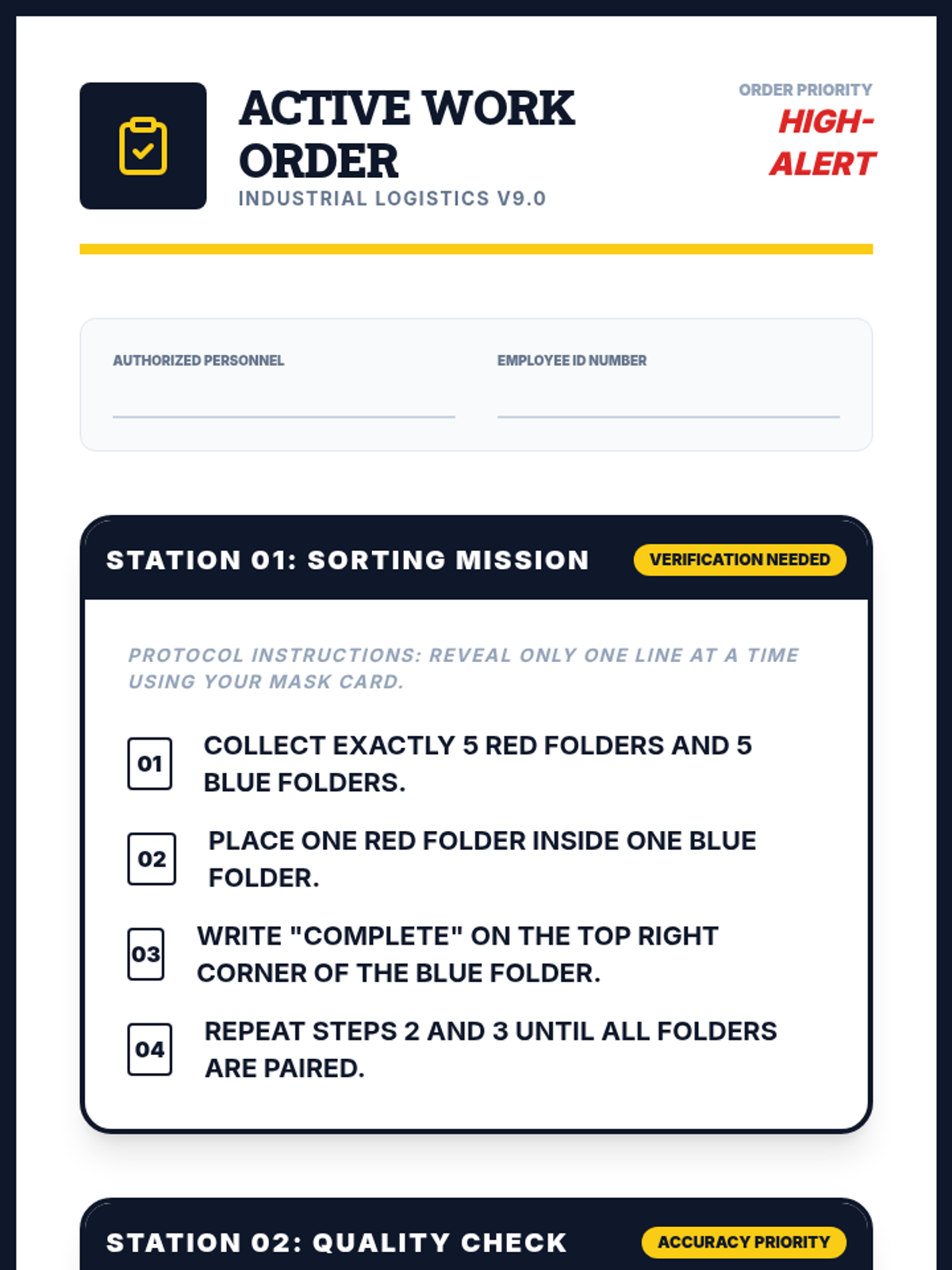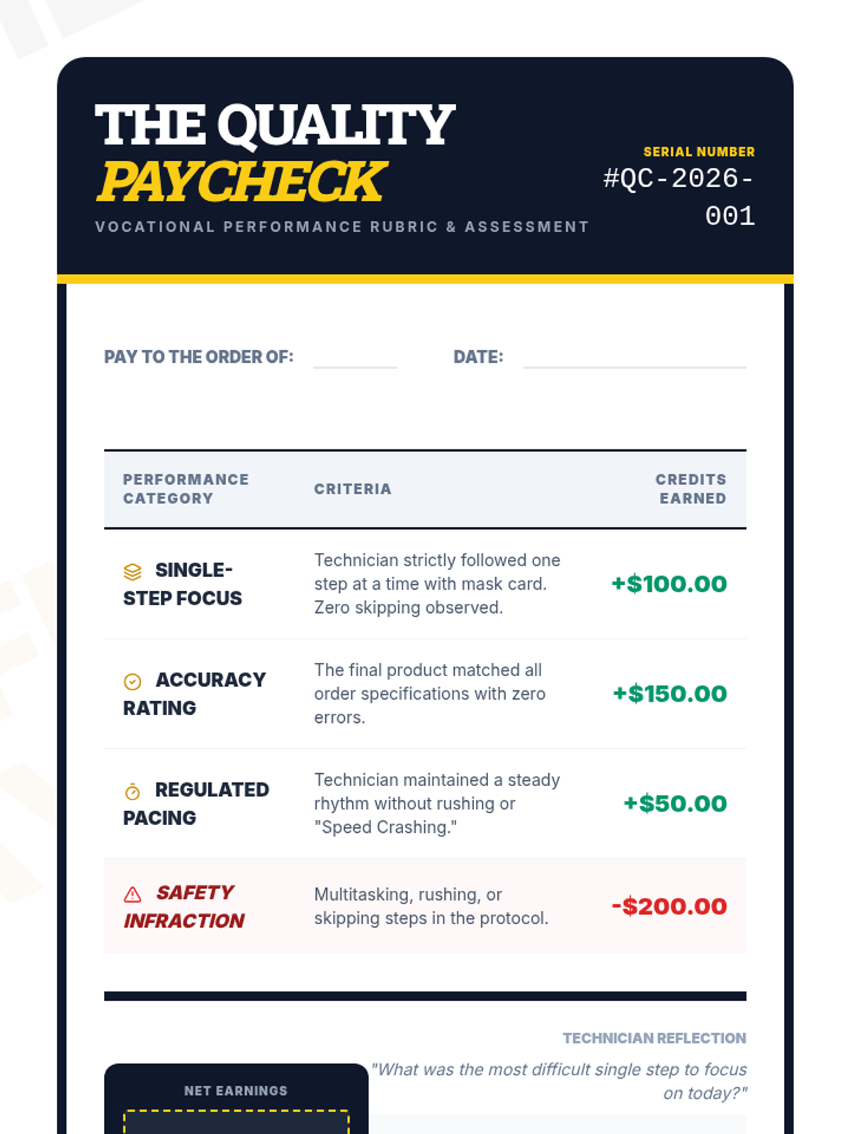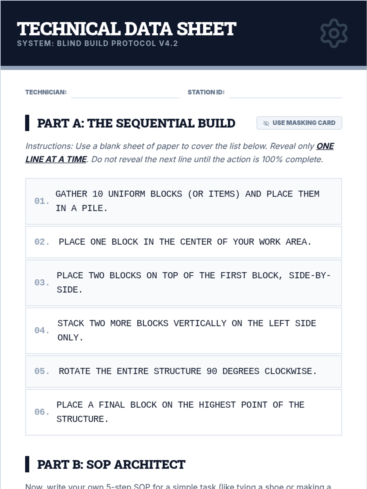 Students learn to interpret and create Standard Operating Procedures (SOPs), practicing the 'blind build' method to master one-step-at-a-time execution.
