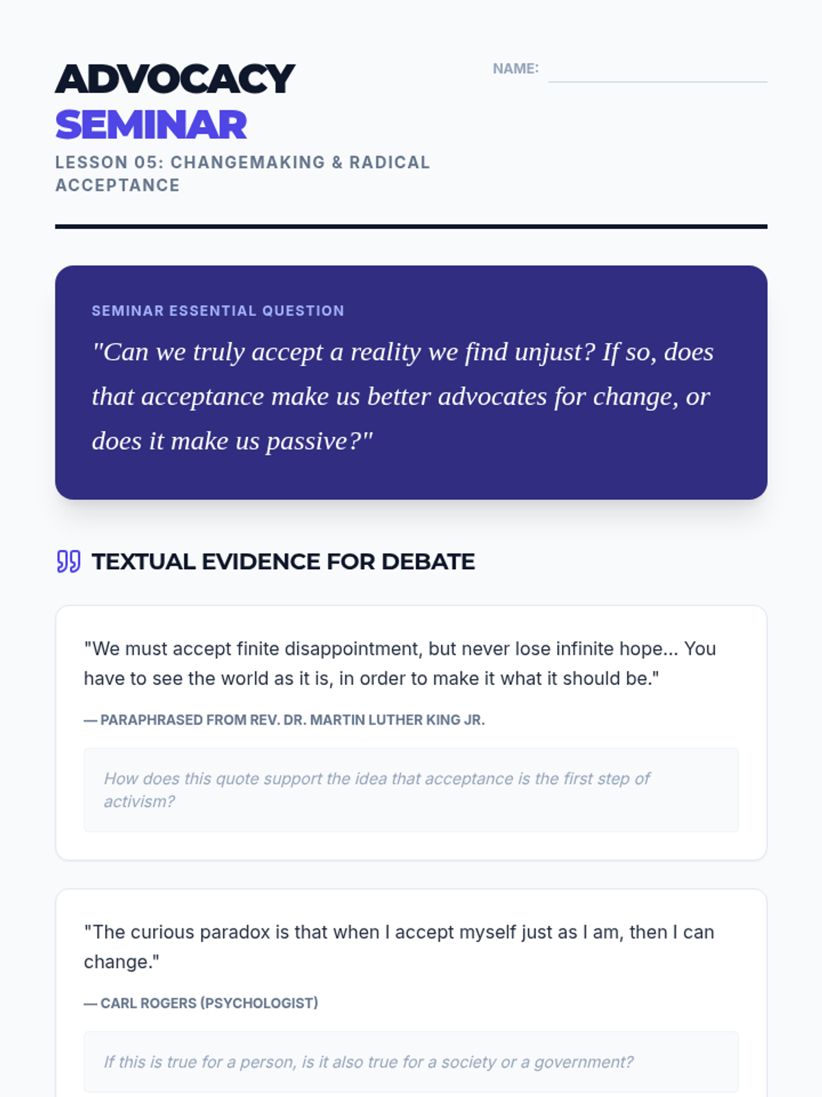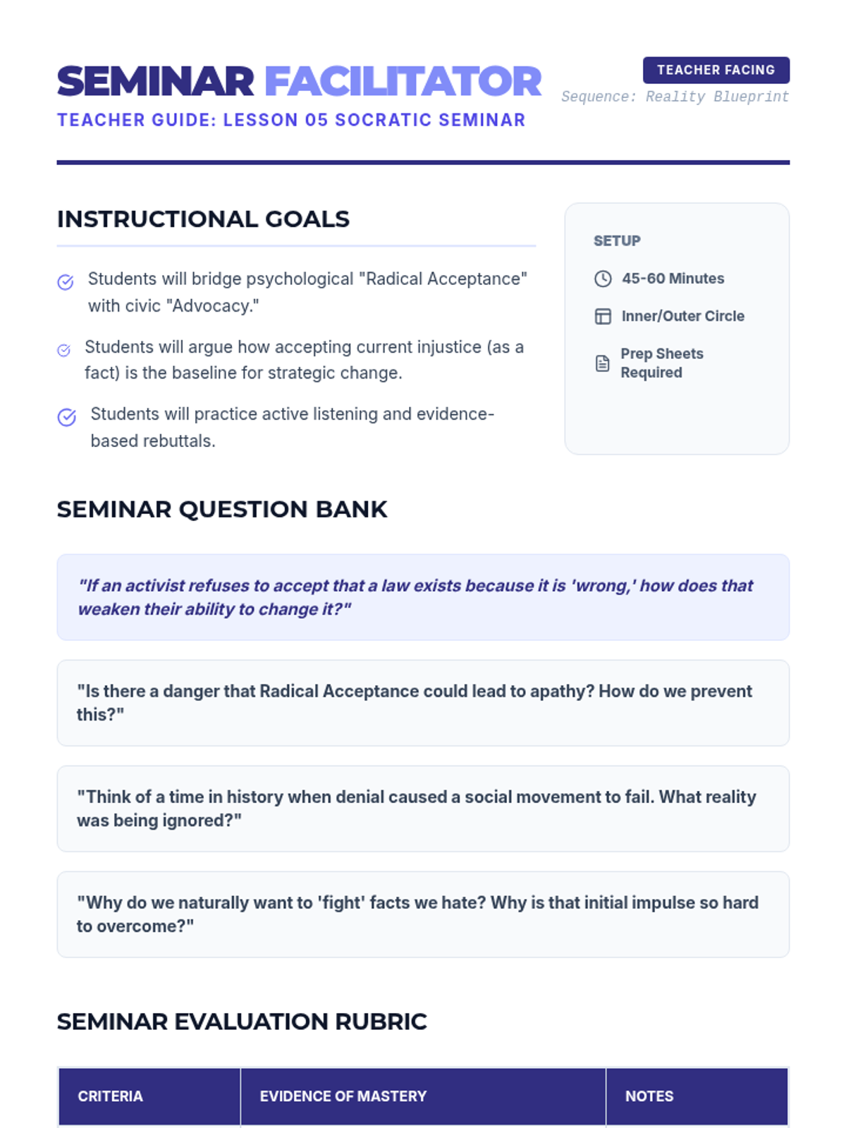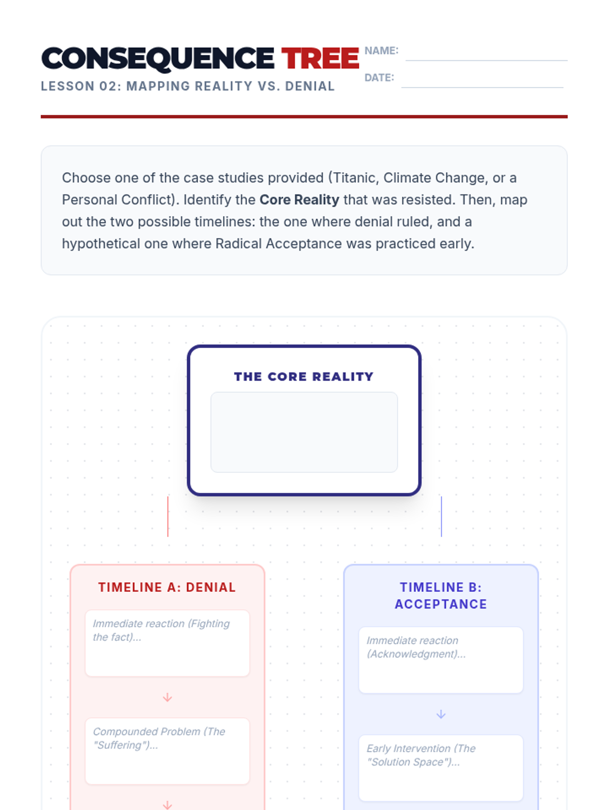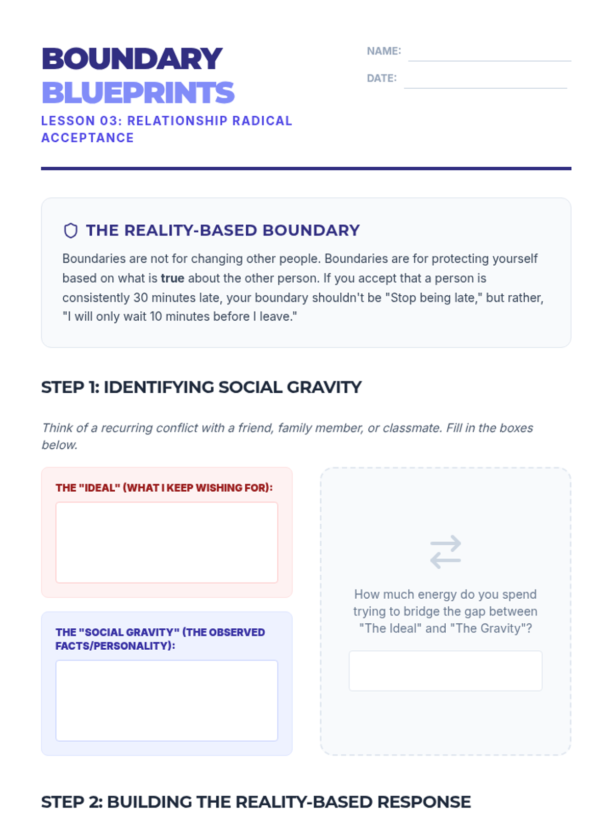 Radical Acceptance PracticeTechniques for acknowledging reality without judgment to reduce emotional suffering and psychological resistance. Develops distress tolerance skills through mindfulness, cognitive reframing, and acceptance-based coping strategies.