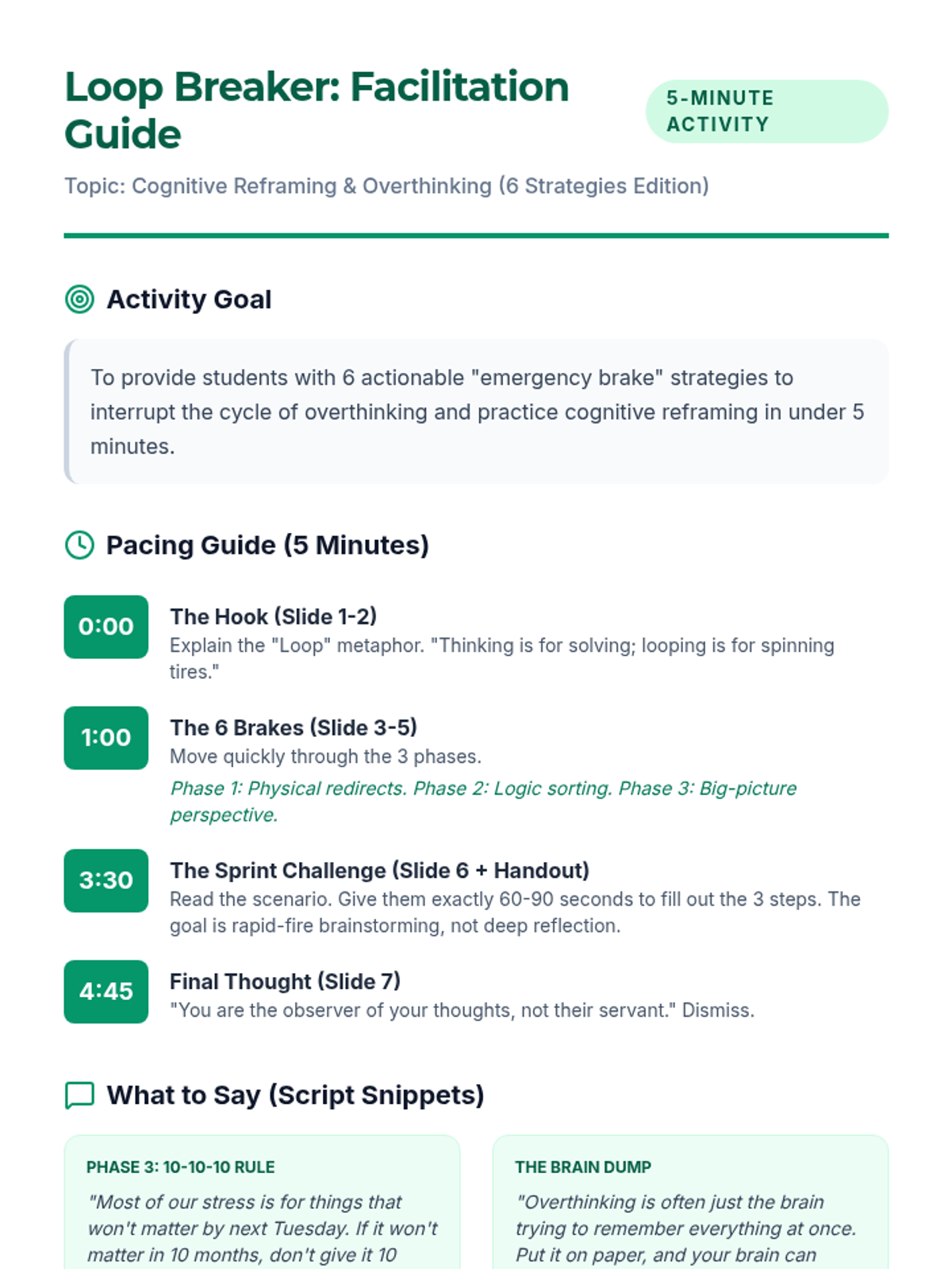 Challenging Negative ThoughtsCognitive restructuring techniques and identification of common cognitive distortions. Equips learners with evidence-based questioning strategies to reframe maladaptive self-talk and promote balanced thinking.