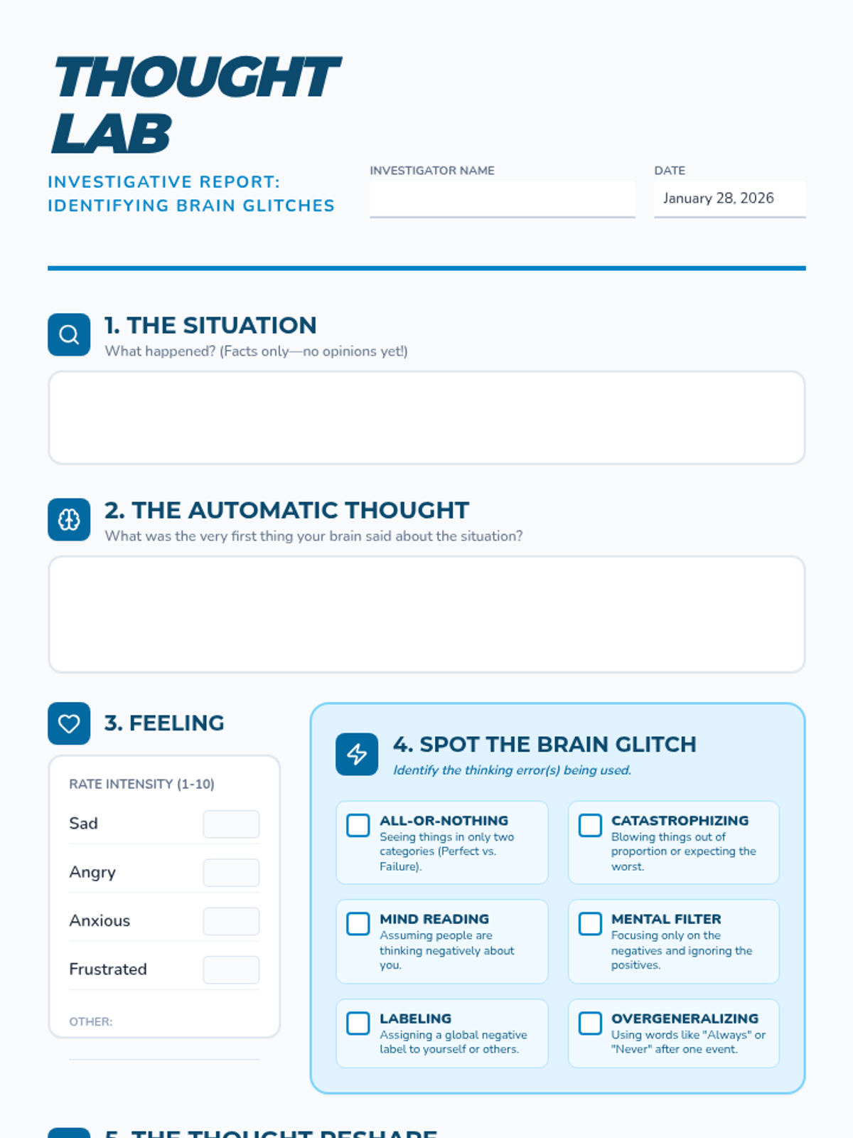 Recognizing Thinking PatternsIdentification of common cognitive distortions such as catastrophizing, overgeneralization, and emotional reasoning. Strengthens metacognitive awareness to disrupt negative internal monologues and promote balanced perspectives.