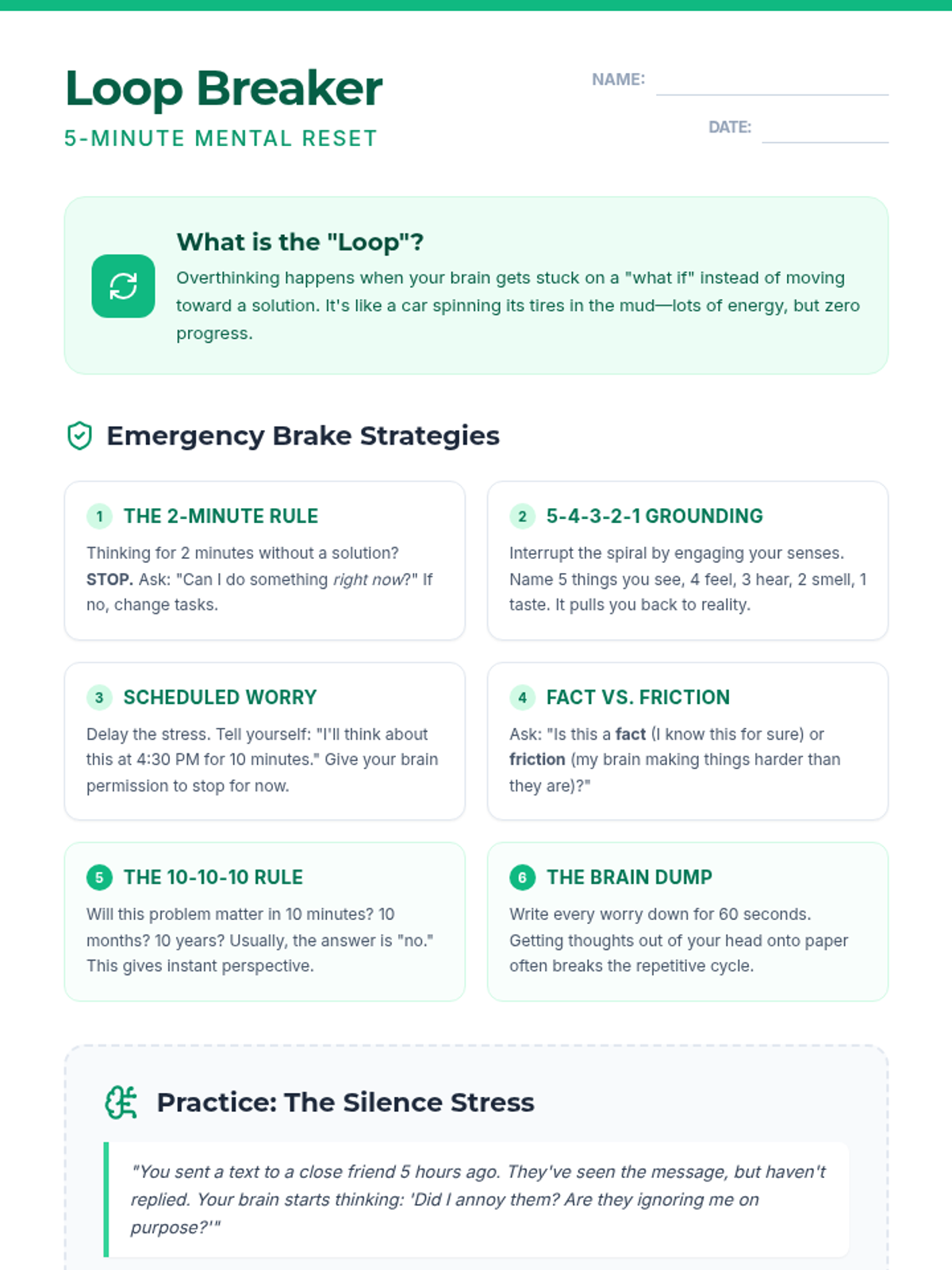 Synthesis of skills to create personal reframing guides, shifting from anxious spiraling to balanced, realistic internal narratives.