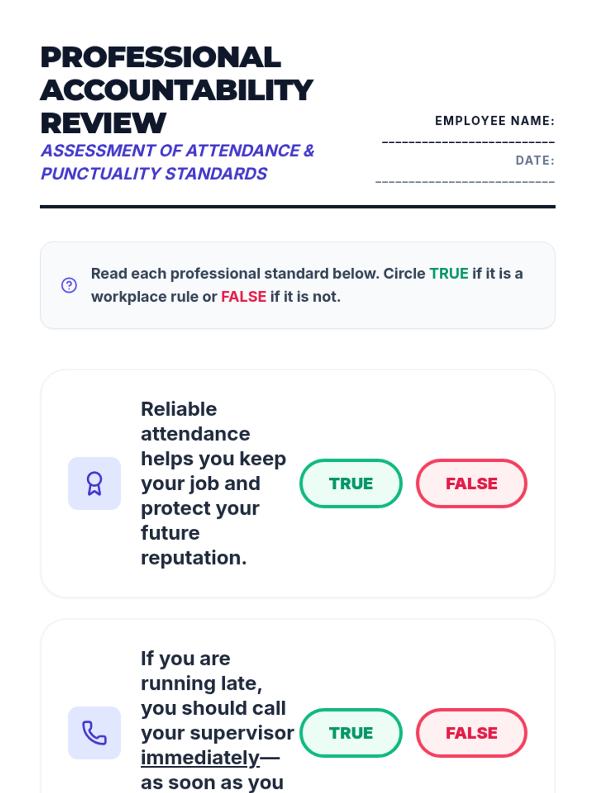 A comprehensive 90-minute professional development lesson on workplace attendance and punctuality, designed for adult learners with intellectual and developmental disabilities. Focuses on business impact, disciplinary stages, and proactive communication.