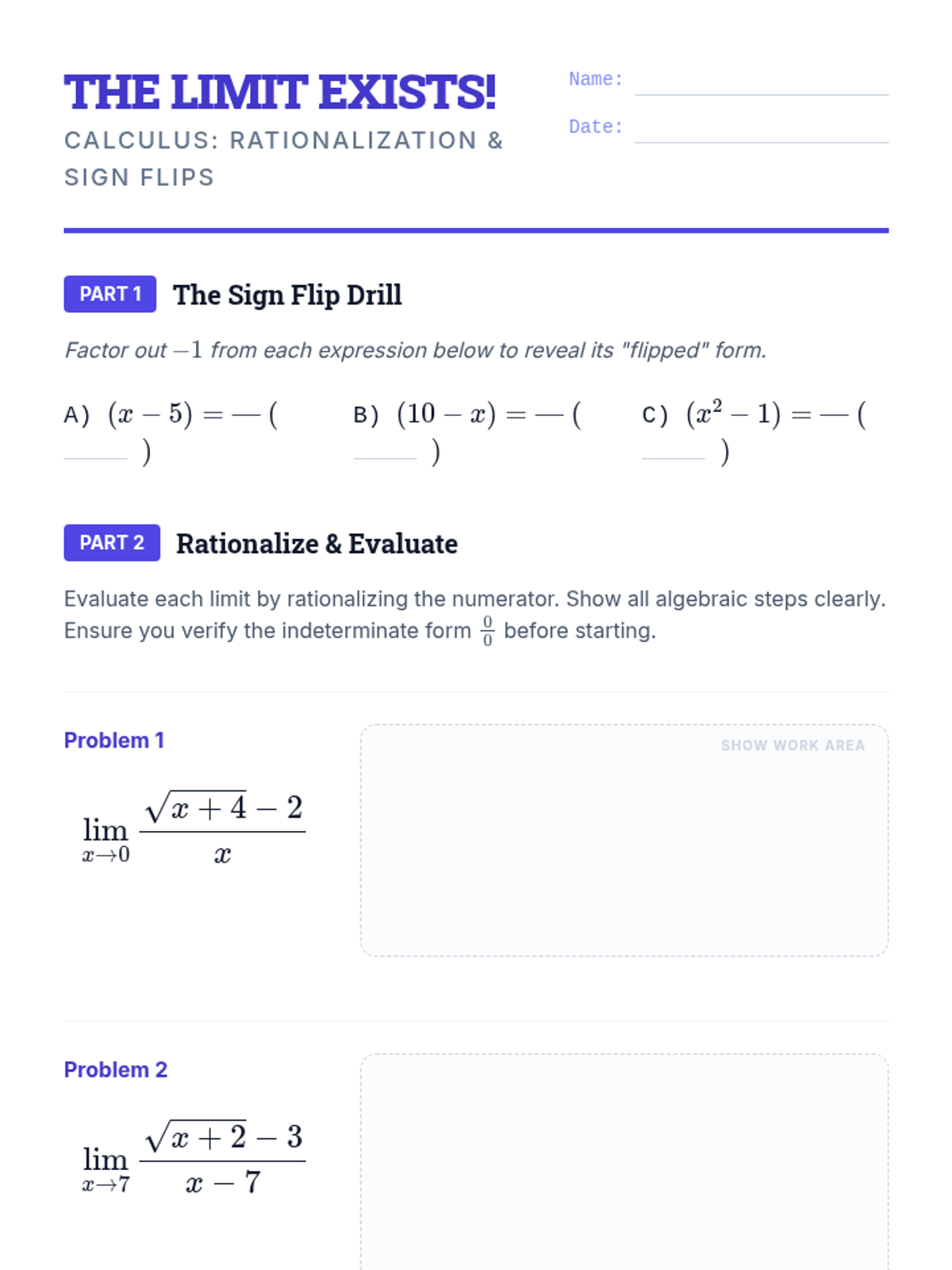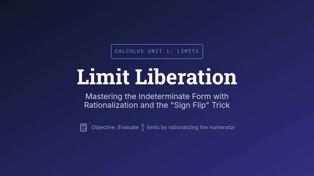 A 12th-grade Calculus lesson focused on using rationalization to evaluate limits that result in the 0/0 indeterminate form, featuring the 'sign flip' trick for complex simplifications.
