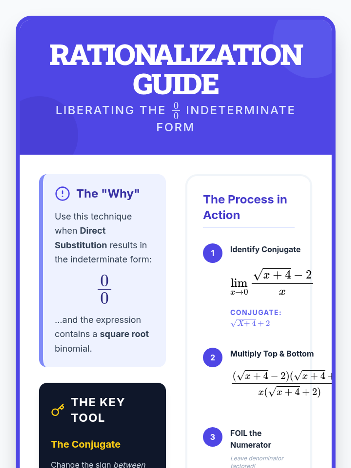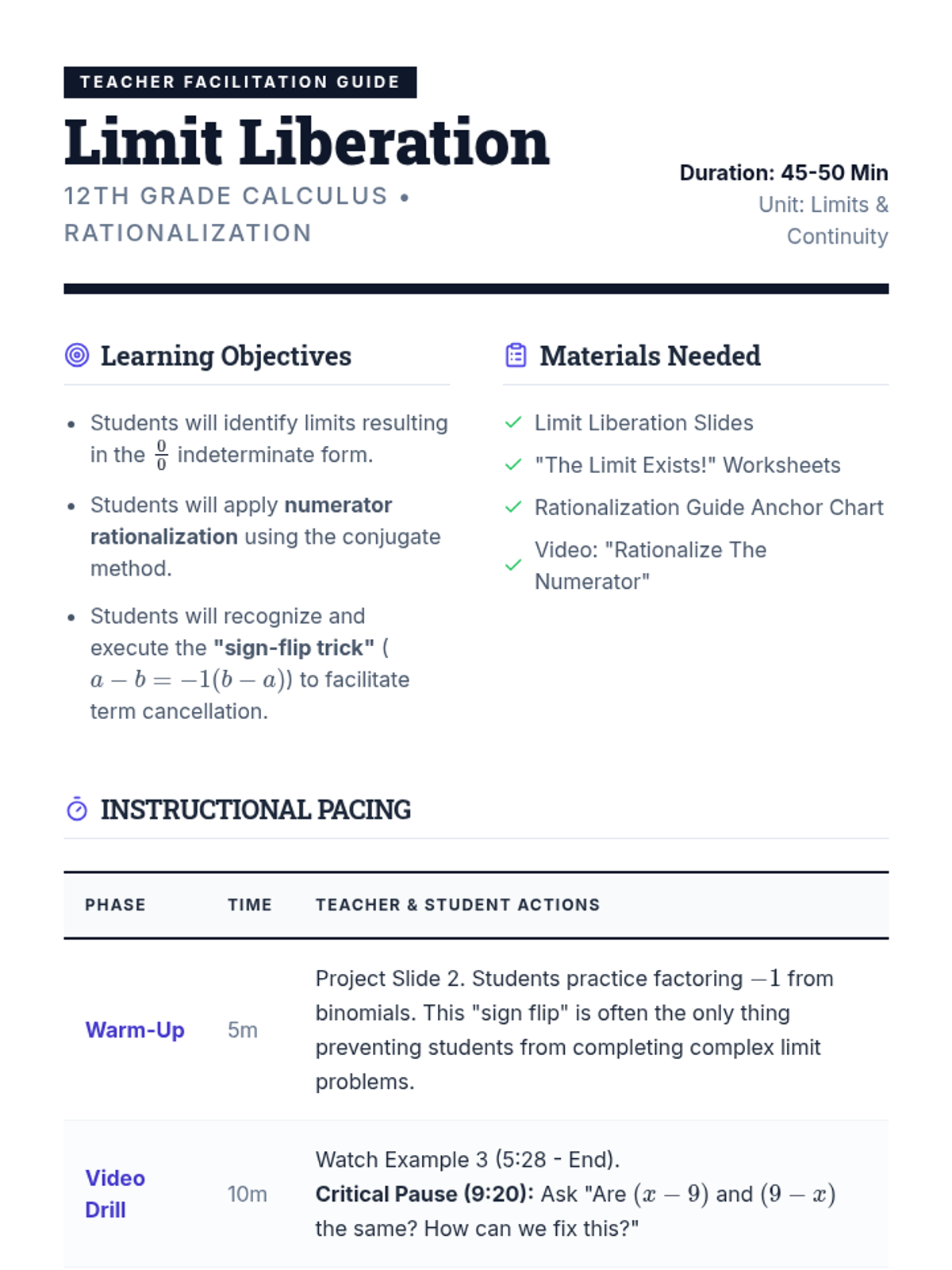 This lesson focuses on resolving indeterminate forms ($0/0$) when finding the slope of tangent lines for radical functions using the limit definition. Students will practice rationalizing techniques and collaborate to create a reference guide for handling radical limits.