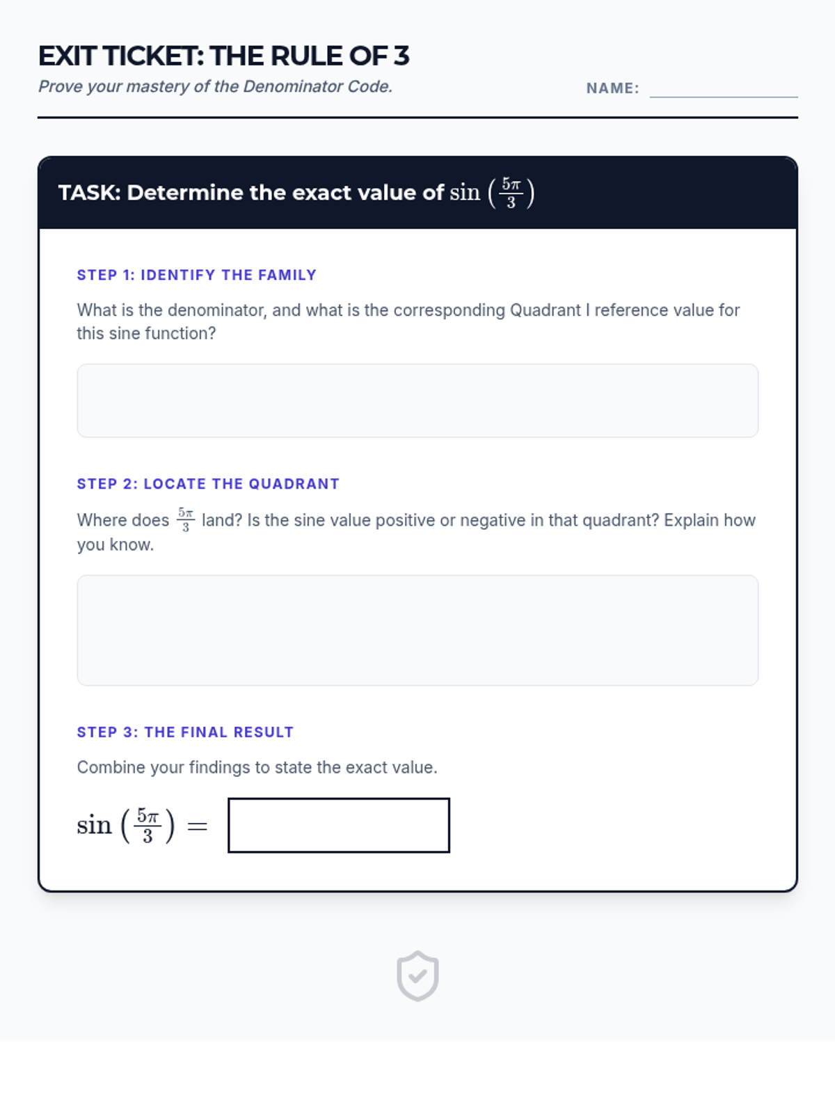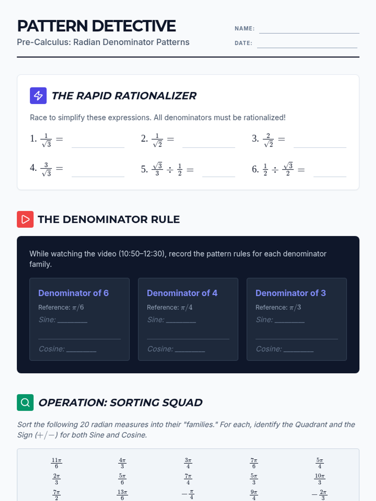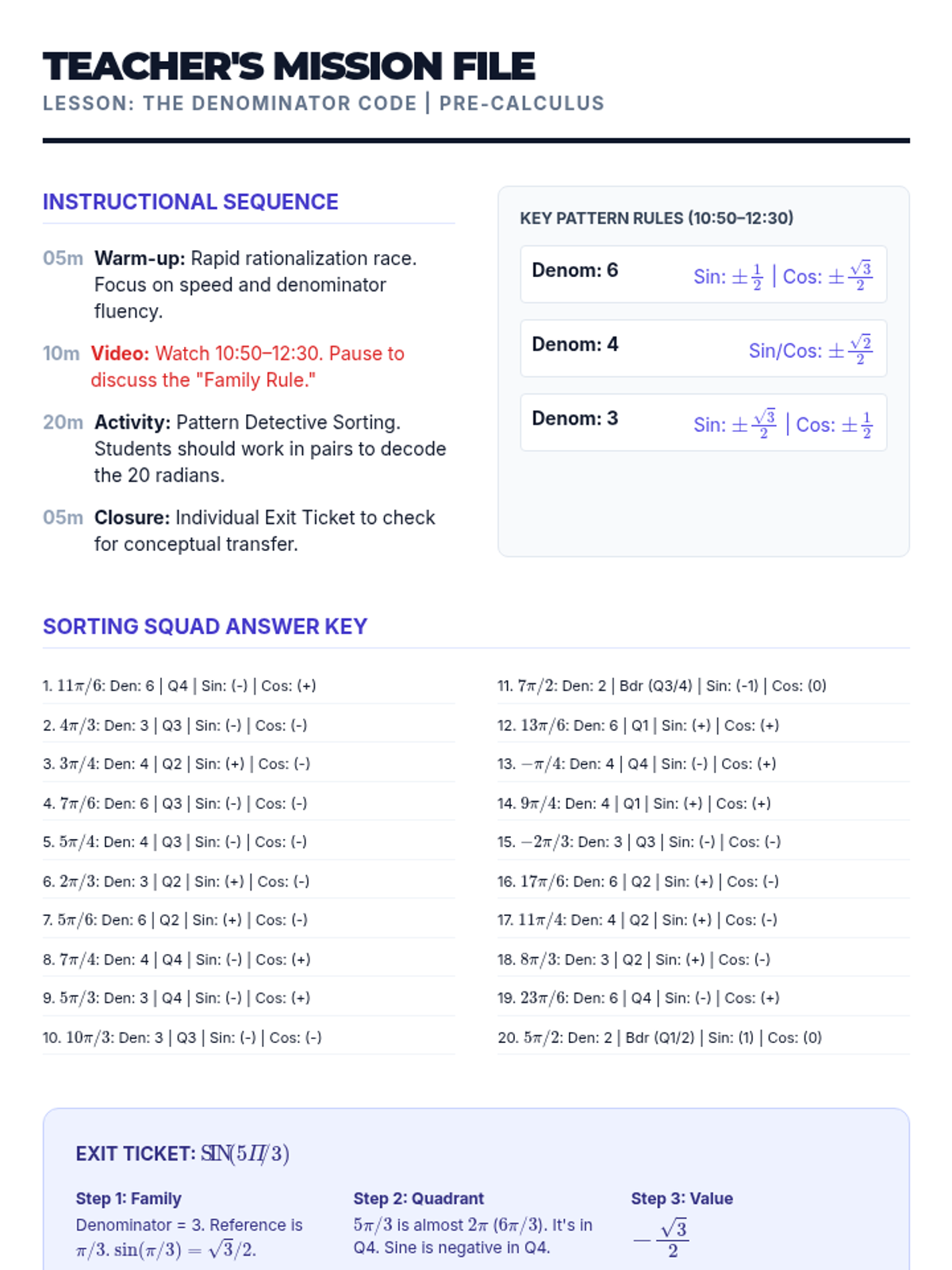 Students will master the 'Denominator Rule' to rapidly identify trigonometric values on the unit circle by recognizing patterns in radian measures, focusing on denominator-based reference angles and quadrant-based signs.
