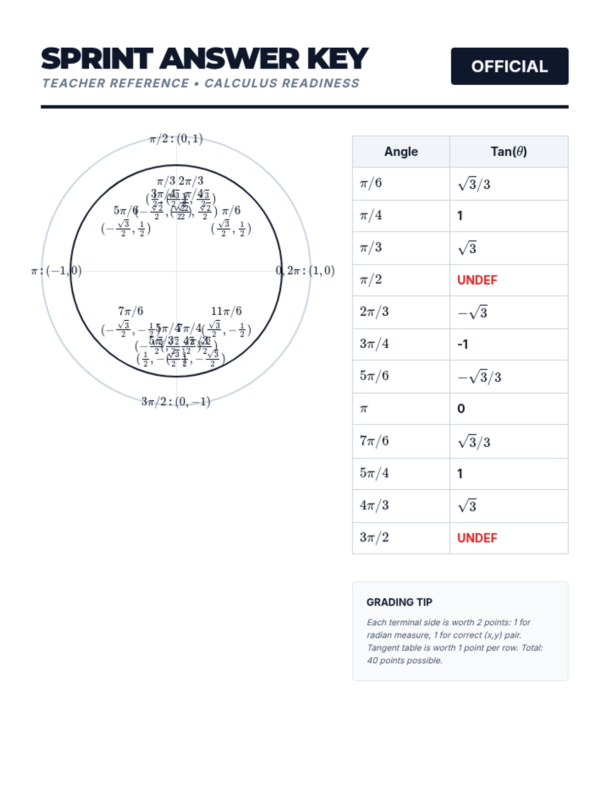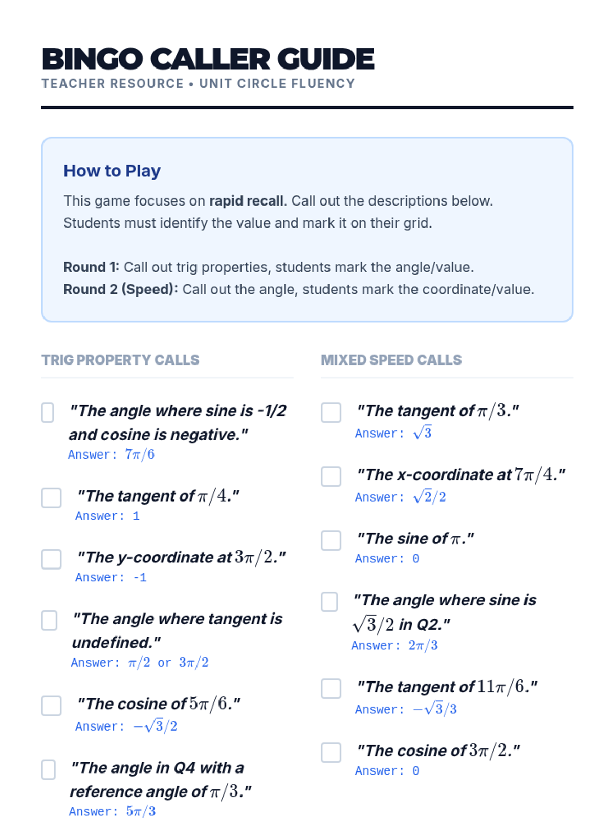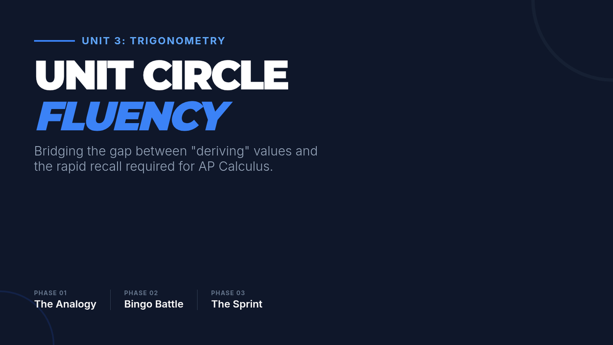 A high-energy lesson focused on building the rapid recall of unit circle values necessary for success in Calculus limits and derivatives. Students engage with a multiplication-table analogy, play a competitive game of Bingo, and complete a timed performance sprint.