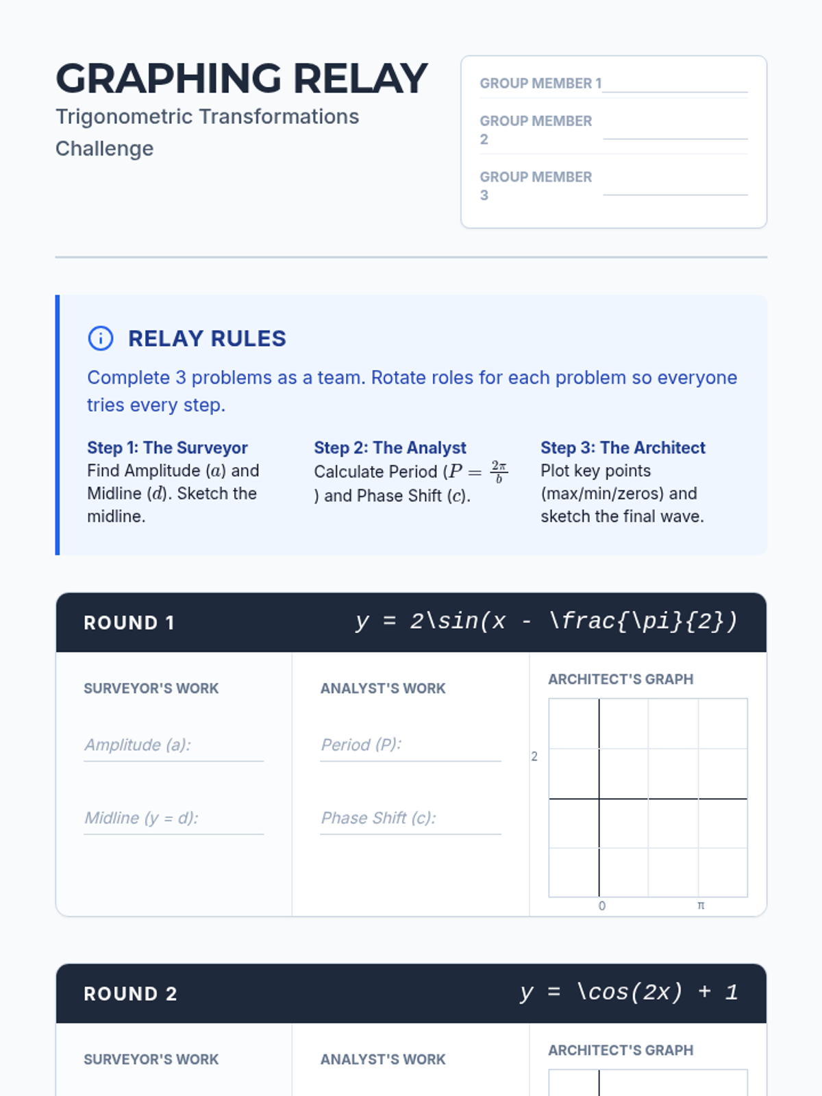 Students will master calculating the period and phase shift of sine and cosine functions and practice sketching their graphs through a collaborative 'Graphing Relay' activity. The lesson uses visual models and video-guided practice to bridge the gap between algebraic equations and trigonometric visuals.