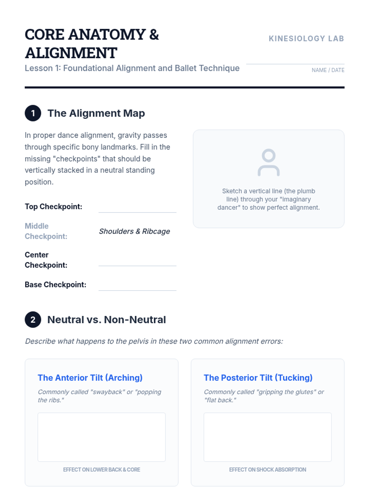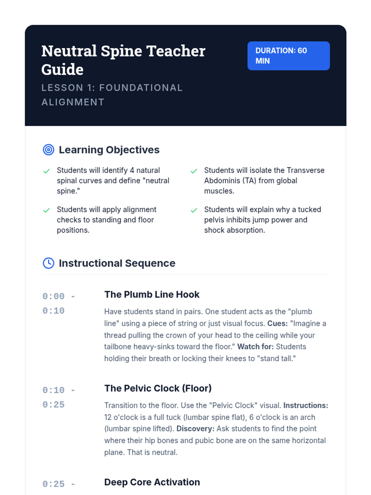 This sequence bridges biomechanics and classical ballet, teaching 8th-grade dancers how skeletal alignment and core stability serve as the foundation for movement efficiency and injury prevention. Students progress from floor-based alignment checks to complex center adagio, deconstructing the physics of turnout, foot articulation, and vertical balance.
