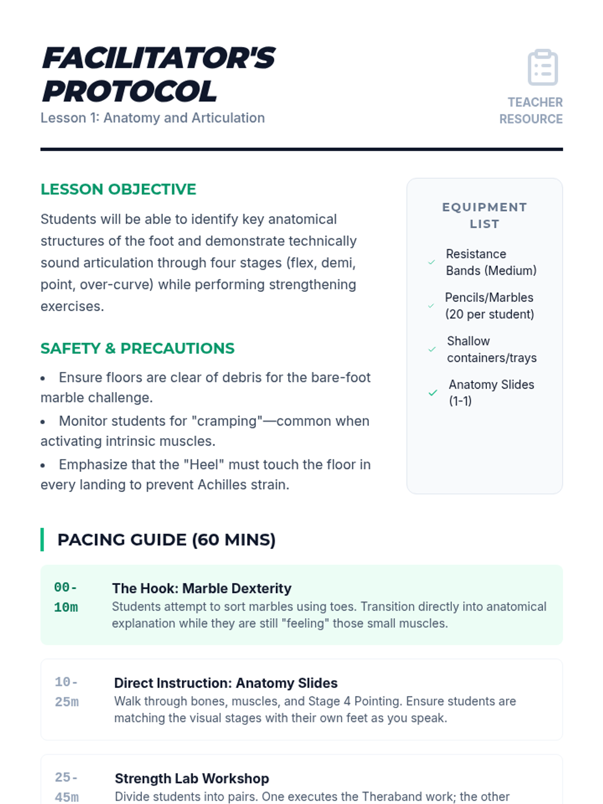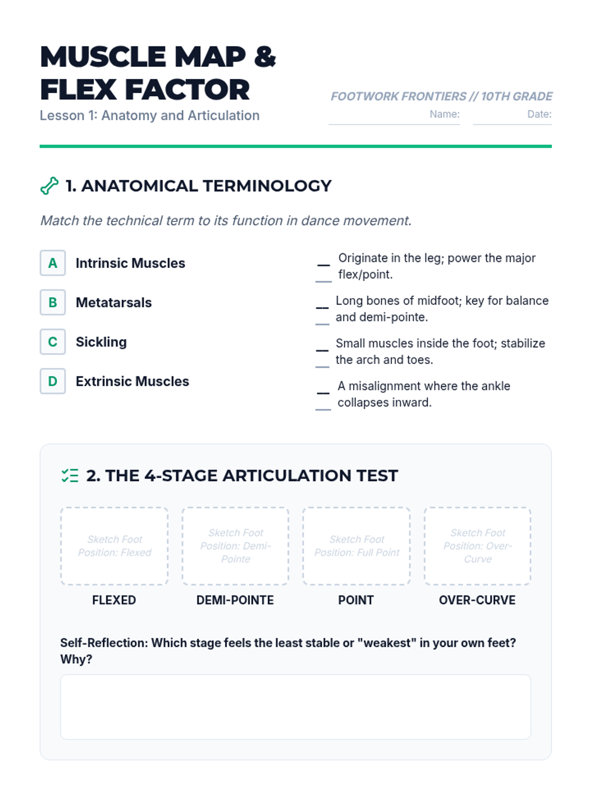 A technical dance sequence for 10th graders exploring footwork precision, rhythmic articulation, and stylistic nuances across ballet, jazz, and contemporary dance. Students move from anatomical foundations to comparative stylistic execution.