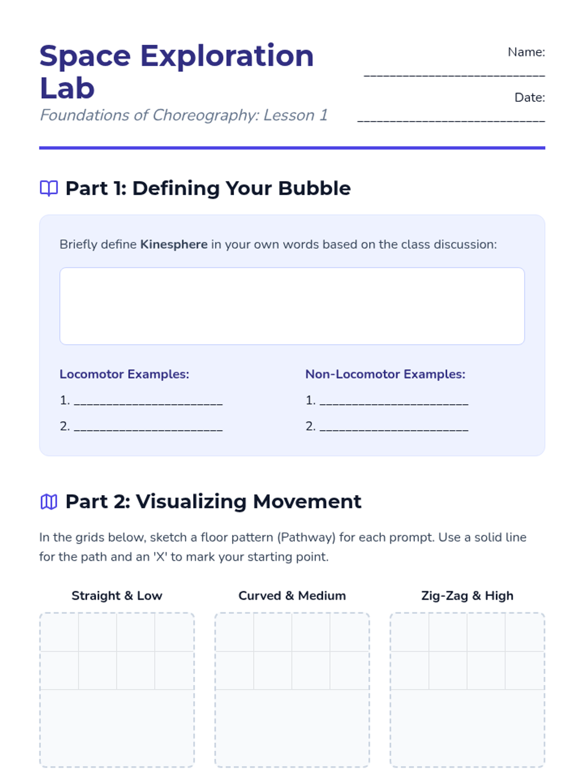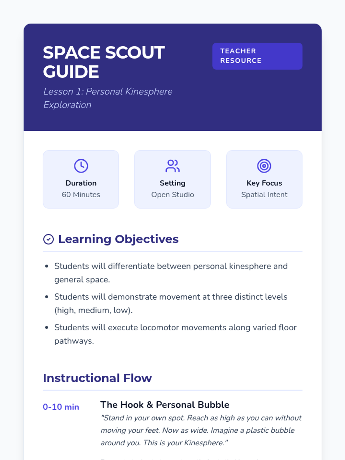 A comprehensive 5-lesson sequence for 10th-grade students focusing on the fundamental elements of dance—Space, Time, and Energy—using Laban Movement Analysis principles. Students move from exploring personal space to synthesizing complex movement phrases for performance and critique.