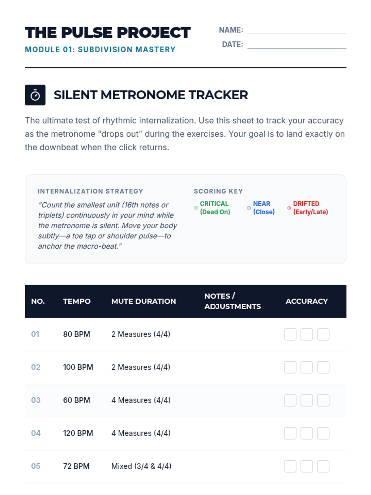 This advanced instrumental music sequence focuses on mastering rhythmic accuracy and sight-reading through mathematical subdivision, syncopation strategies, mixed meter analysis, and systematic protocols. Students will progress from internalizing a steady pulse to decoding complex Grade 4-5 rhythmic literature.