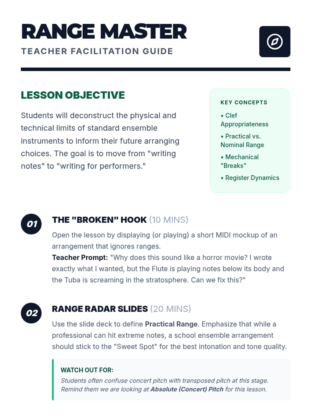A project-based unit where 10th-grade students master the mechanics of instrumental arranging. Students progress from basic range and clef literacy to producing a professionally notated ensemble score ready for live performance.