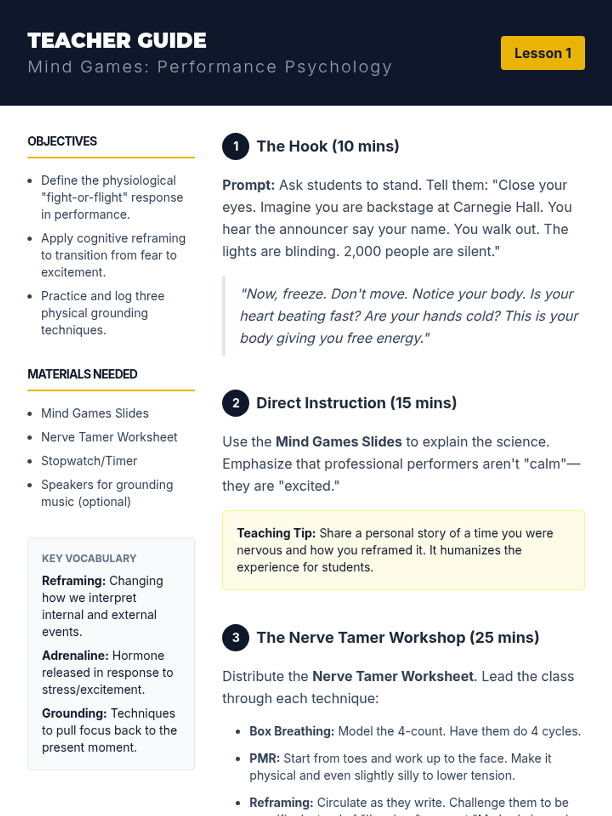 A comprehensive unit for 10th-grade vocal students focusing on performance psychology, body language, audience engagement, and stage logistics to bridge the gap between rehearsal and the stage.