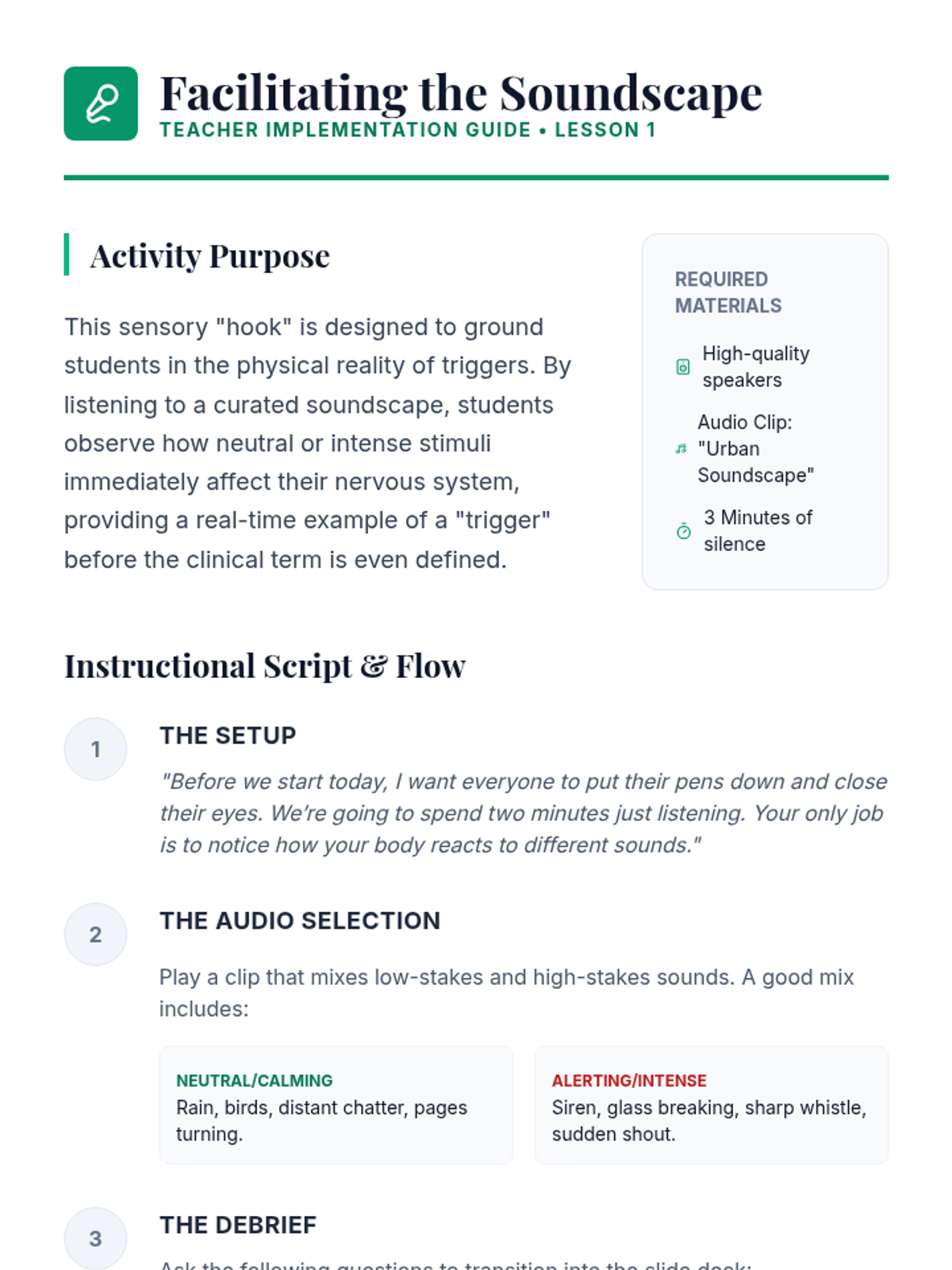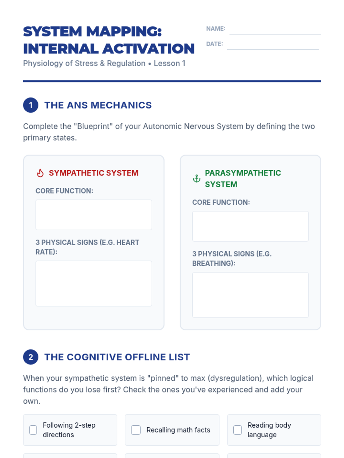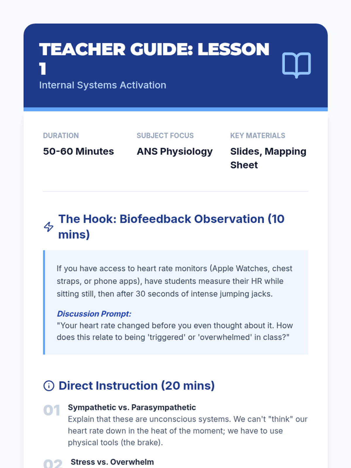 A comprehensive 5-lesson unit for 10th-grade students on the biological mechanisms of stress, the escalation cycle, and the creation of personalized sensory recovery protocols. Students explore the autonomic nervous system, map their physical cues, test sensory tools, and design 'Return to Baseline' plans.