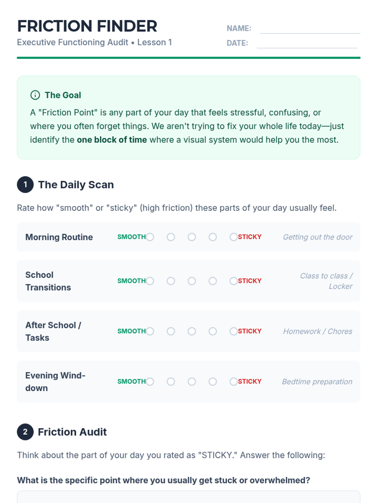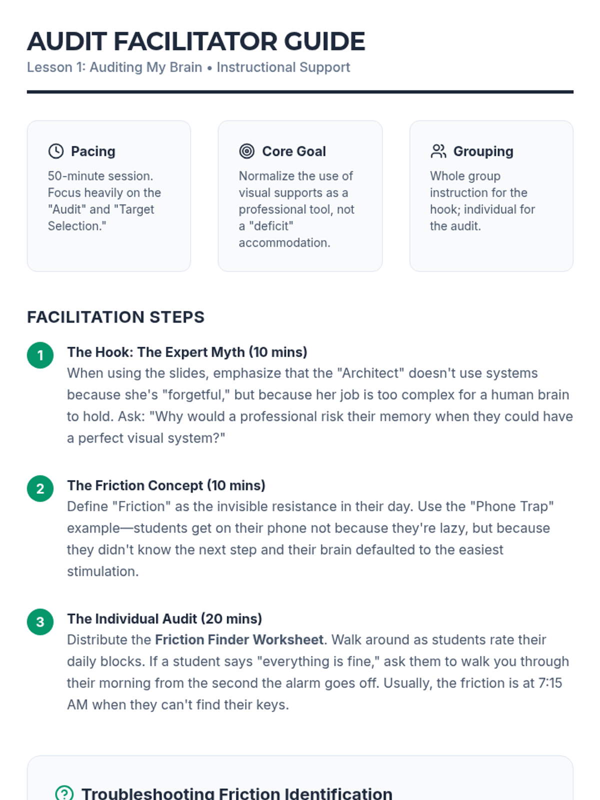 A 10th-grade sequence focused on transitioning students from teacher-directed schedules to personalized visual organization systems. Students identify executive functioning friction points, explore diverse visual formats (Kanban, time-blocking, checklists), and iterate on a custom prototype to increase independence and reduce anxiety.