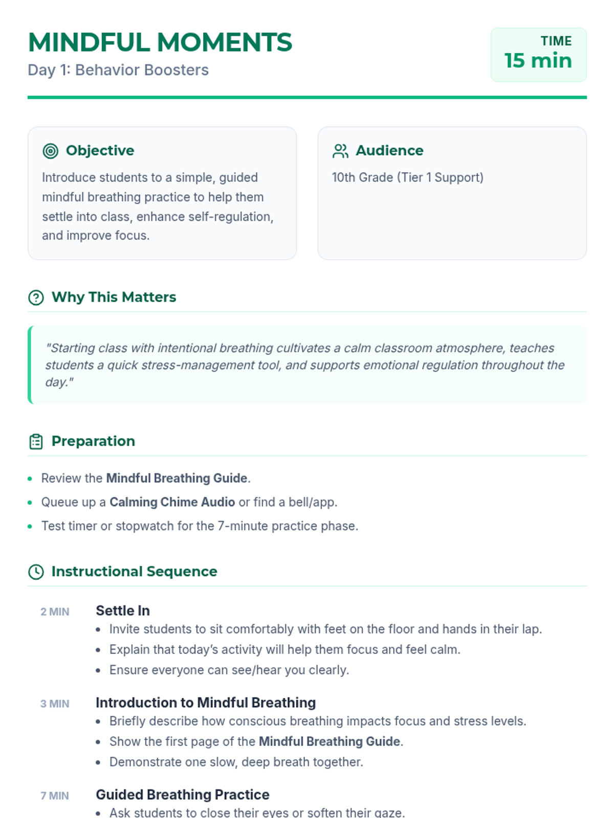 A week-long series of 15-minute daily activators designed for 10th-grade students to promote self-regulation, positive behavior, and social-emotional skills. these Tier 1 routines help students start class with focus and calm.