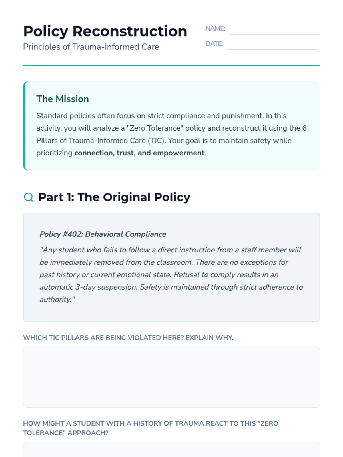 This sequence explores the core principles of Trauma-Informed Care (TIC) and develops practical skills in non-verbal communication, verbal de-escalation, and professional boundary-setting for 10th-grade students.