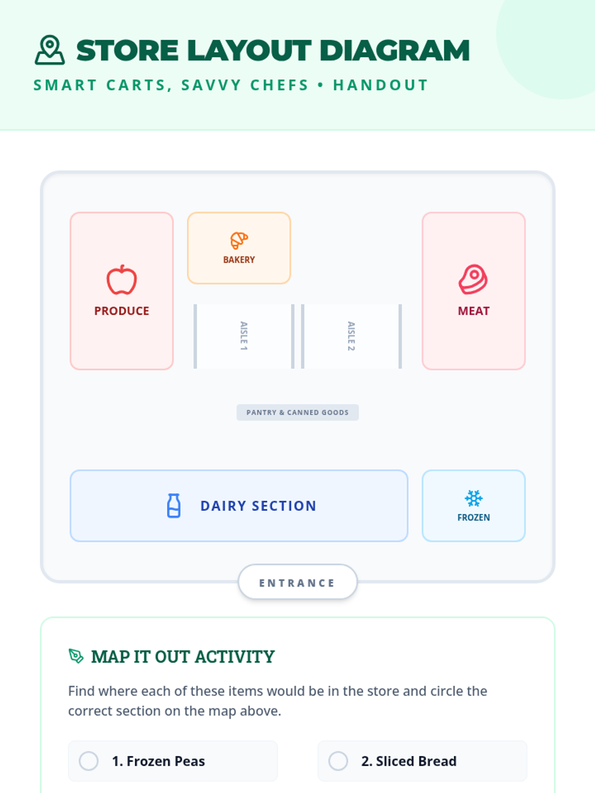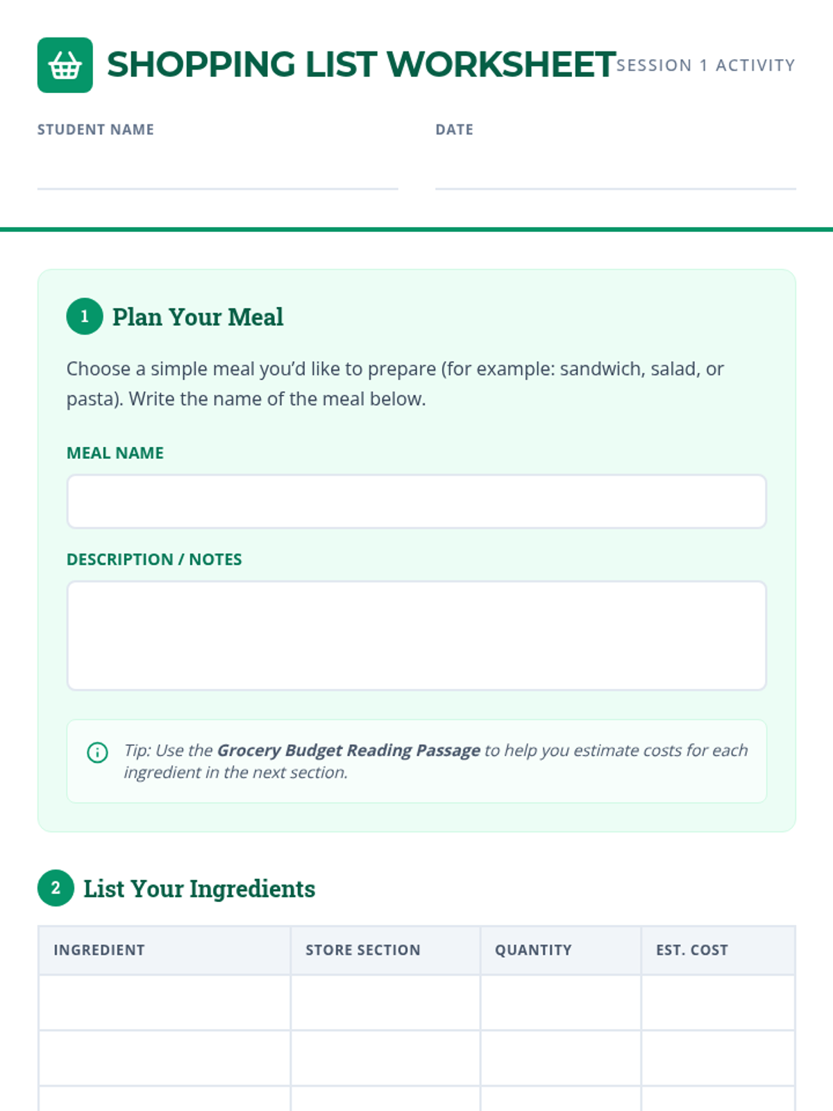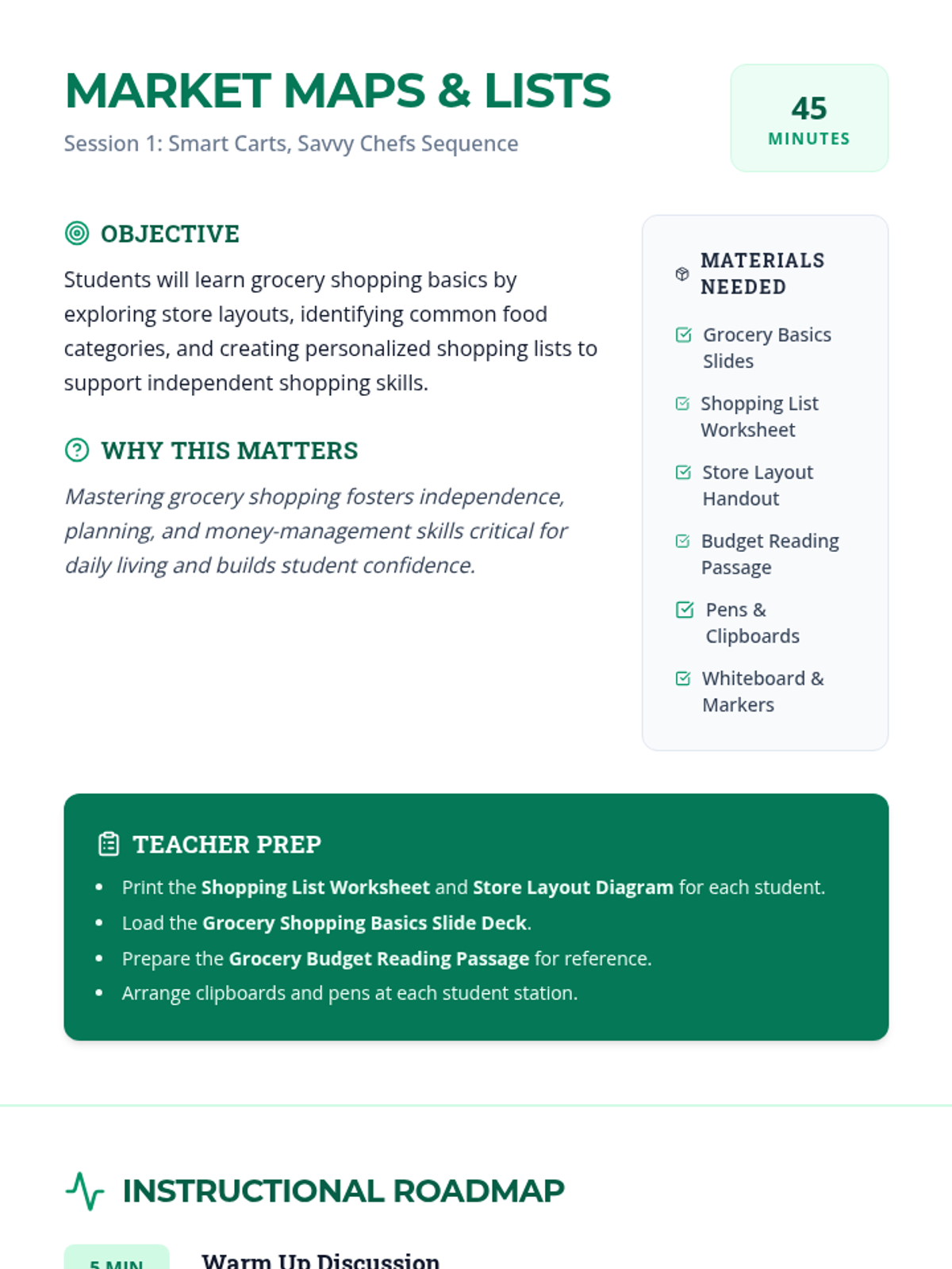 A three-session transition life skills course teaching students essential grocery shopping, budgeting, and meal preparation skills. Students learn to navigate store layouts, compare prices using unit pricing, and safely prepare simple, healthy meals.