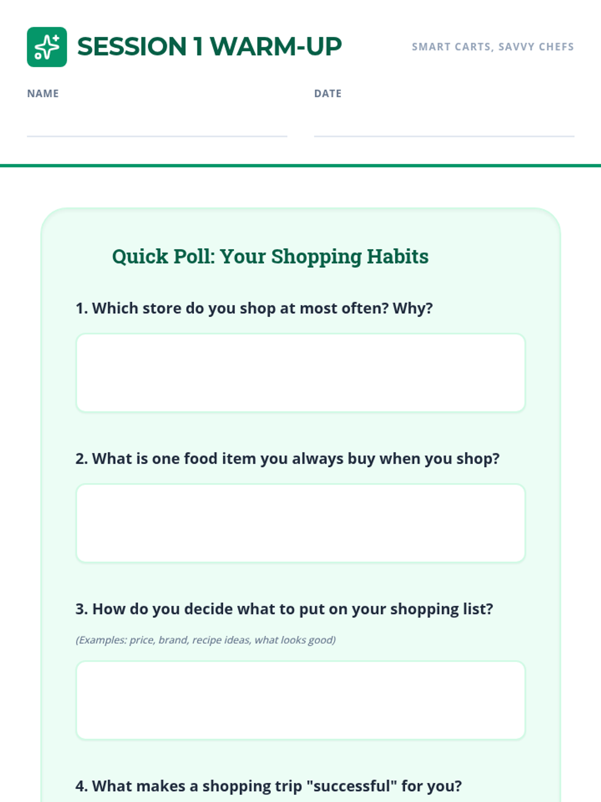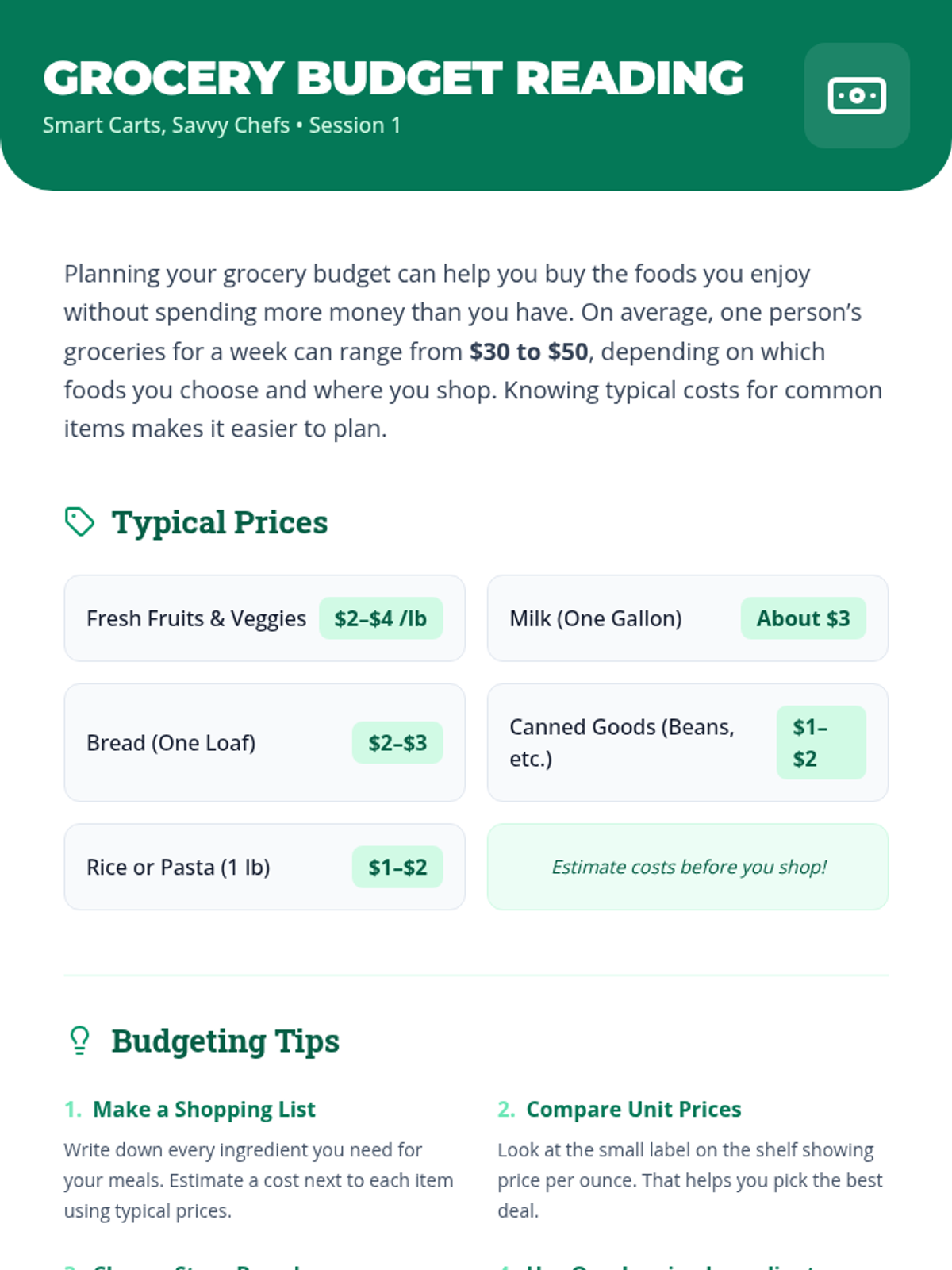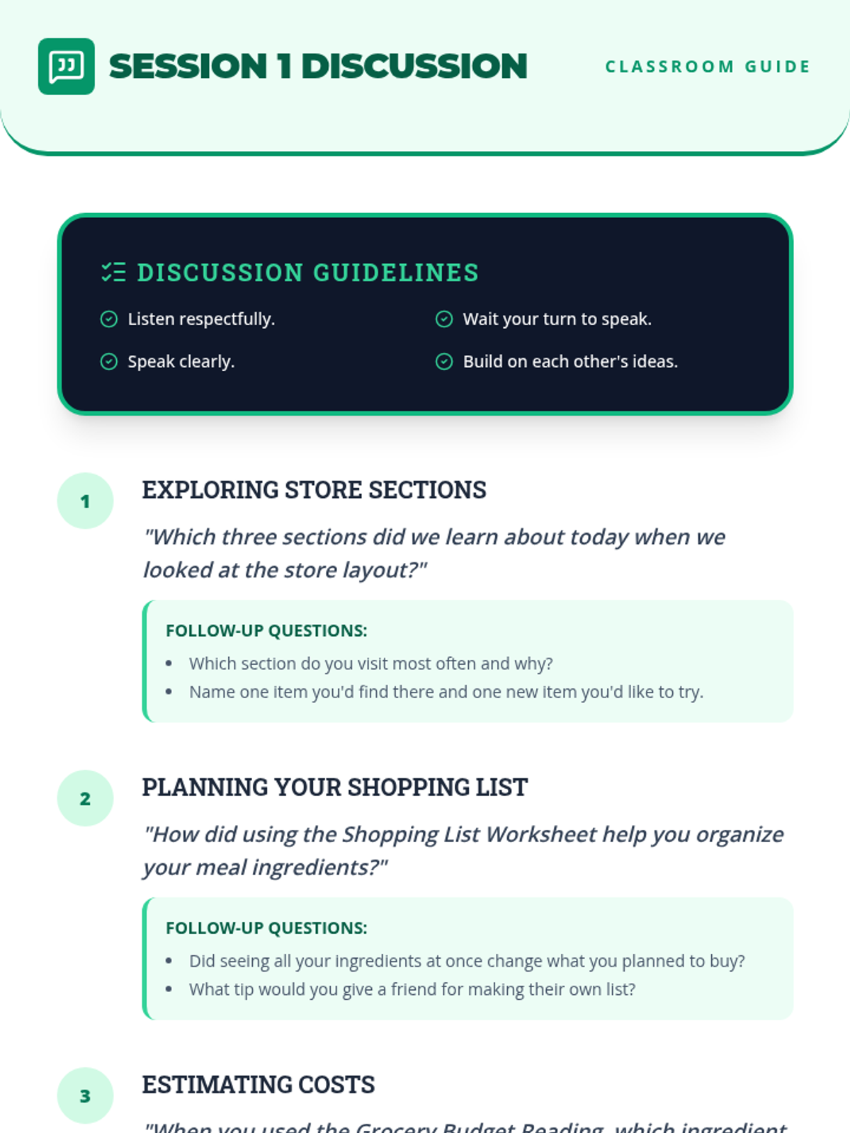 A three-session transition life skills course teaching students essential grocery shopping, budgeting, and meal preparation skills. Students learn to navigate store layouts, compare prices using unit pricing, and safely prepare simple, healthy meals.