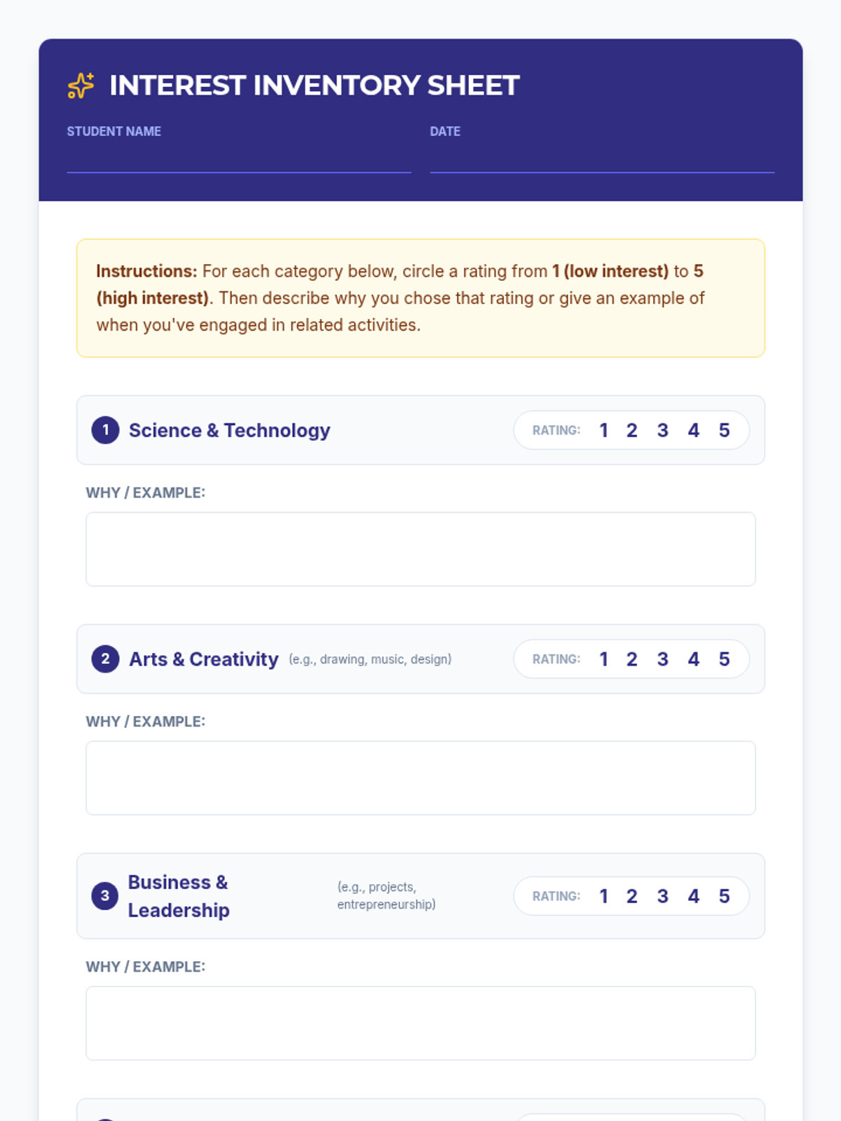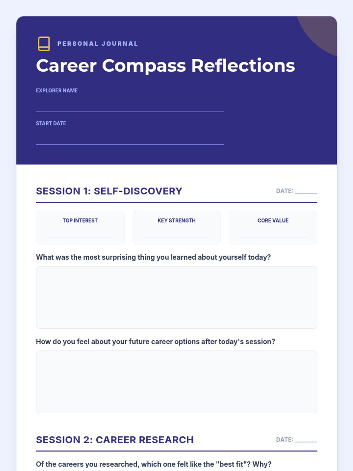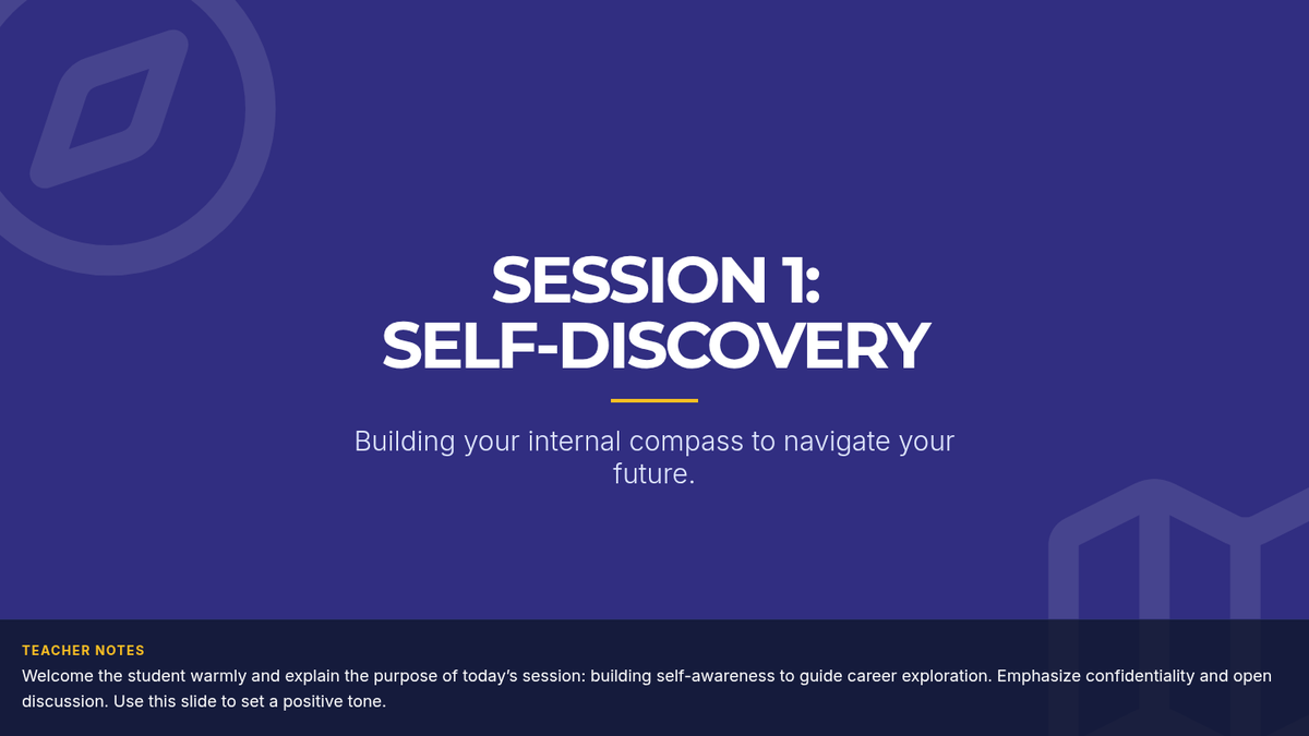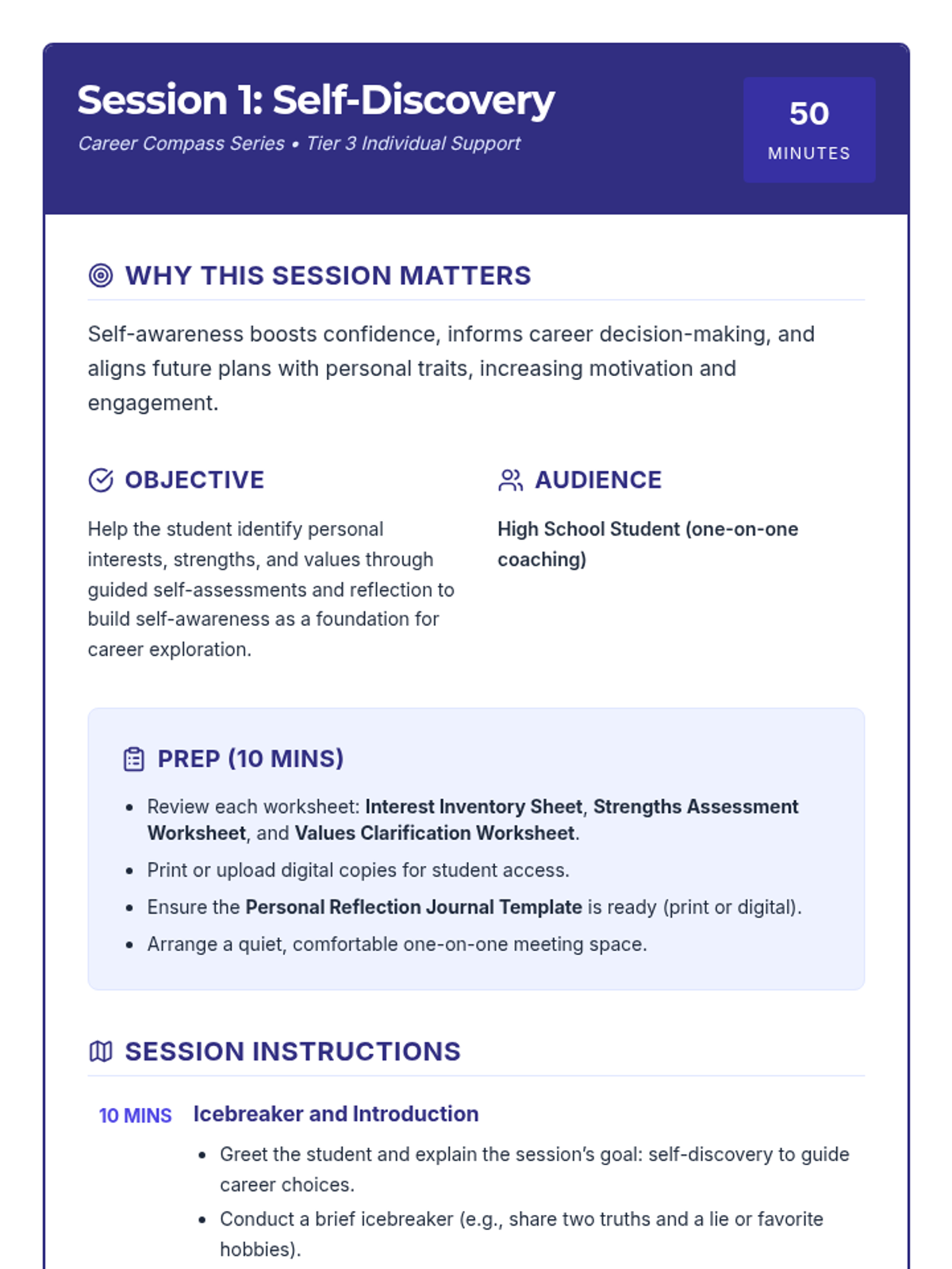 A four-session personalized coaching series designed to help students with low motivation and self-esteem explore career options and college types. Through guided activities, self-reflection, and research, students will build confidence in making informed decisions.