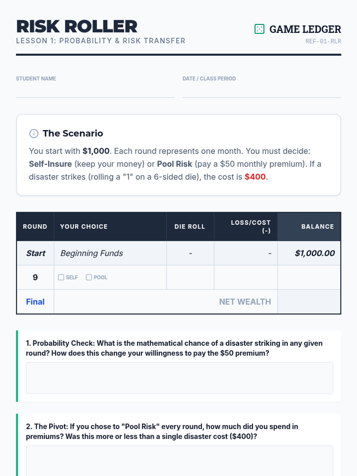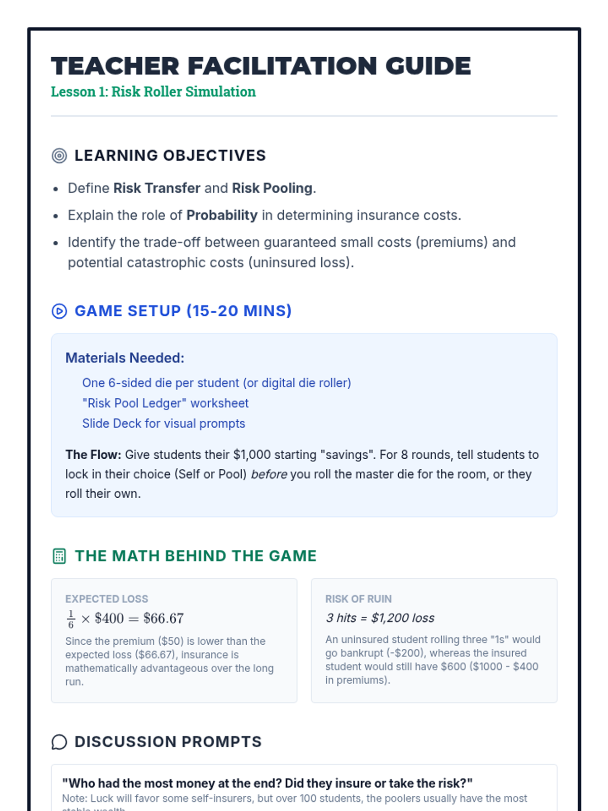 A comprehensive 10th-grade financial literacy unit on insurance. Students explore risk pooling through games, master the inverse relationship between premiums and deductibles, and apply mathematical reasoning to calculate total out-of-pocket costs across various life scenarios.