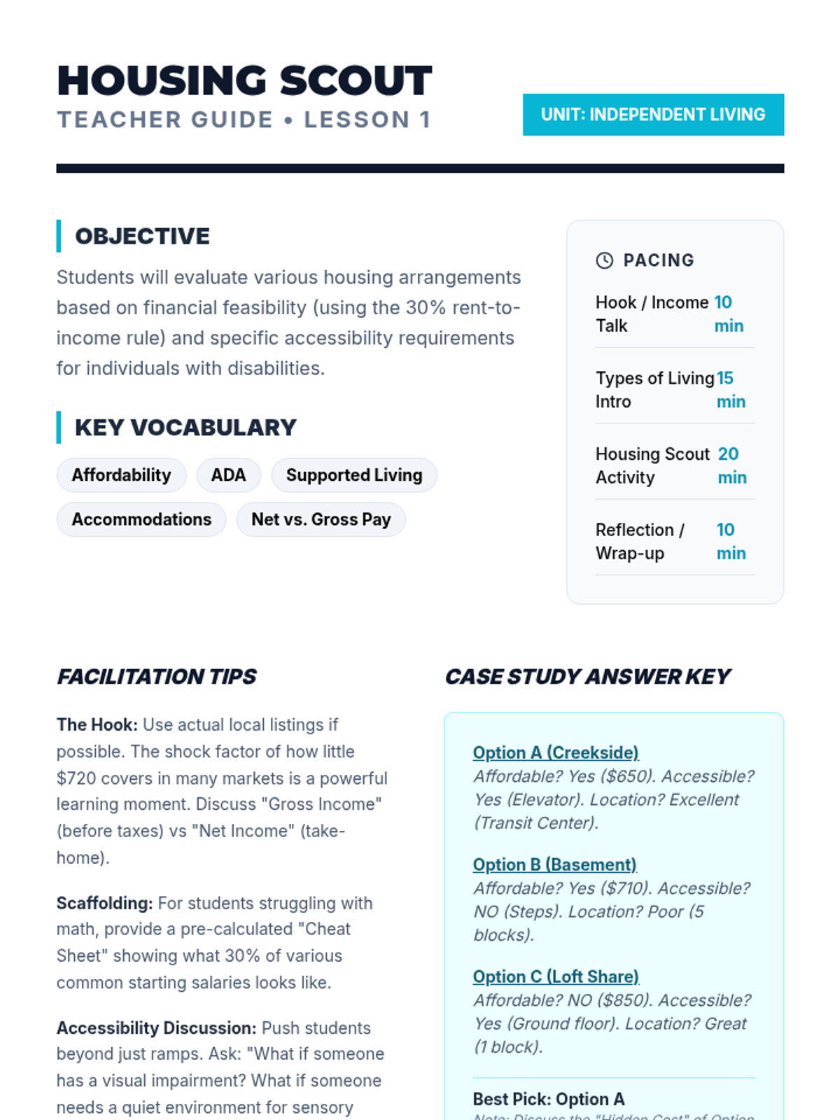 A 6-week curriculum designed to bridge the gap between high school math and real-world financial and practical independence, covering paychecks, budgeting, credit, shopping, housing, and measurement.