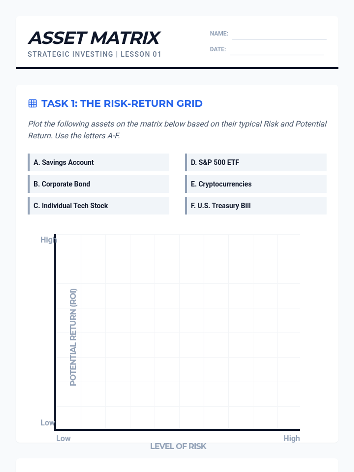 A comprehensive financial literacy sequence for 10th graders focused on asset allocation, risk management, and long-term investment planning. Students progress from understanding personal risk to designing complex portfolios and tax-advantaged strategies.