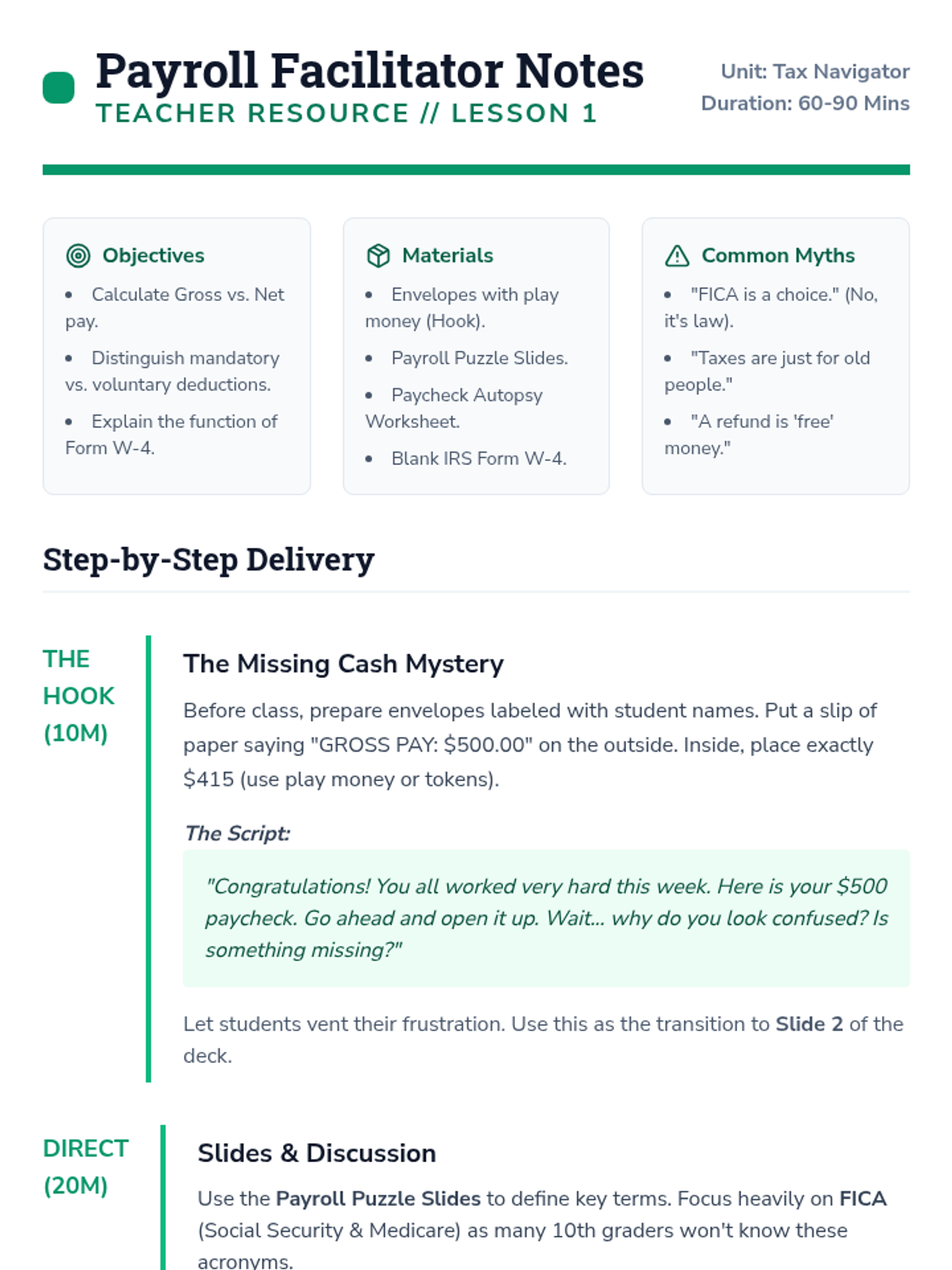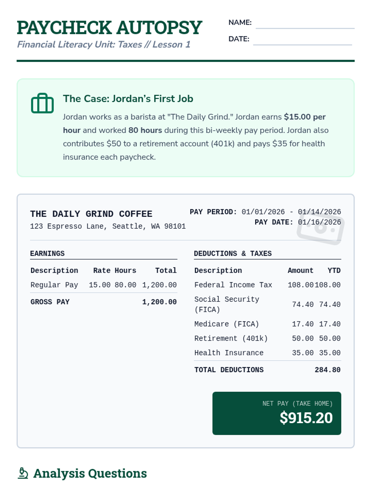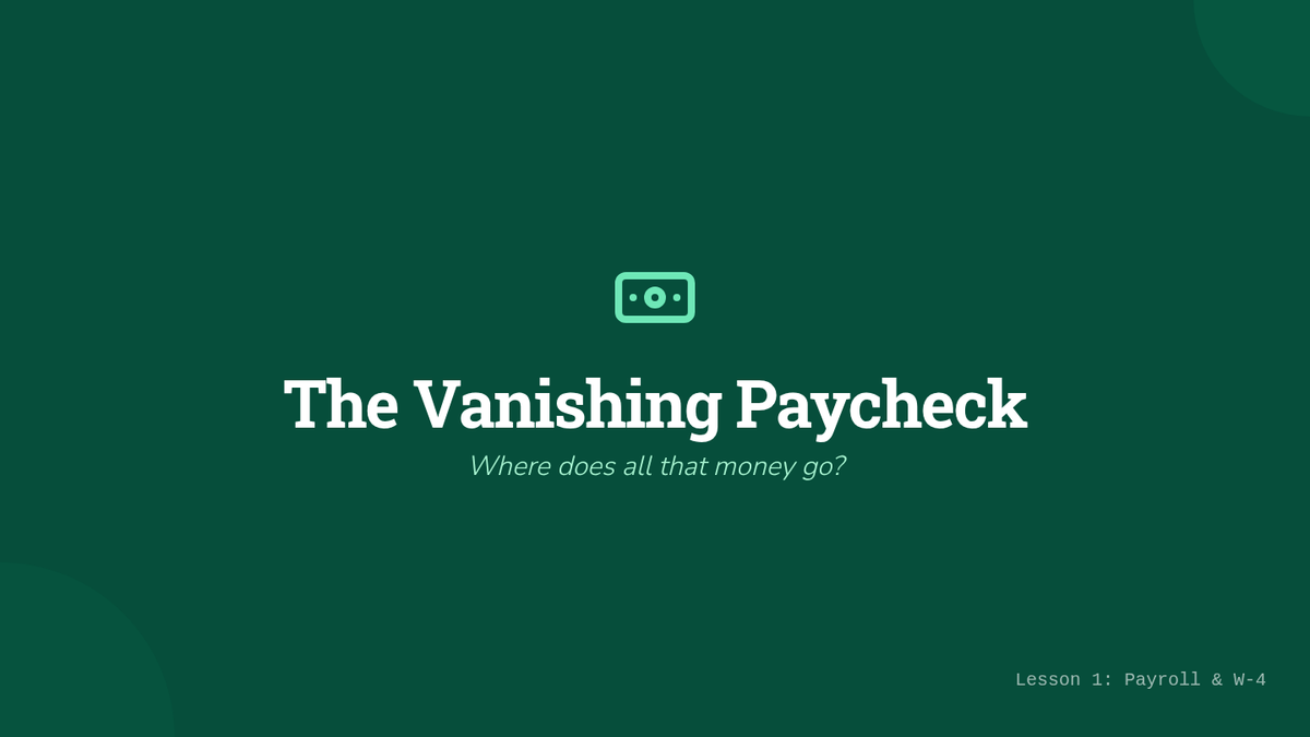 This sequence introduces 9th-grade students to the mechanics of payroll taxes, the distinction between gross and net income, and the practical skills needed to navigate employment documentation like pay stubs and W-4 forms. Students will learn to calculate withholdings, decode tax acronyms, and audit paychecks for accuracy.