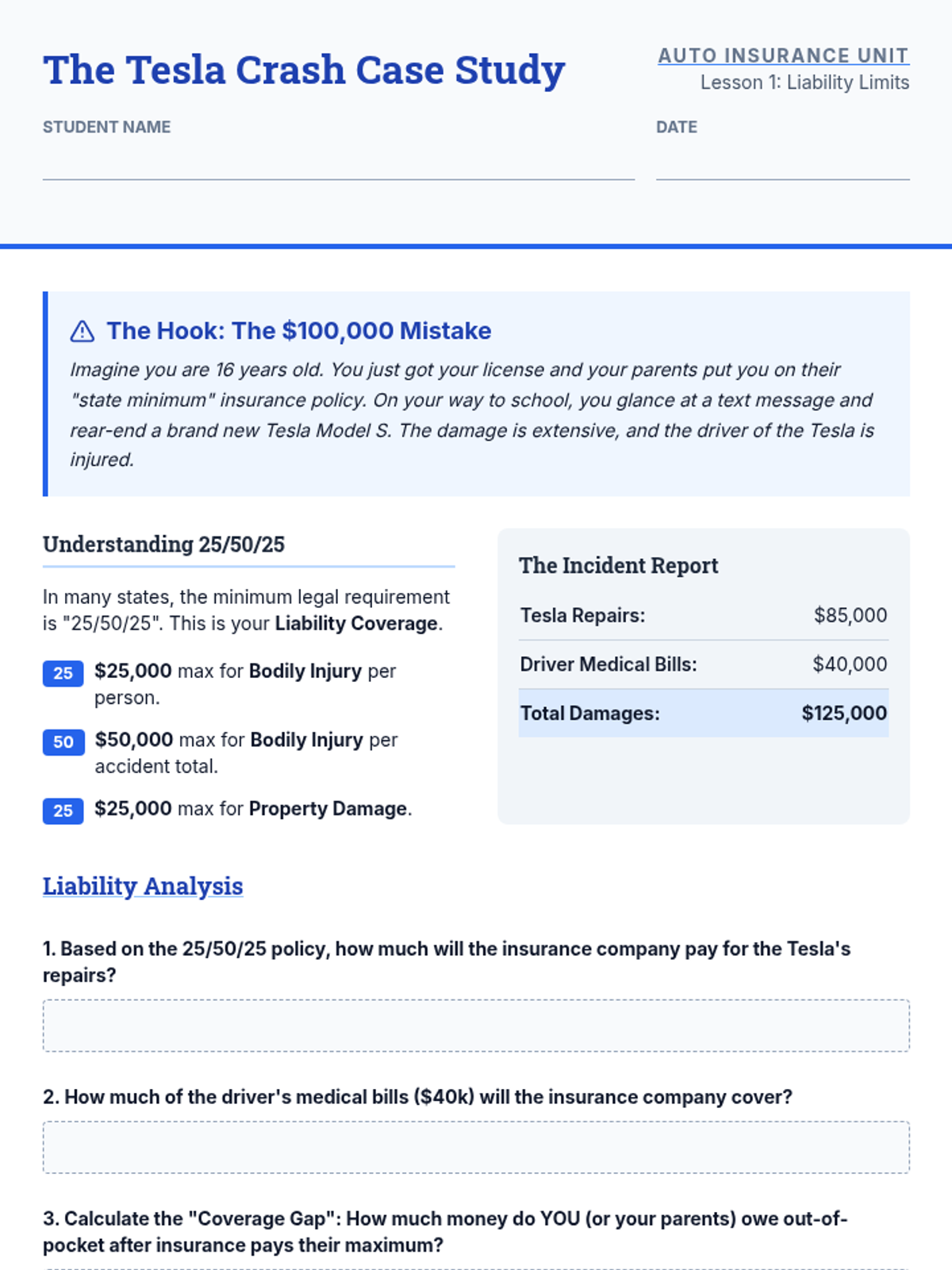 A comprehensive unit for 10th graders on auto insurance, covering liability limits, optional coverages, rate factors, policy reading, and quote comparison through real-world case studies and simulations.
