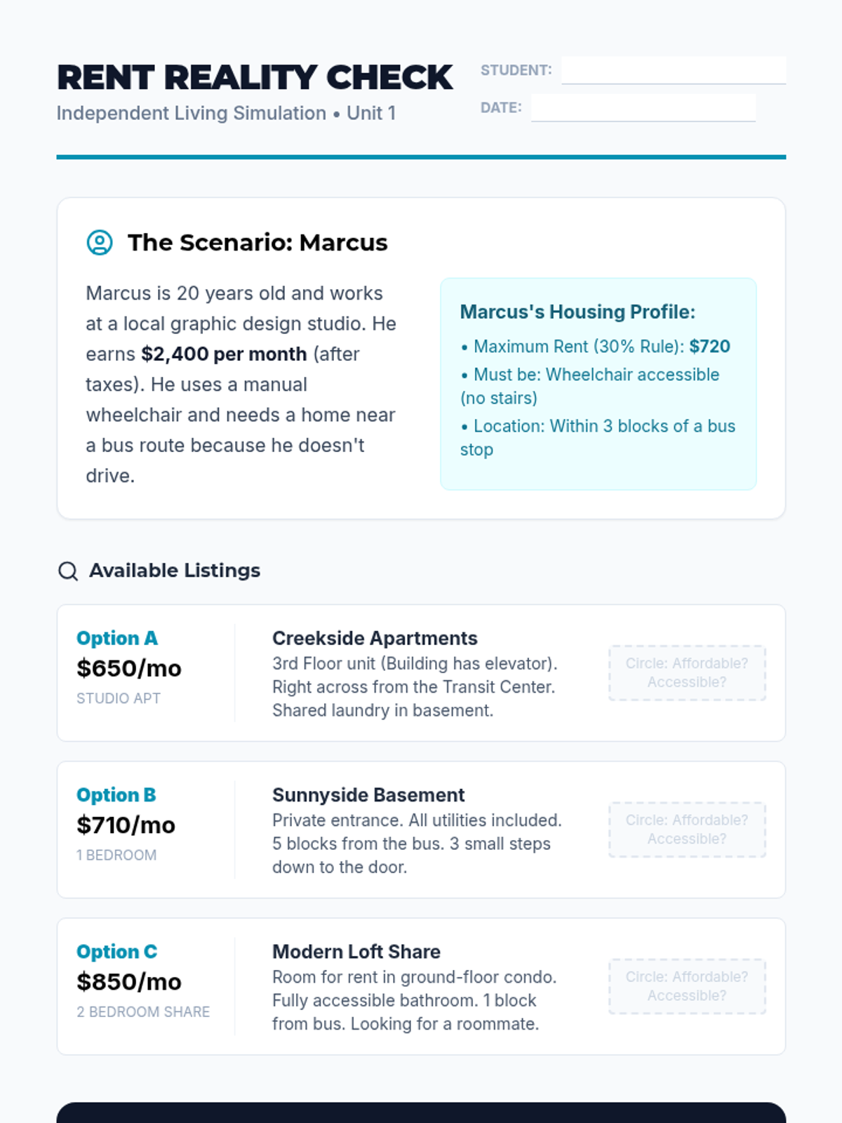 This simulation-based sequence helps students develop the financial and logistical skills necessary for independent living. Students move through a 'Real World' simulation where they must secure housing, manage a monthly budget, and plan for daily needs.