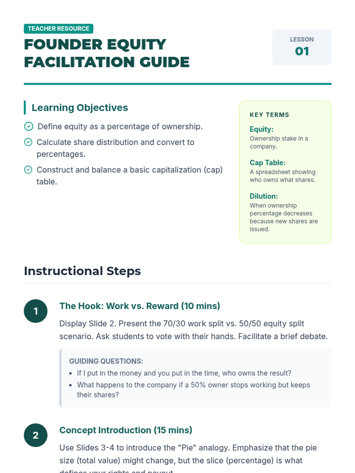 This sequence explores the relationship between company ownership (equity) and financing. Students learn the mechanics of cap tables, valuation math, and negotiation strategies, preparing them to navigate the trade-offs between control and growth in a startup environment.