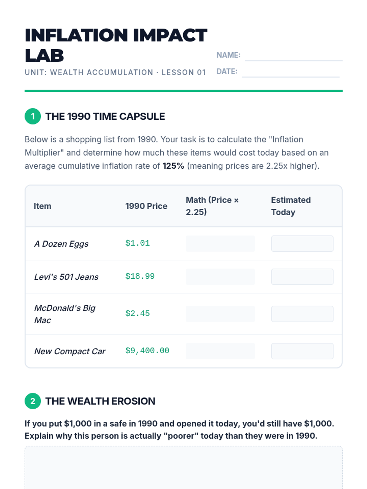 A comprehensive 9th-grade economics sequence focused on transitioning from basic savings to sophisticated investment strategies, asset allocation, and long-term wealth building. Students explore risk/reward, market volatility, and diversification through gamified activities and mathematical forecasting.