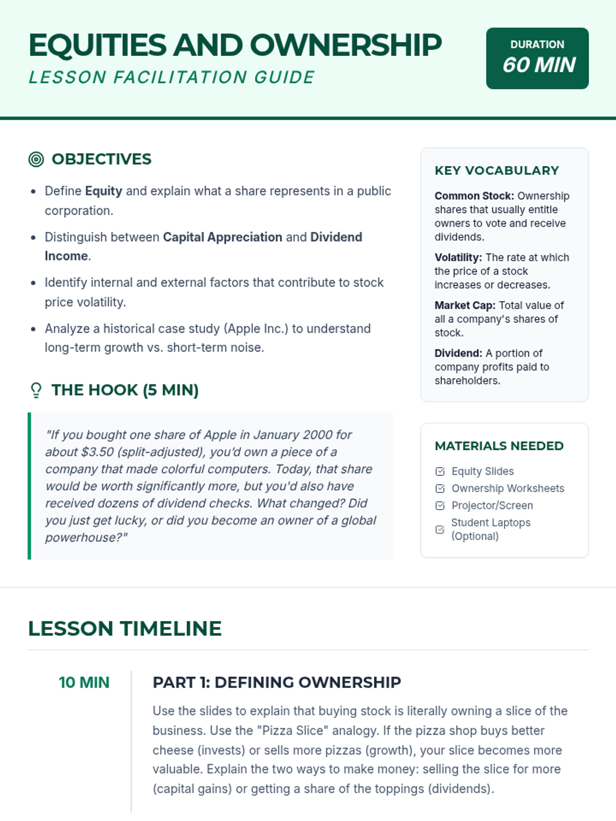 A comprehensive 10th-grade unit on the mechanics of investing, focusing on stocks, bonds, and mutual funds. Students move from basic ownership concepts to complex risk-return analysis through case studies and simulations.