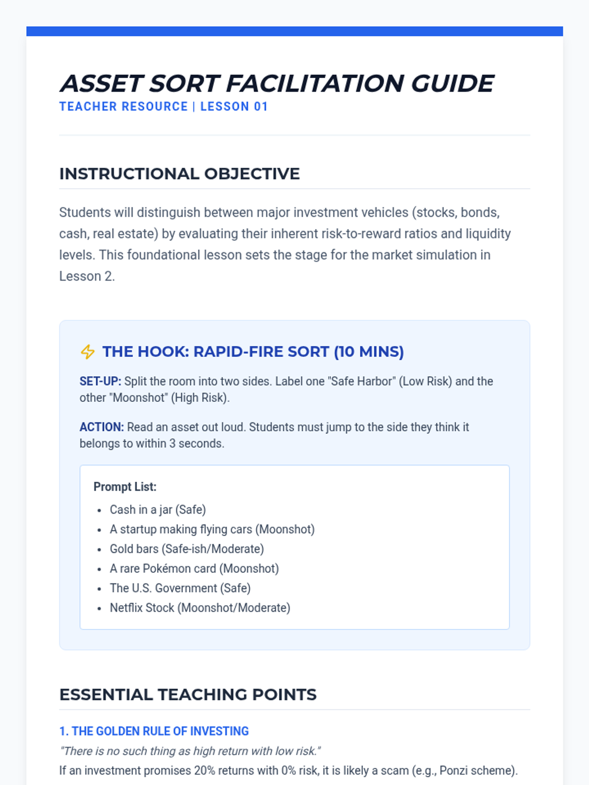 A comprehensive high school economics sequence that uses a gamified, simulation-based approach to teach the fundamentals of investing, market mechanics, and long-term wealth management. Students transition from understanding basic asset classes to building diversified portfolios and managing the psychological aspects of trading.