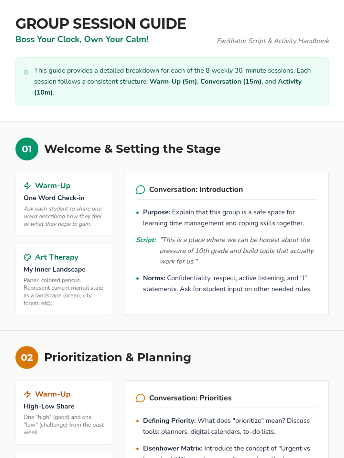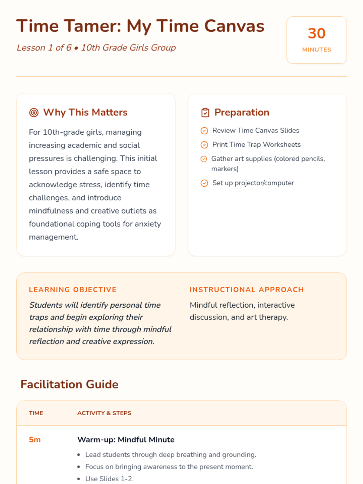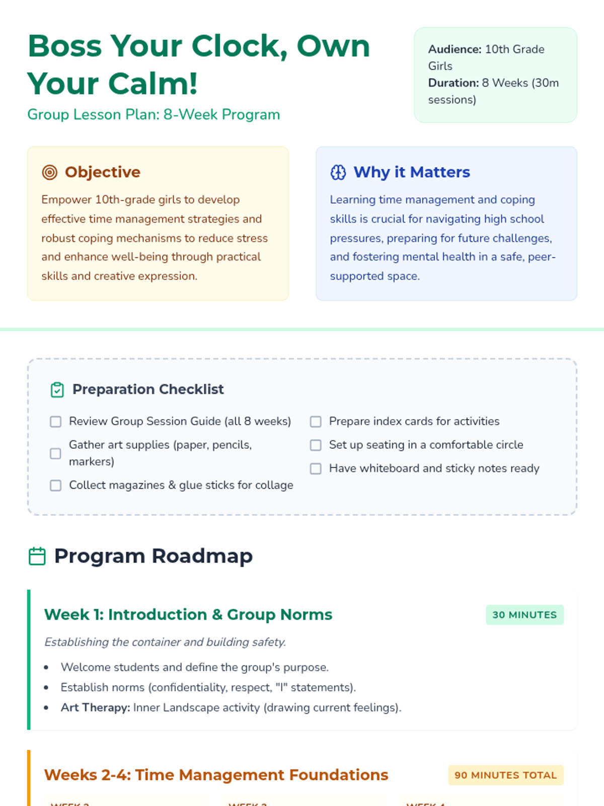 A six-session Tier 2 group intervention for 10th-grade girls focused on time management as a coping skill. Students move from self-awareness and art therapy to practical scheduling, distraction management, and resilience building.