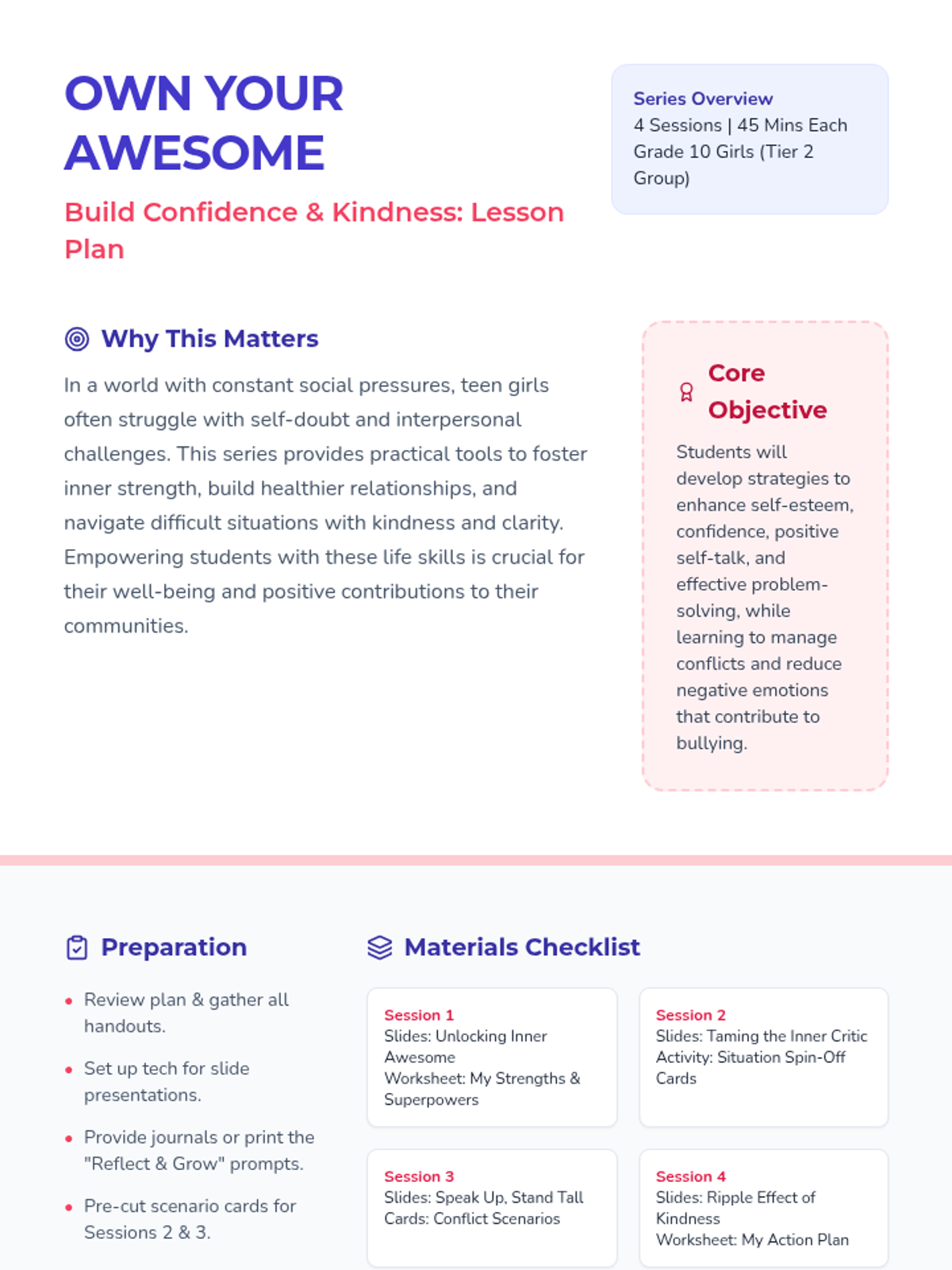 A 7-week support group curriculum for high school girls designed to build emotional resilience, self-esteem, and empowerment through discussion, worksheets, and creative crafts.