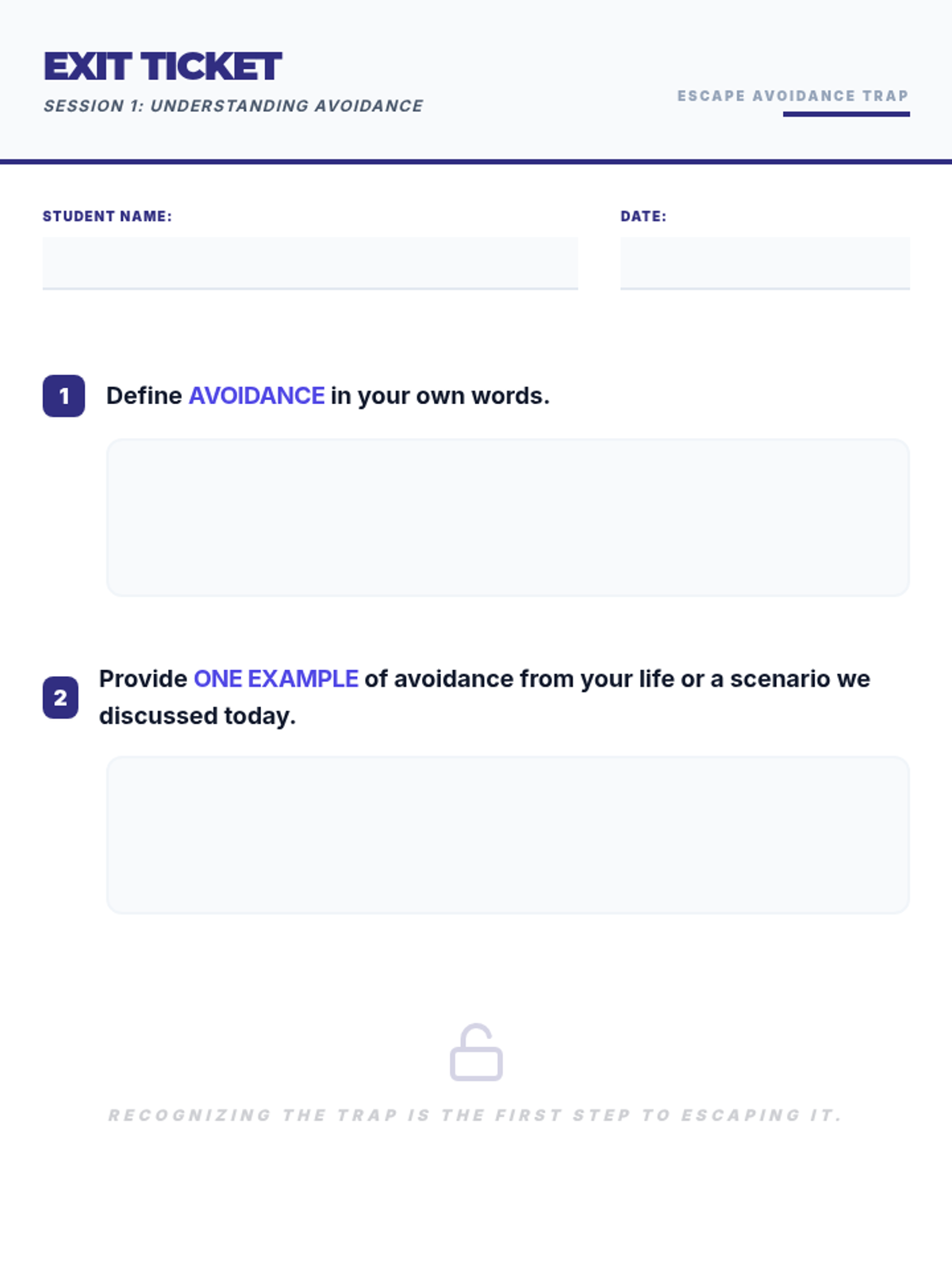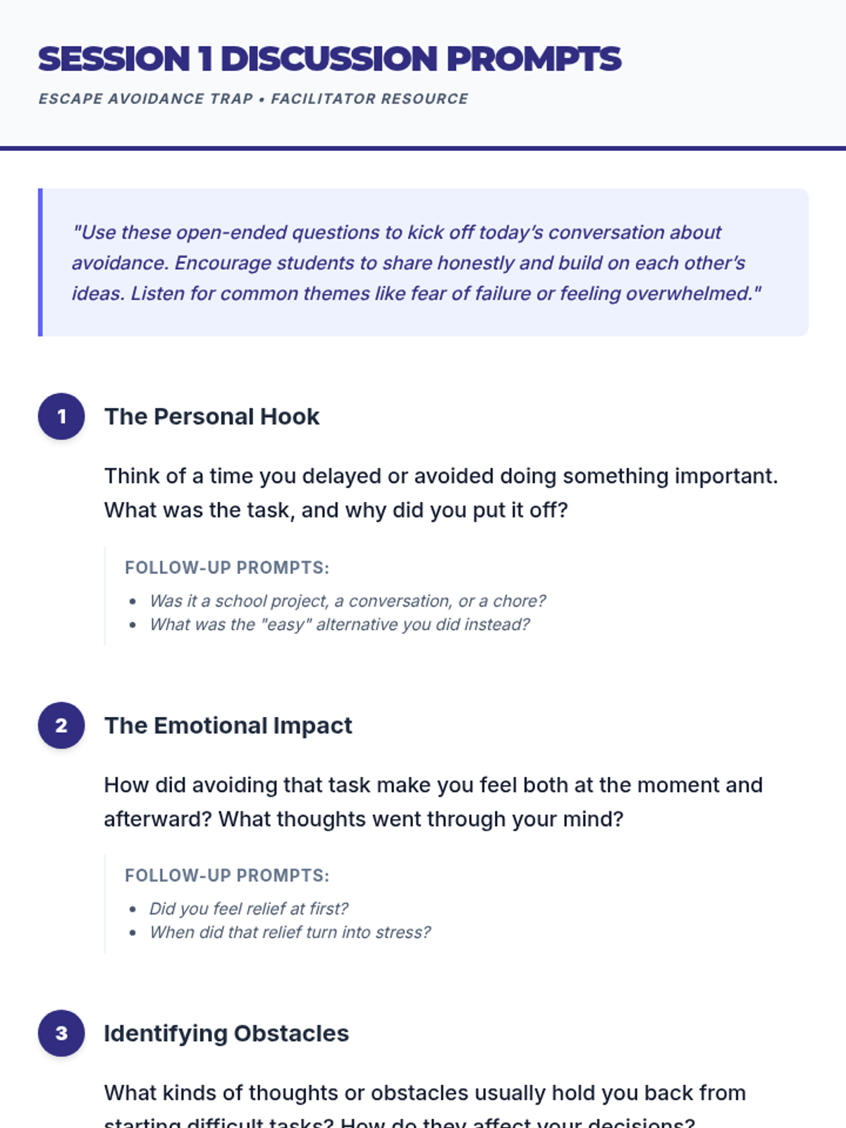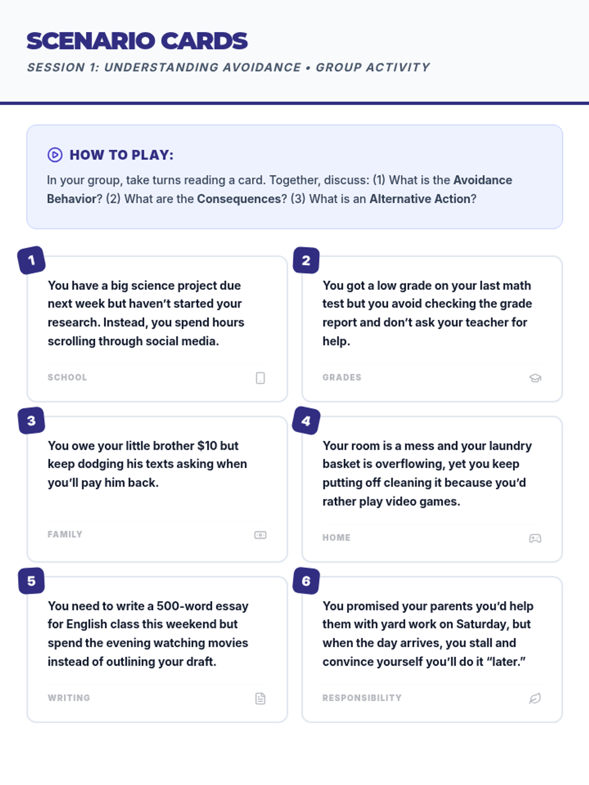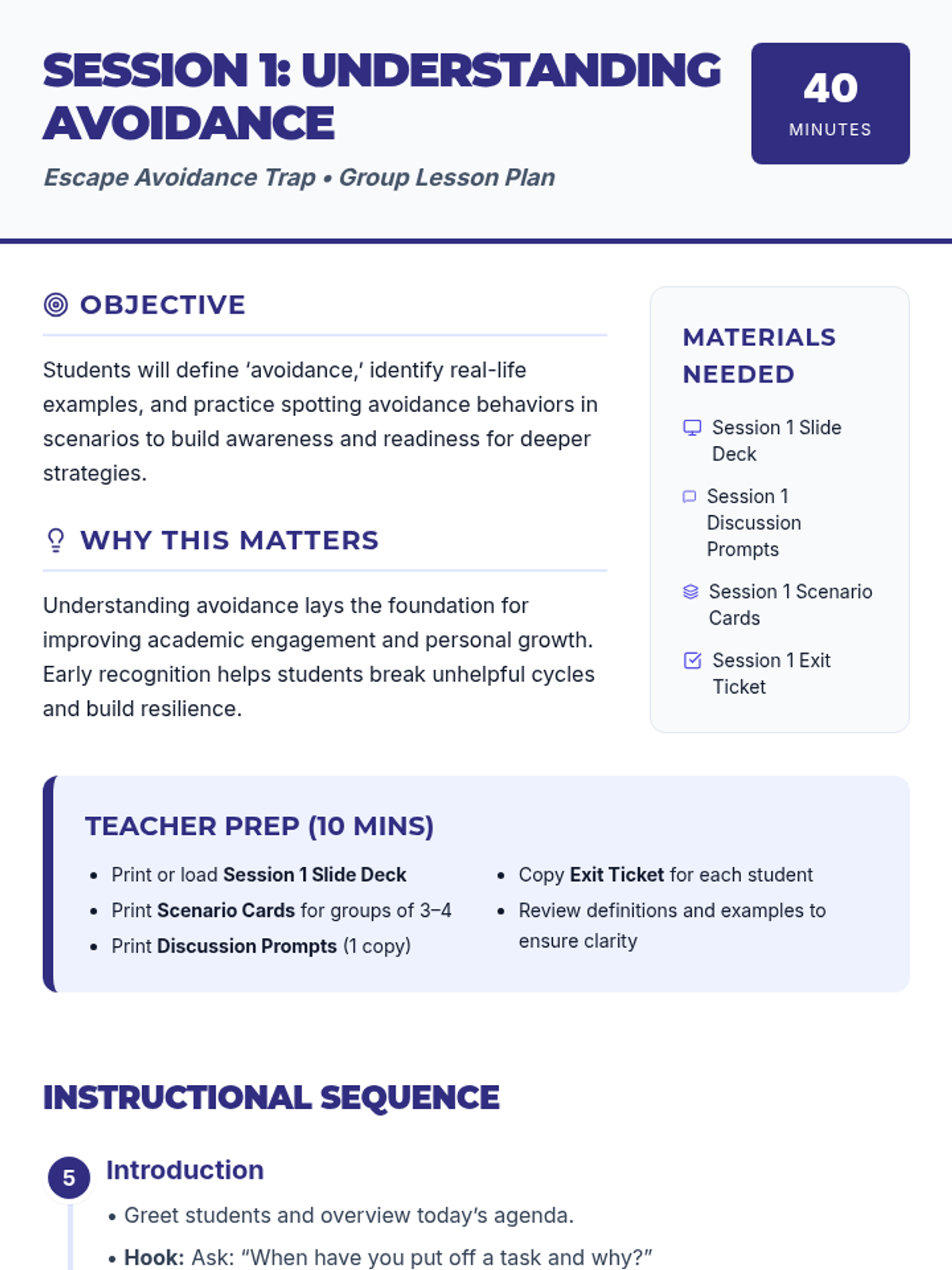 A 5-session group counseling intervention for 10th-grade males designed to identify avoidance patterns, manage emotional triggers, and develop practical strategies for academic and personal success.