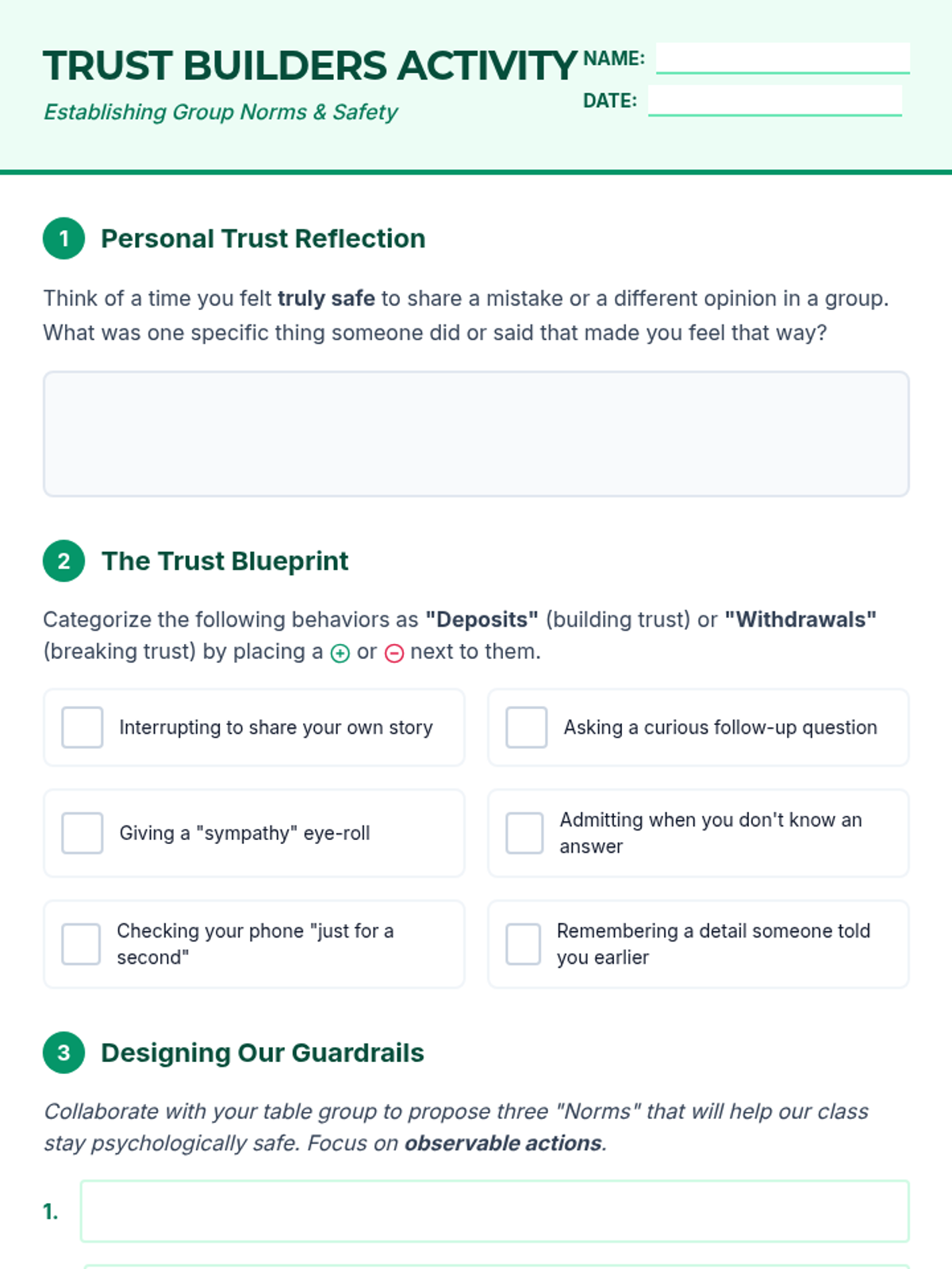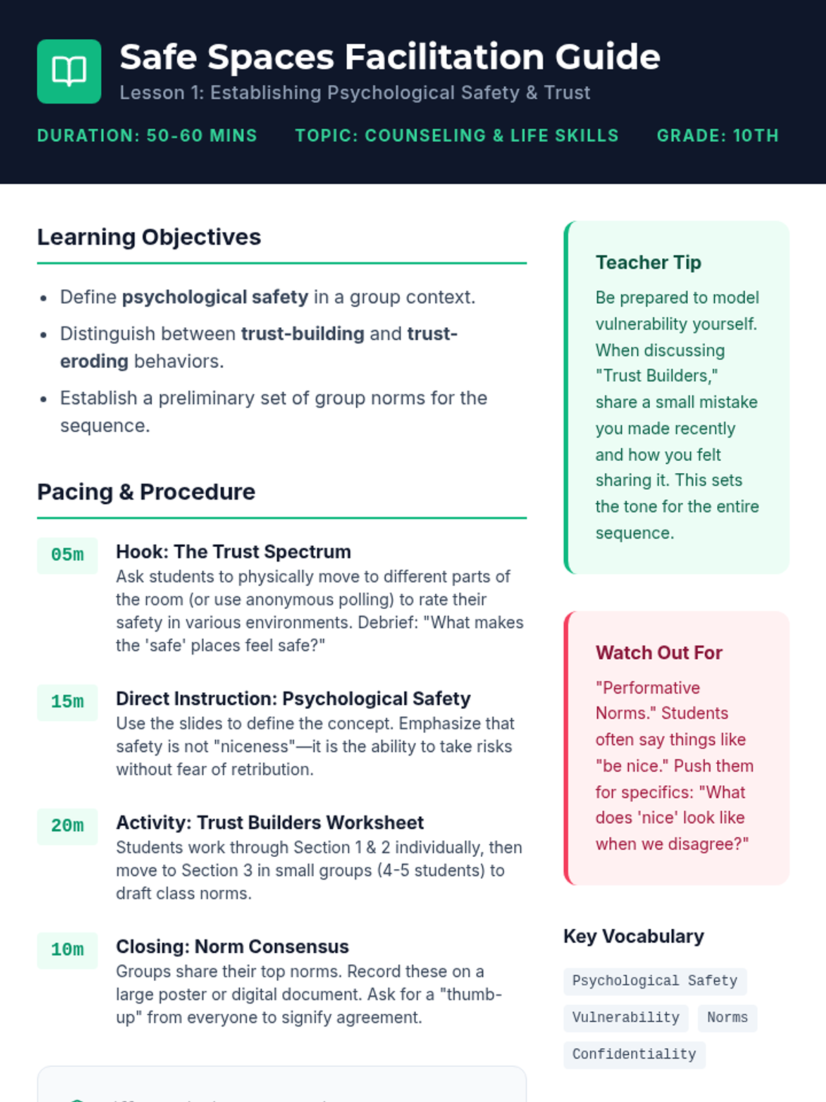 A comprehensive sequence for 10th-grade students focused on building psychological safety, mastering communication, cultivating empathy, and creating an inclusive group identity. Students move from defining trust to actively designing the culture of their own community.