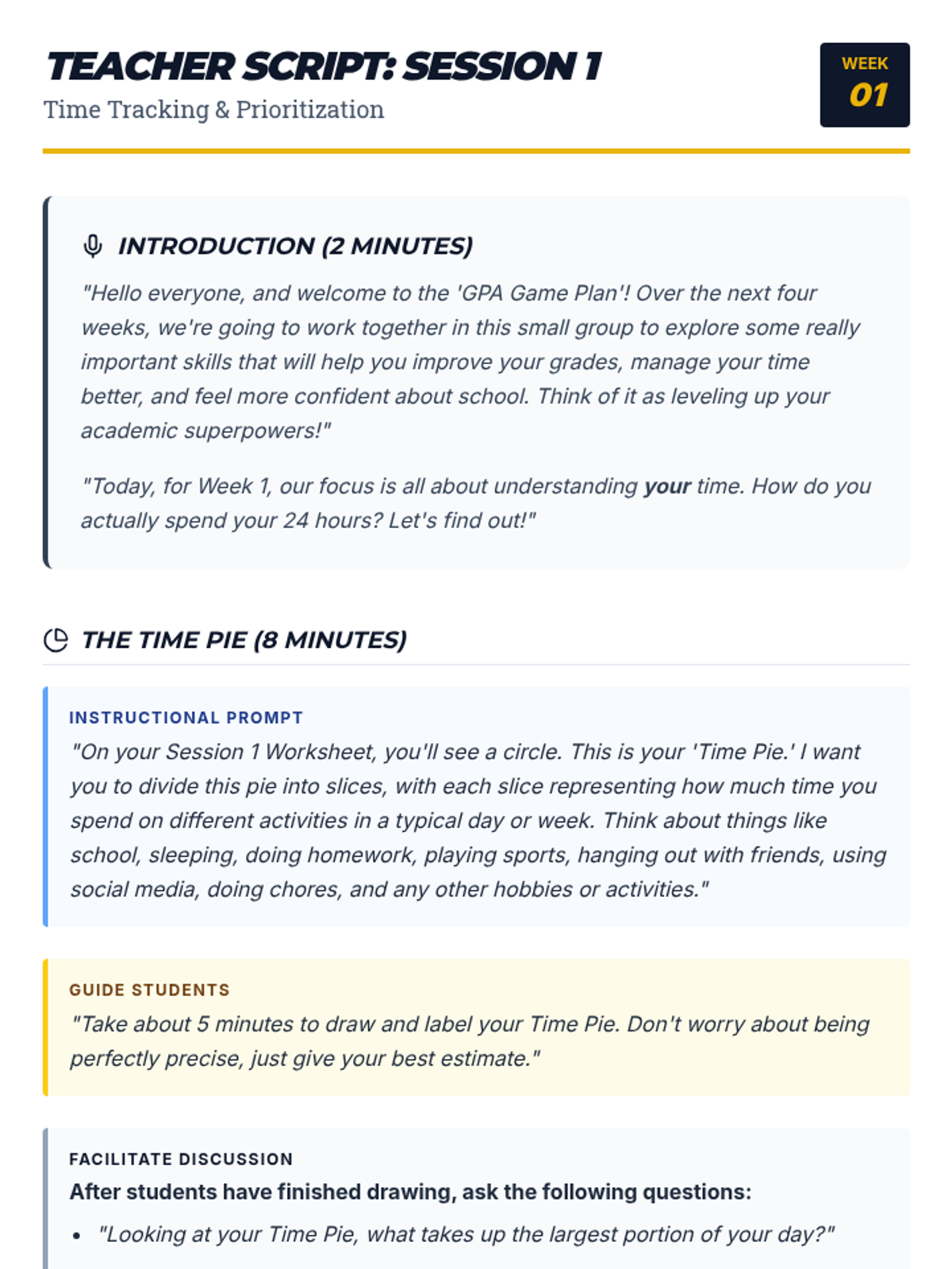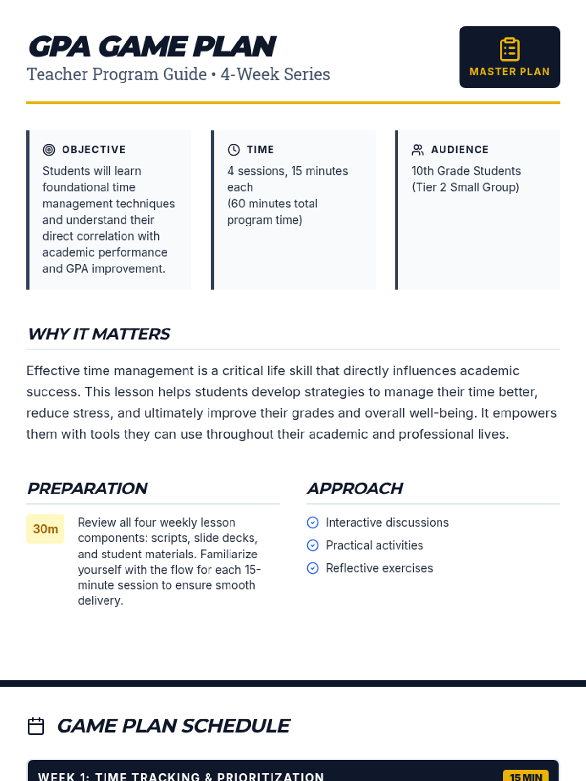 A 4-week small group program for 10th-grade students to master time management, study habits, and procrastination to boost their GPA.