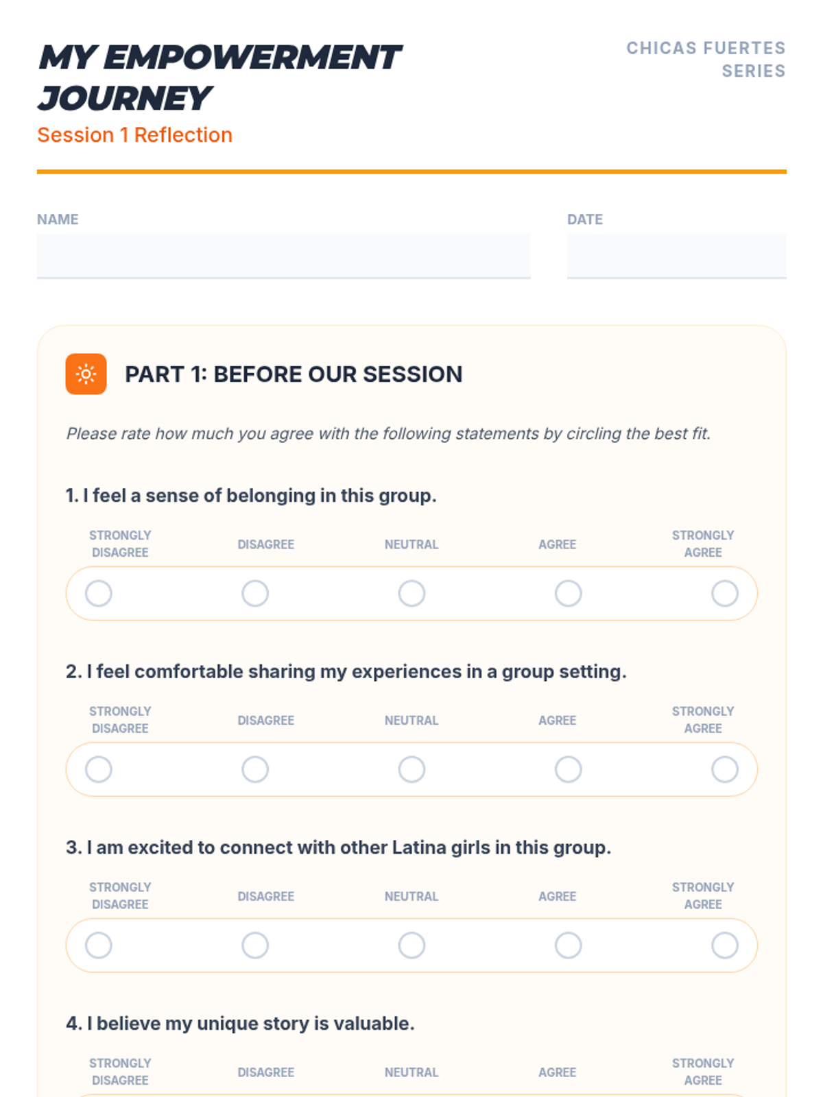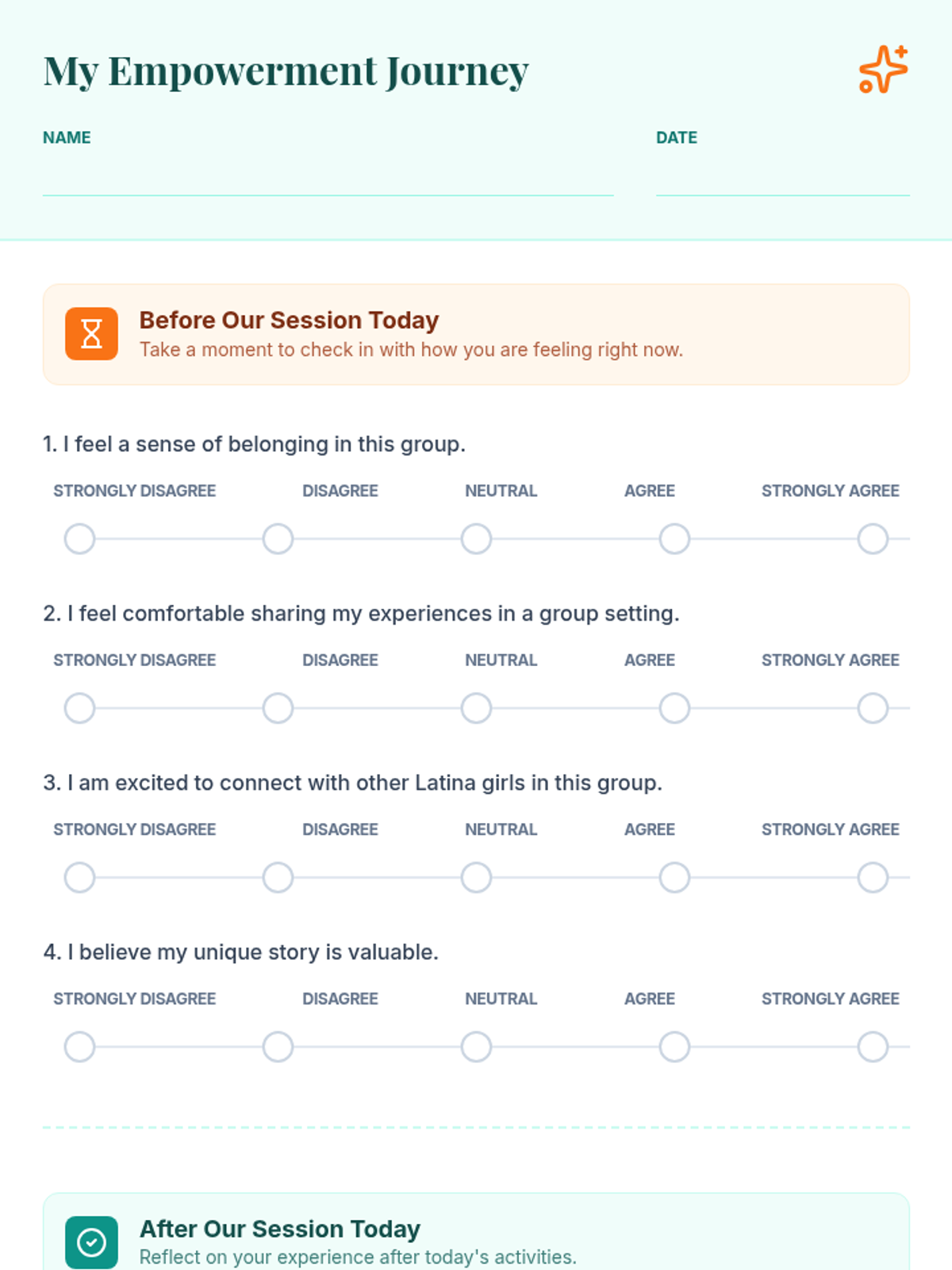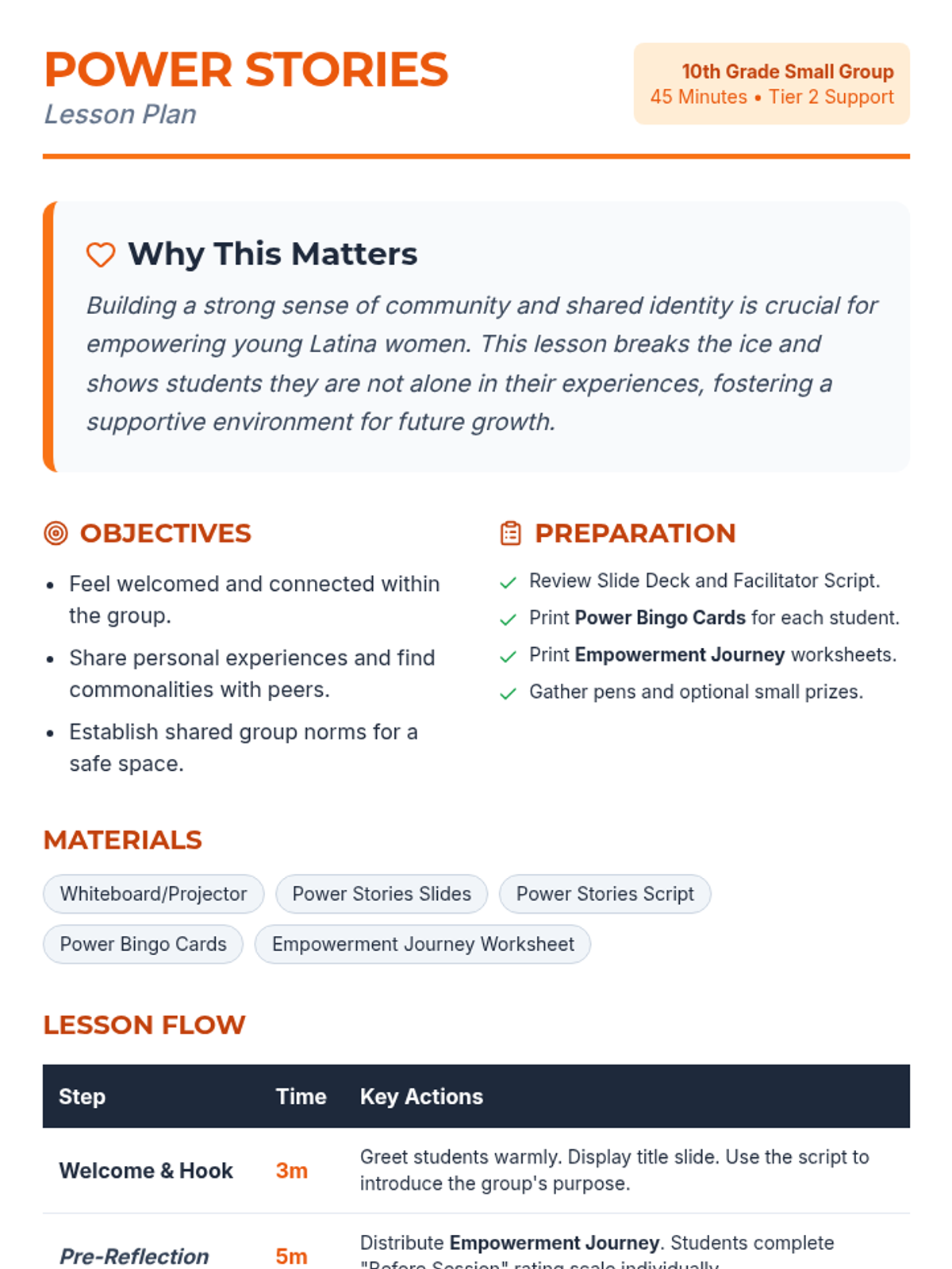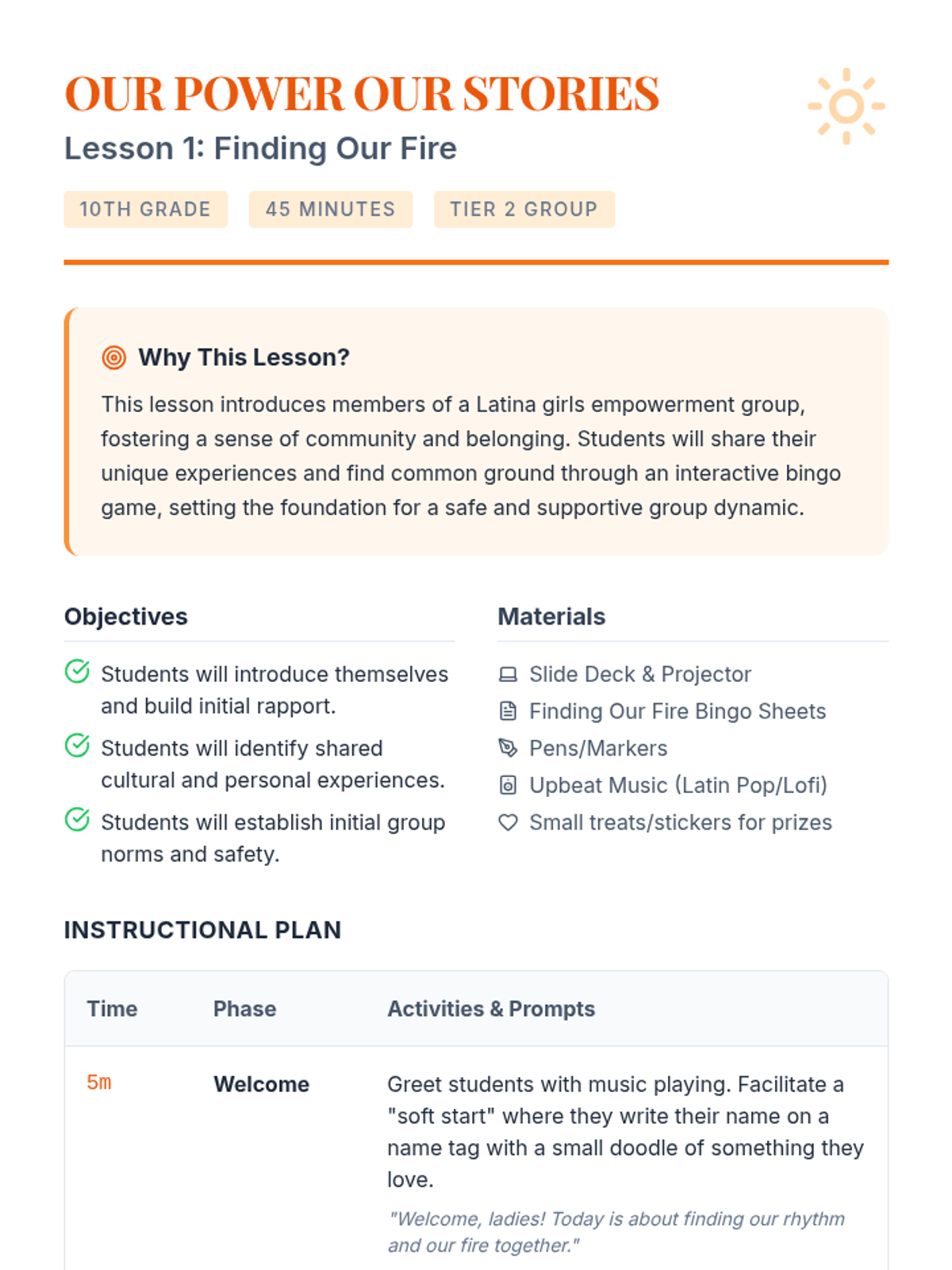 A two-session sequence designed for a 10th-grade Latina girls empowerment group, focusing on building community, sharing personal stories, and identifying individual strengths to foster a sense of belonging and collective power.