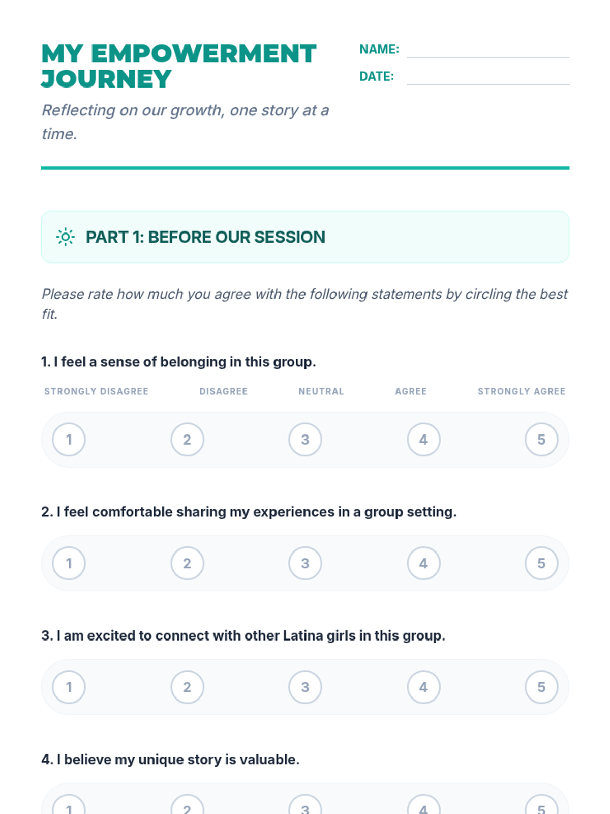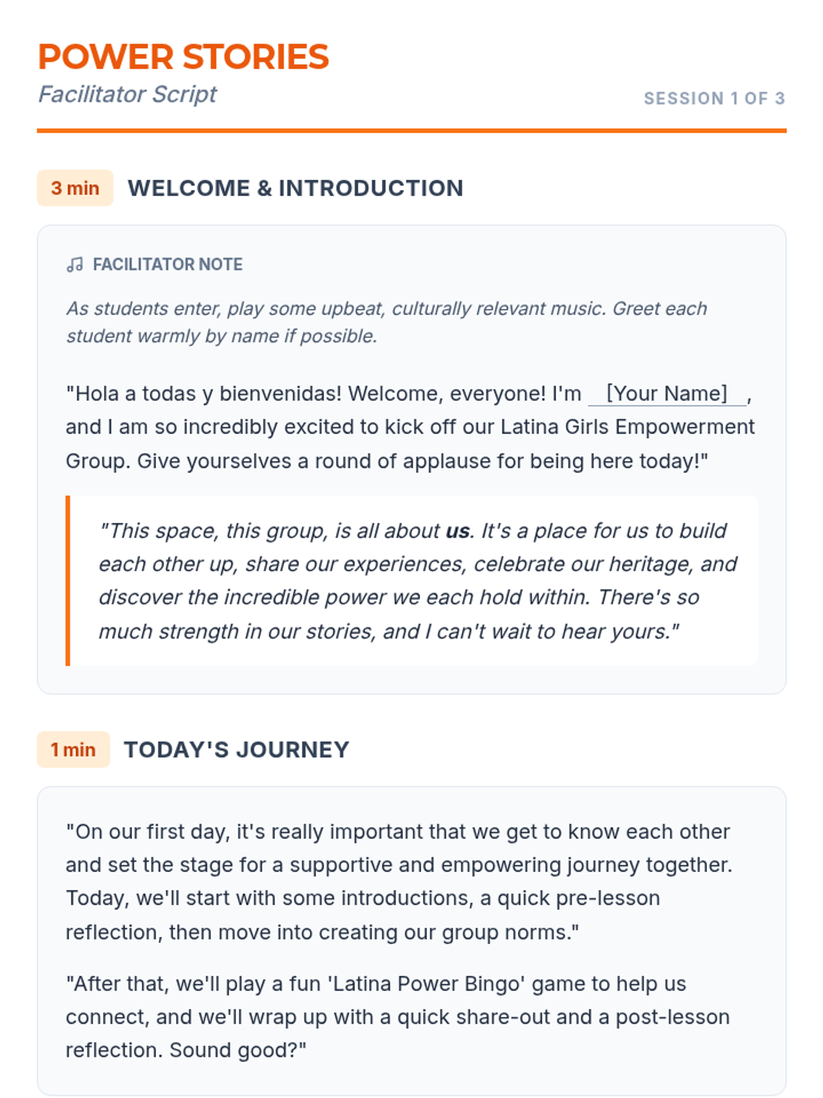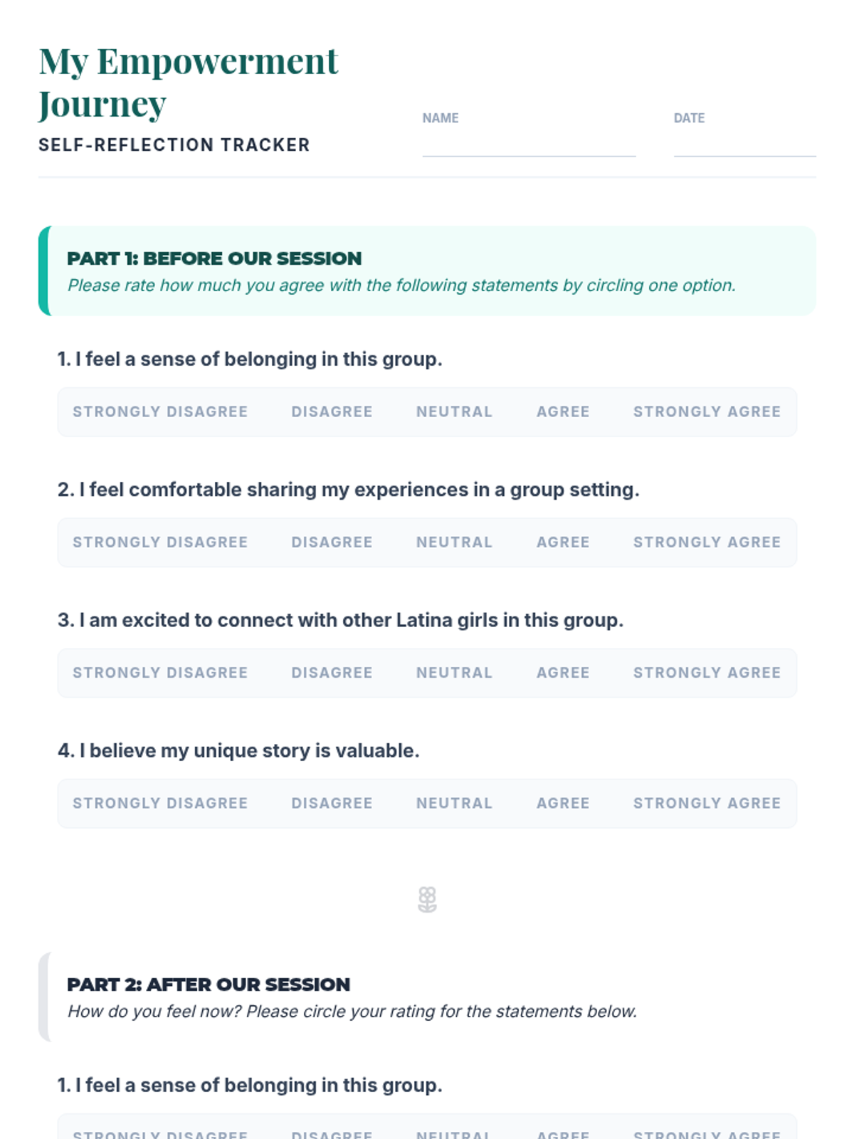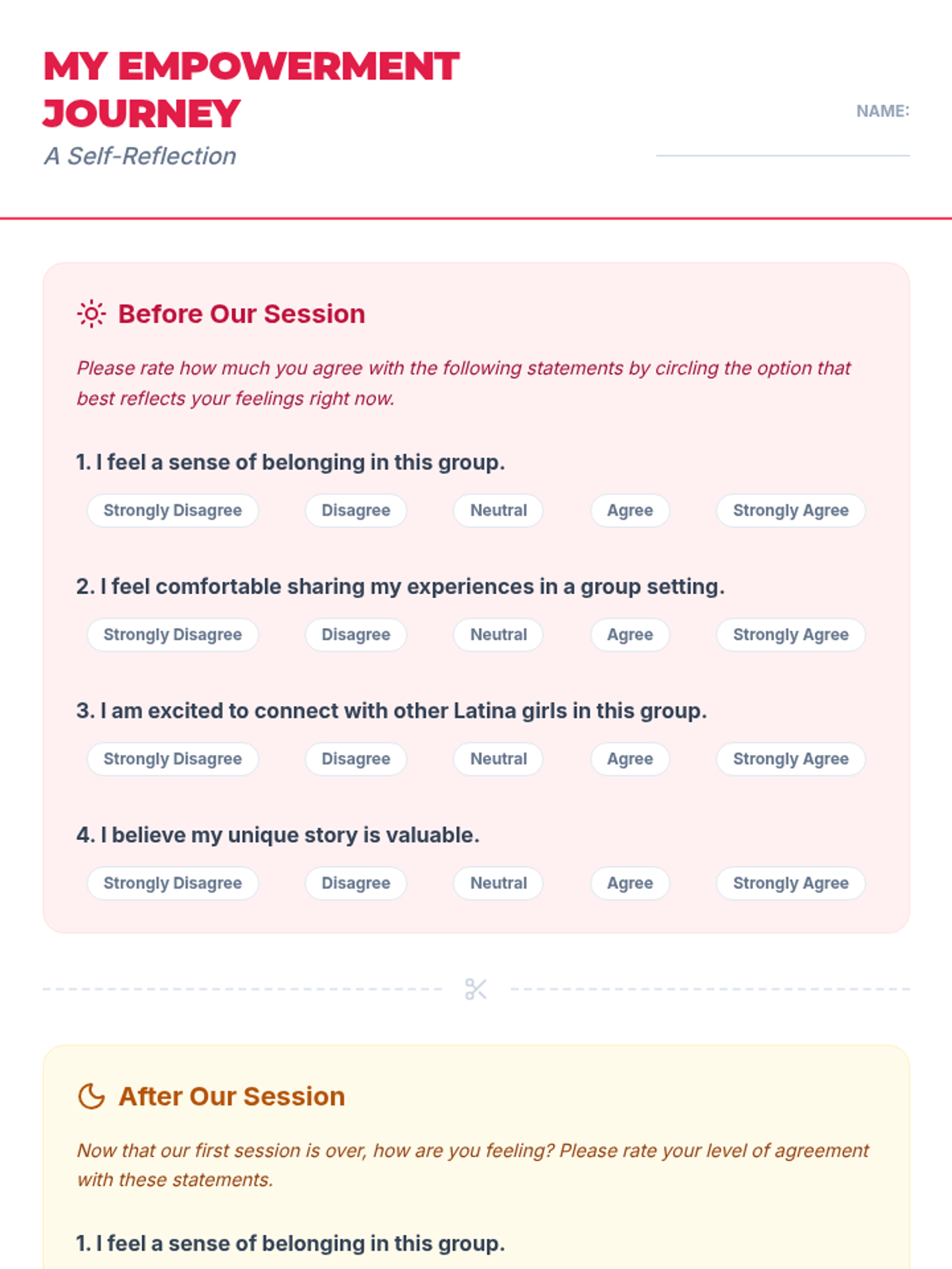 A two-session sequence designed for a 10th-grade Latina girls empowerment group, focusing on building community, sharing personal stories, and identifying individual strengths to foster a sense of belonging and collective power.