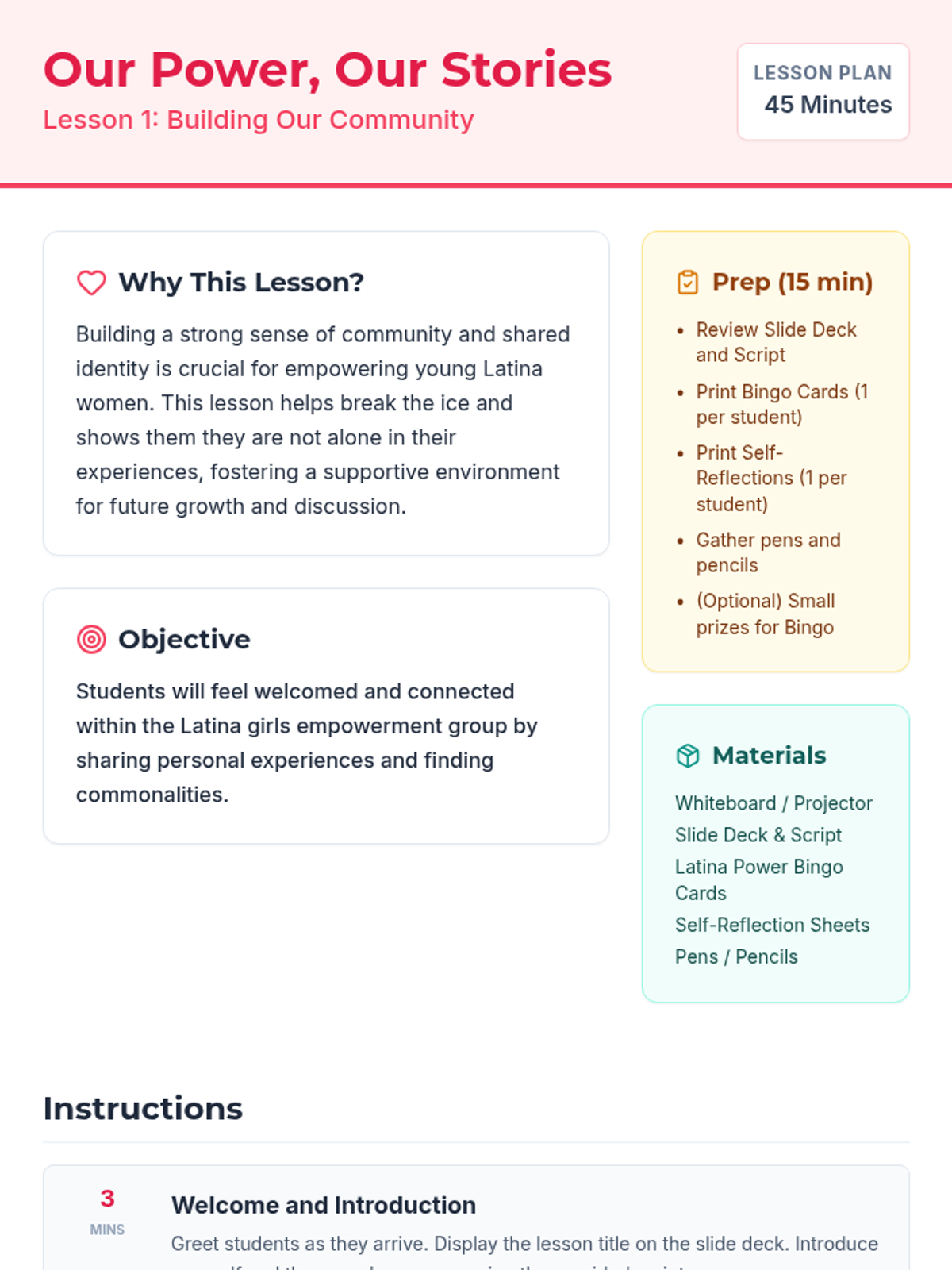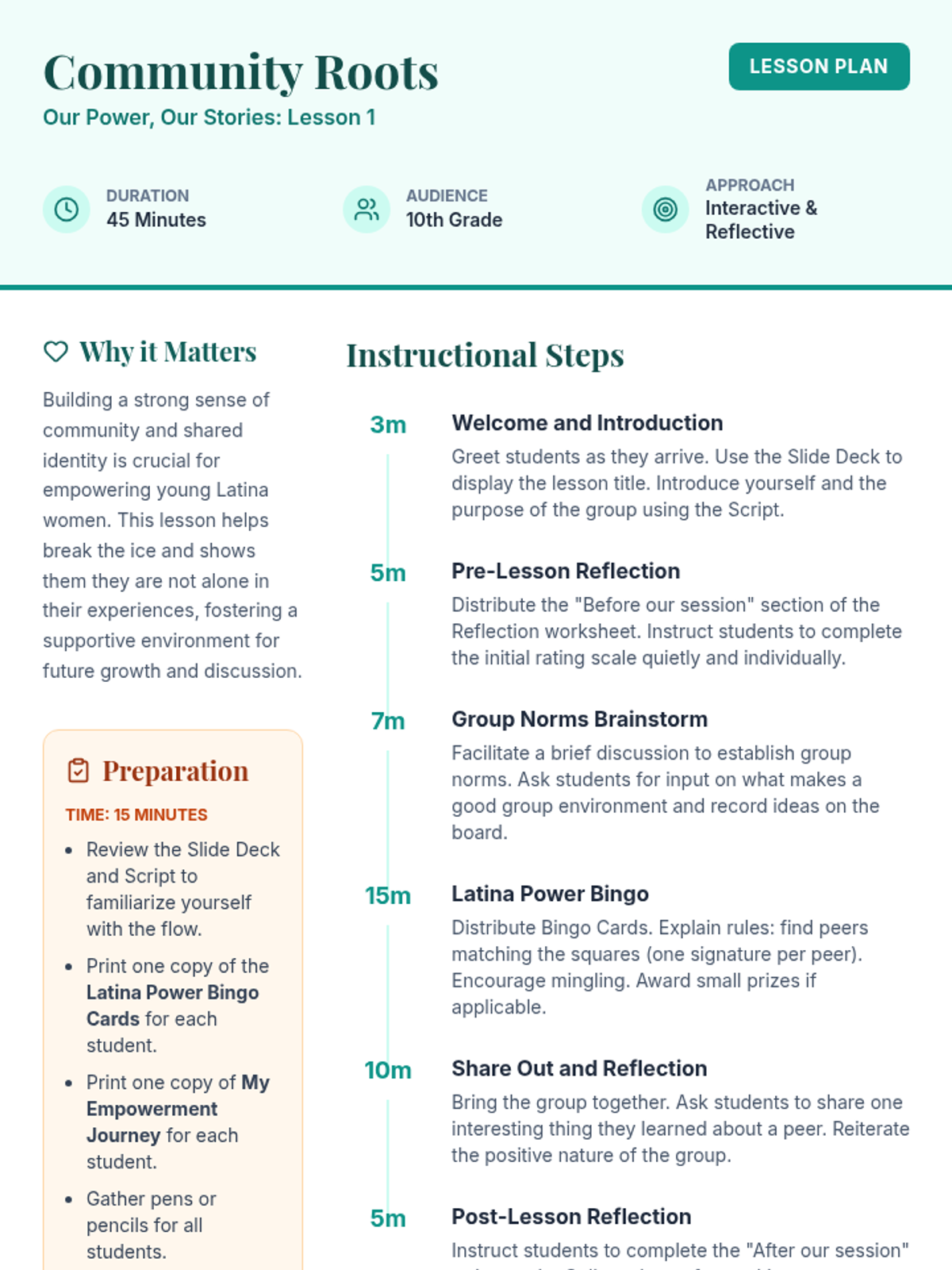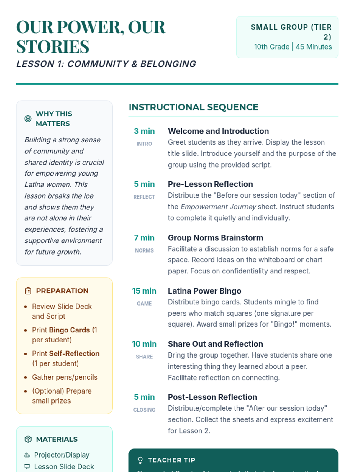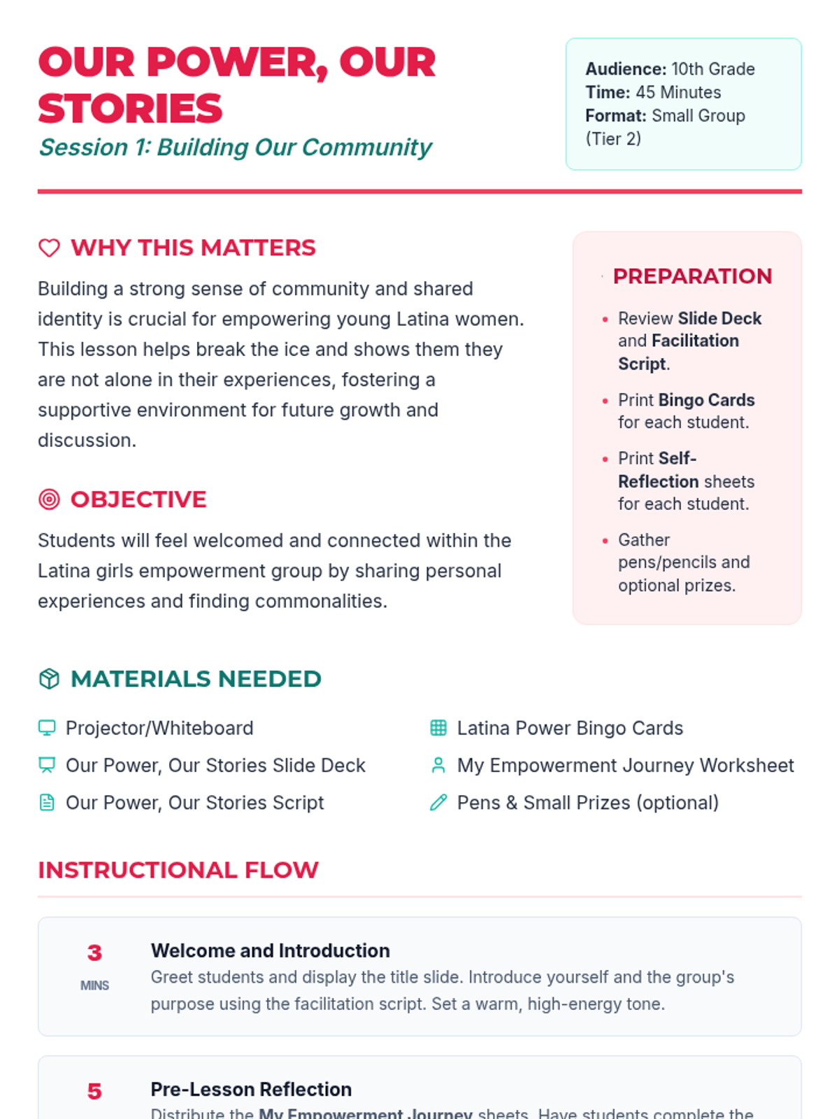 A three-session empowerment sequence for 10th-grade Latina students, focusing on community building, individual strengths, and collective social action. Students transition from personal discovery to creating tangible community impact.