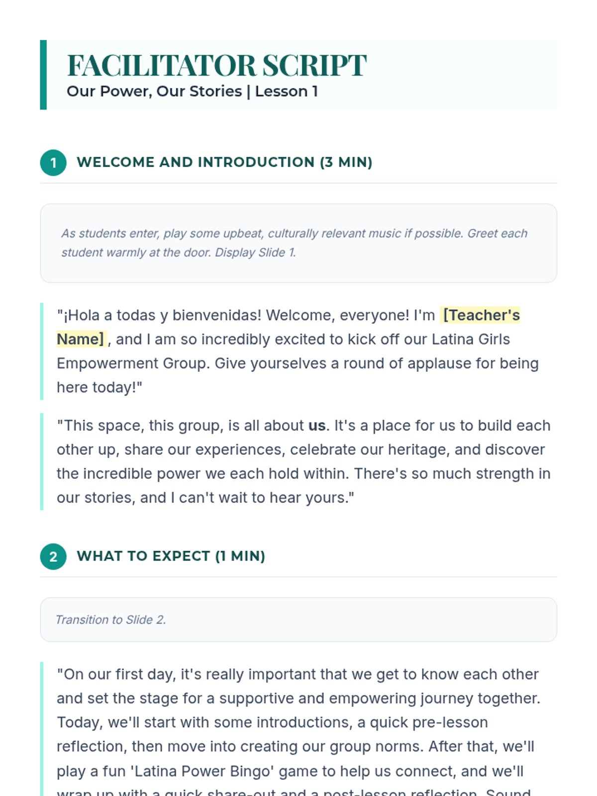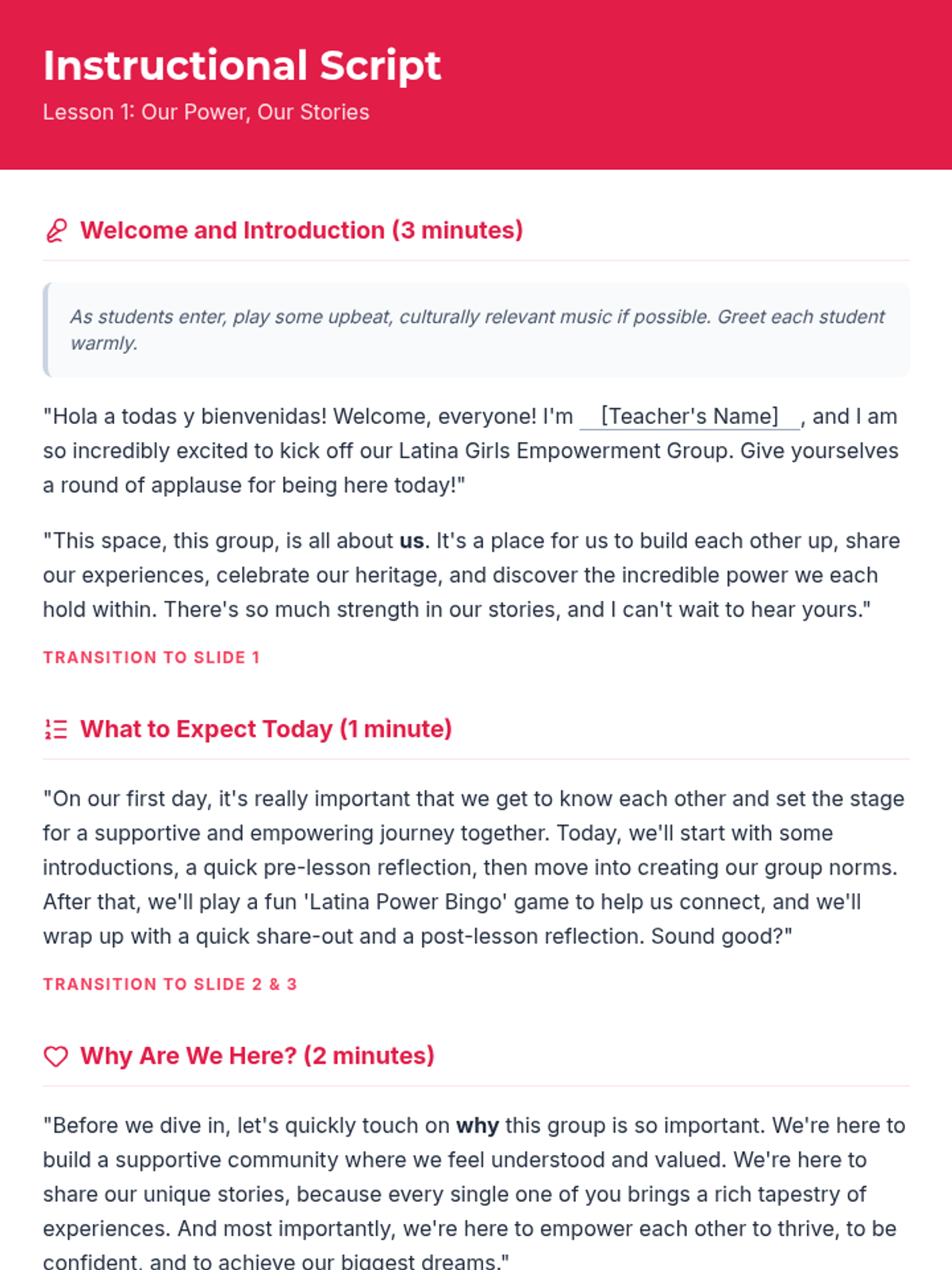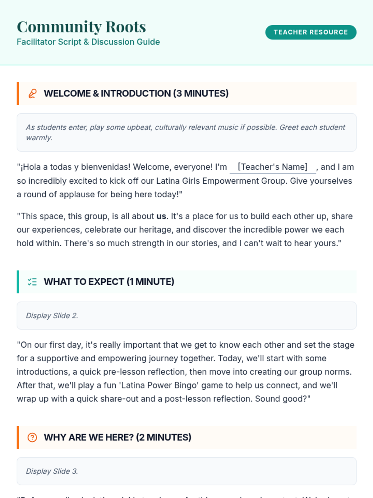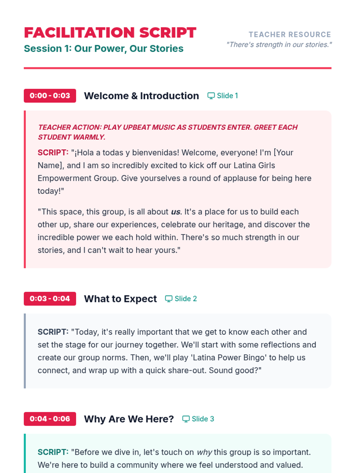 A three-session empowerment sequence for 10th-grade Latina students, focusing on community building, individual strengths, and collective social action. Students transition from personal discovery to creating tangible community impact.