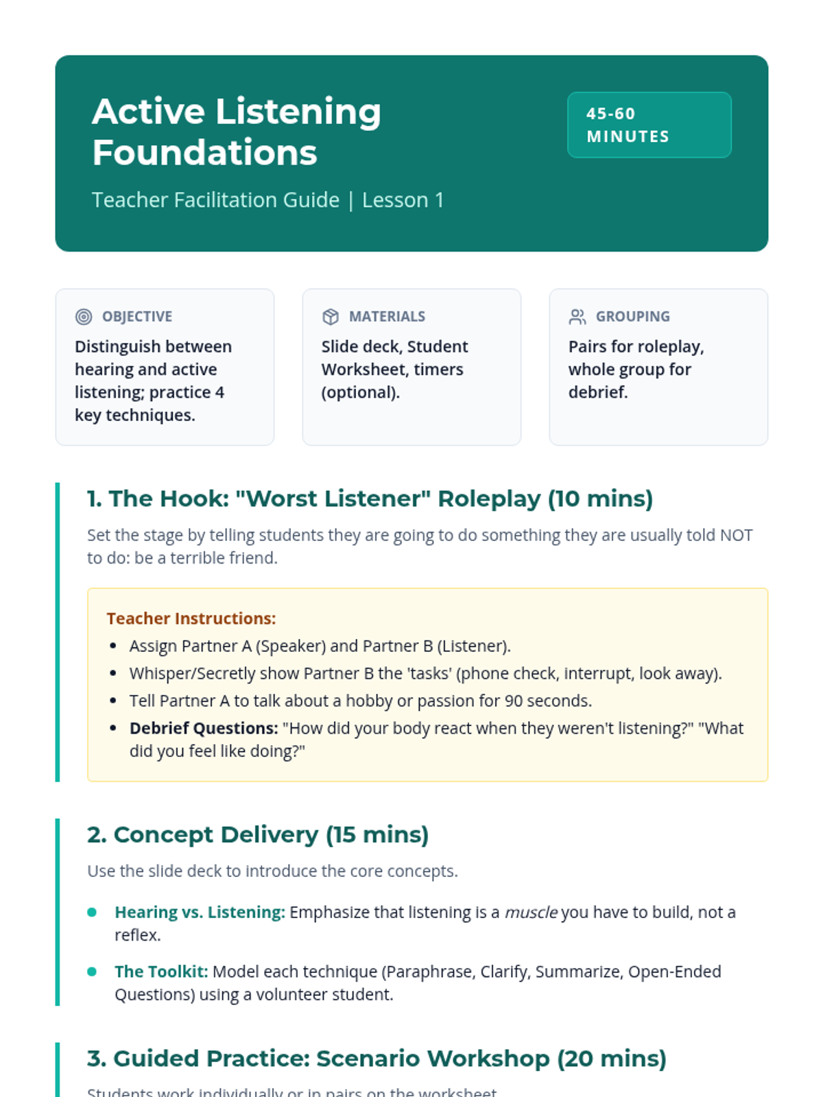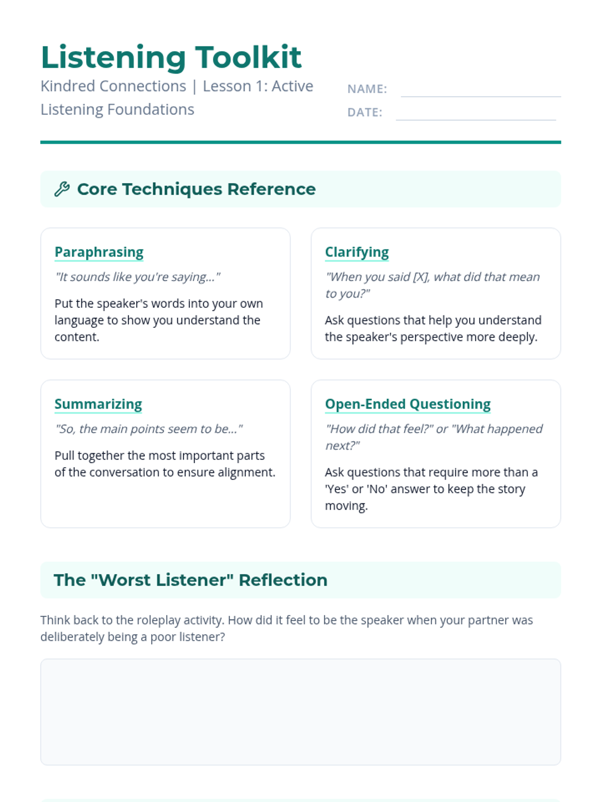 This sequence equips 10th-grade students with the interpersonal tools necessary to participate in and facilitate supportive peer groups, focusing on active listening, empathy, boundaries, and group dynamics.