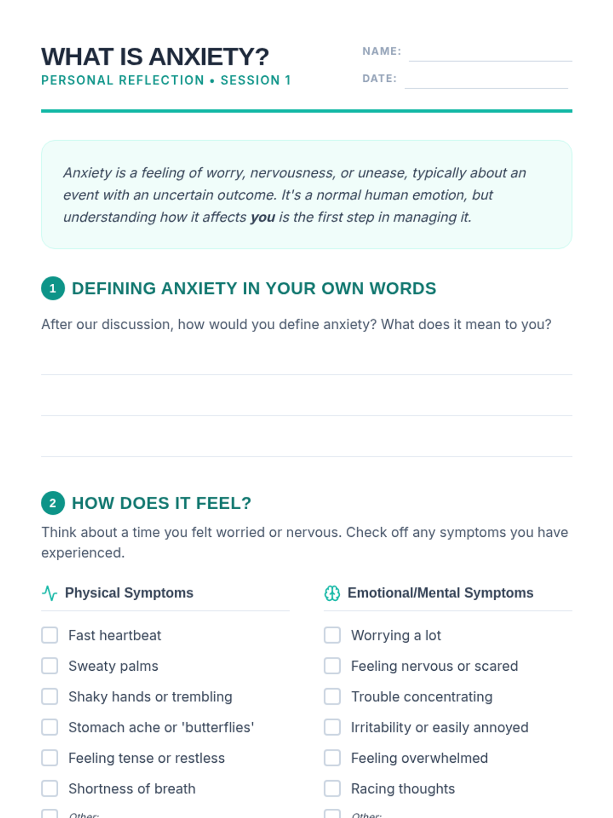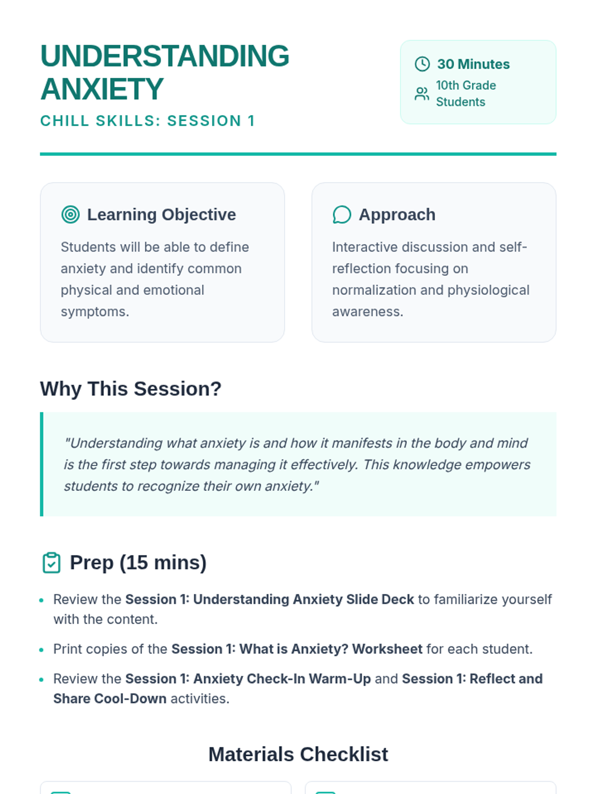 A comprehensive six-week small group therapy curriculum designed for high school students to understand and manage anxiety through psychoeducation, CBT techniques, and somatic coping strategies.