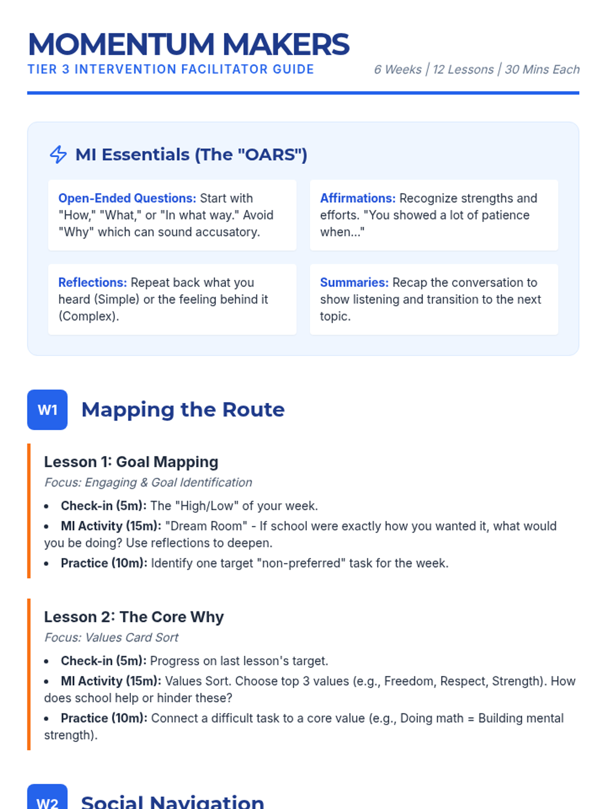A 6-week Tier 3 intervention program (12 lessons) using Motivational Interviewing to boost school motivation and social problem-solving skills.