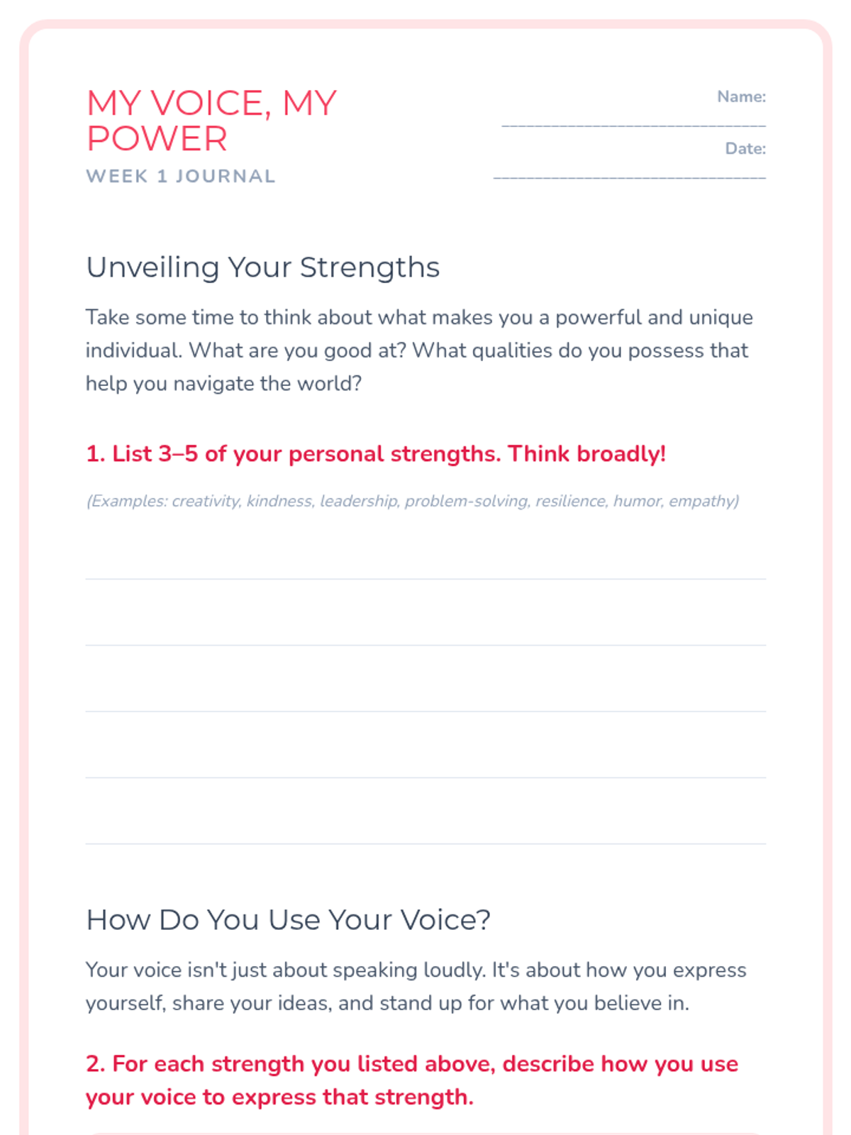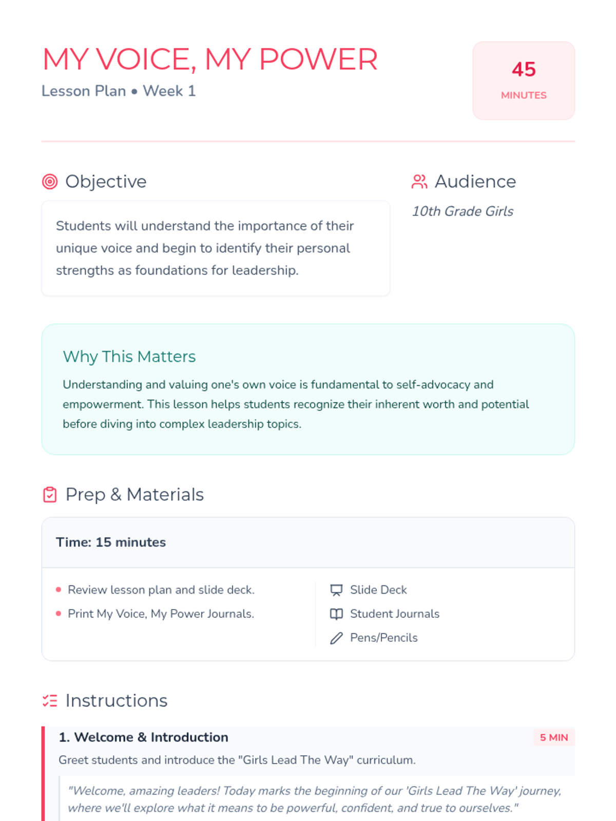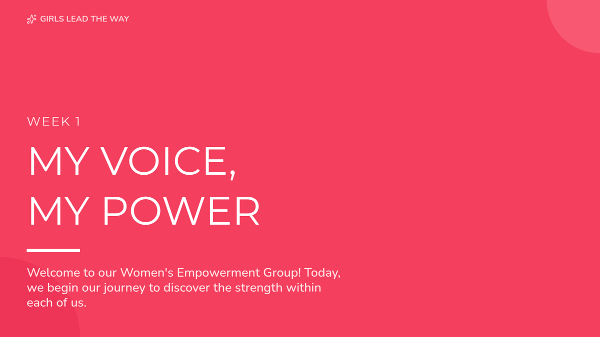 A 10-week curriculum for 10th-grade girls focused on fostering leadership, self-esteem, and critical thinking through engaging activities and discussions. Each 45-minute session empowers students to recognize their strengths and advocate for themselves and others.