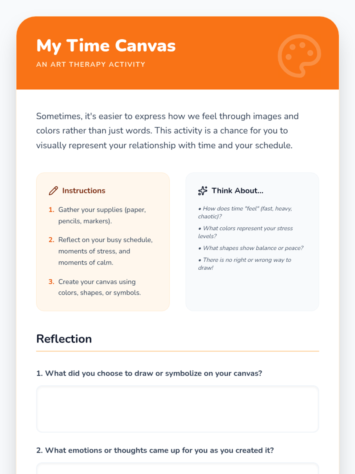An 8-week empowerment group for 10th-grade girls focused on time management, stress reduction, and building resilience through creative expression and peer support. Each session combines skill-building with art therapy and discussion.