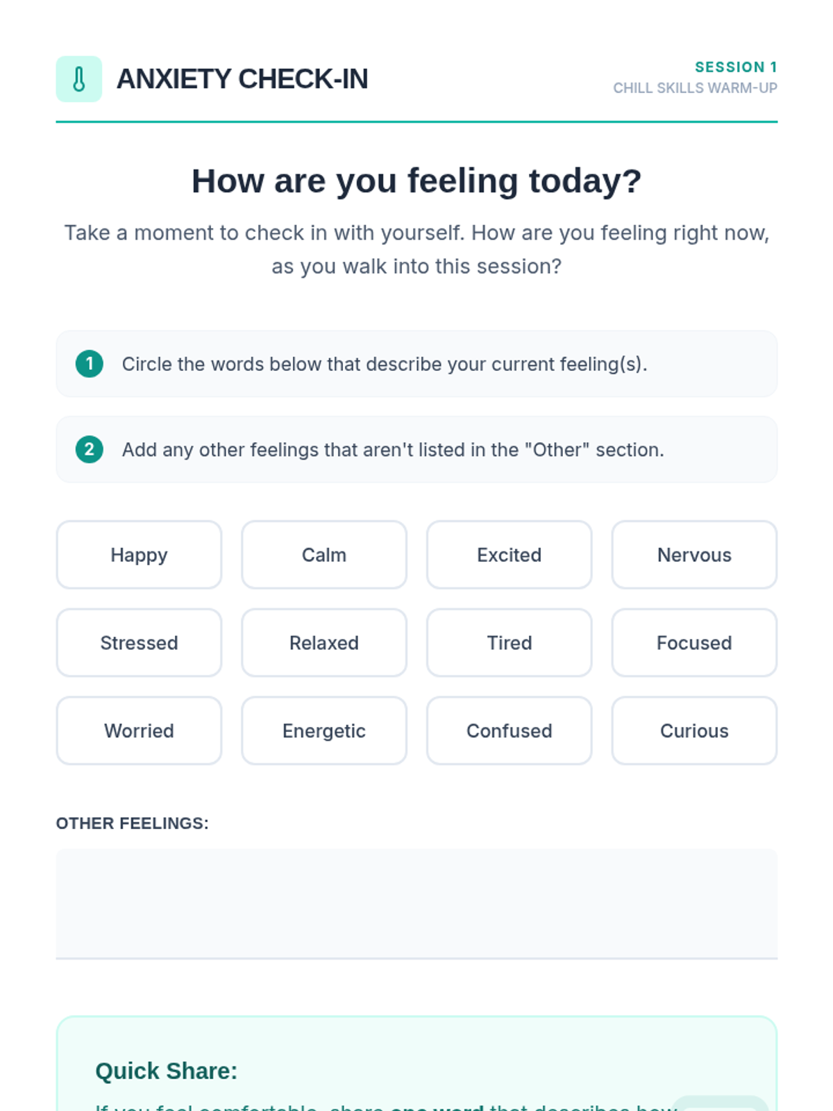 A comprehensive 8-session school counseling group program designed for students struggling with anxiety and depression. It uses a weather metaphor to help students identify, understand, and manage their internal emotional states through CBT, mindfulness, and social-emotional learning.