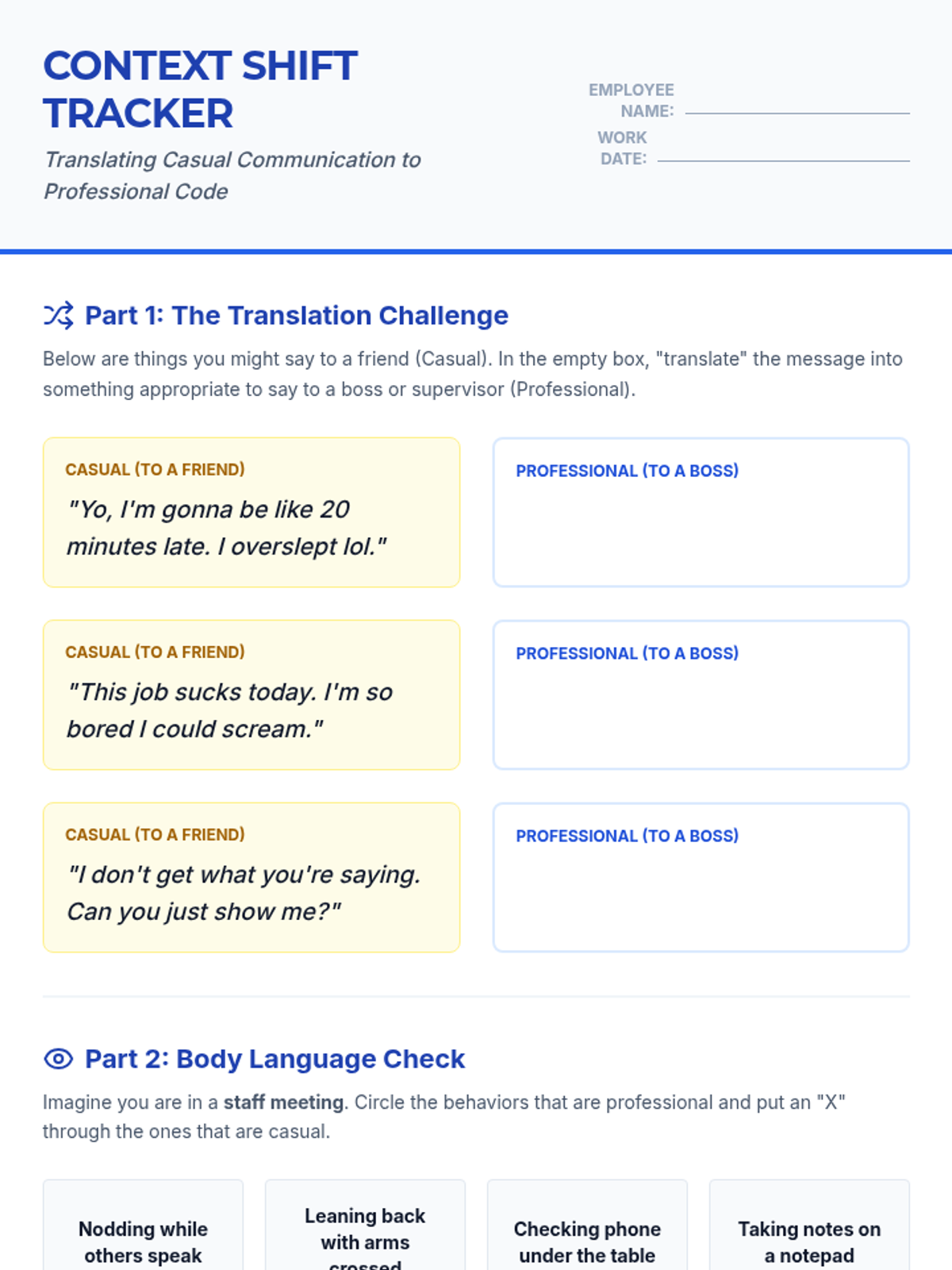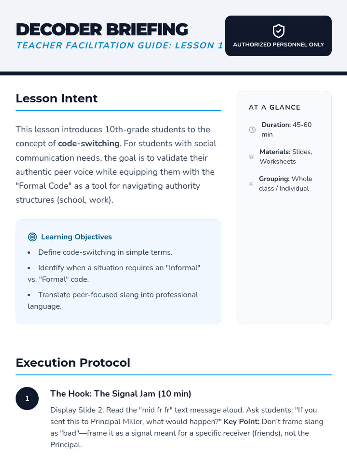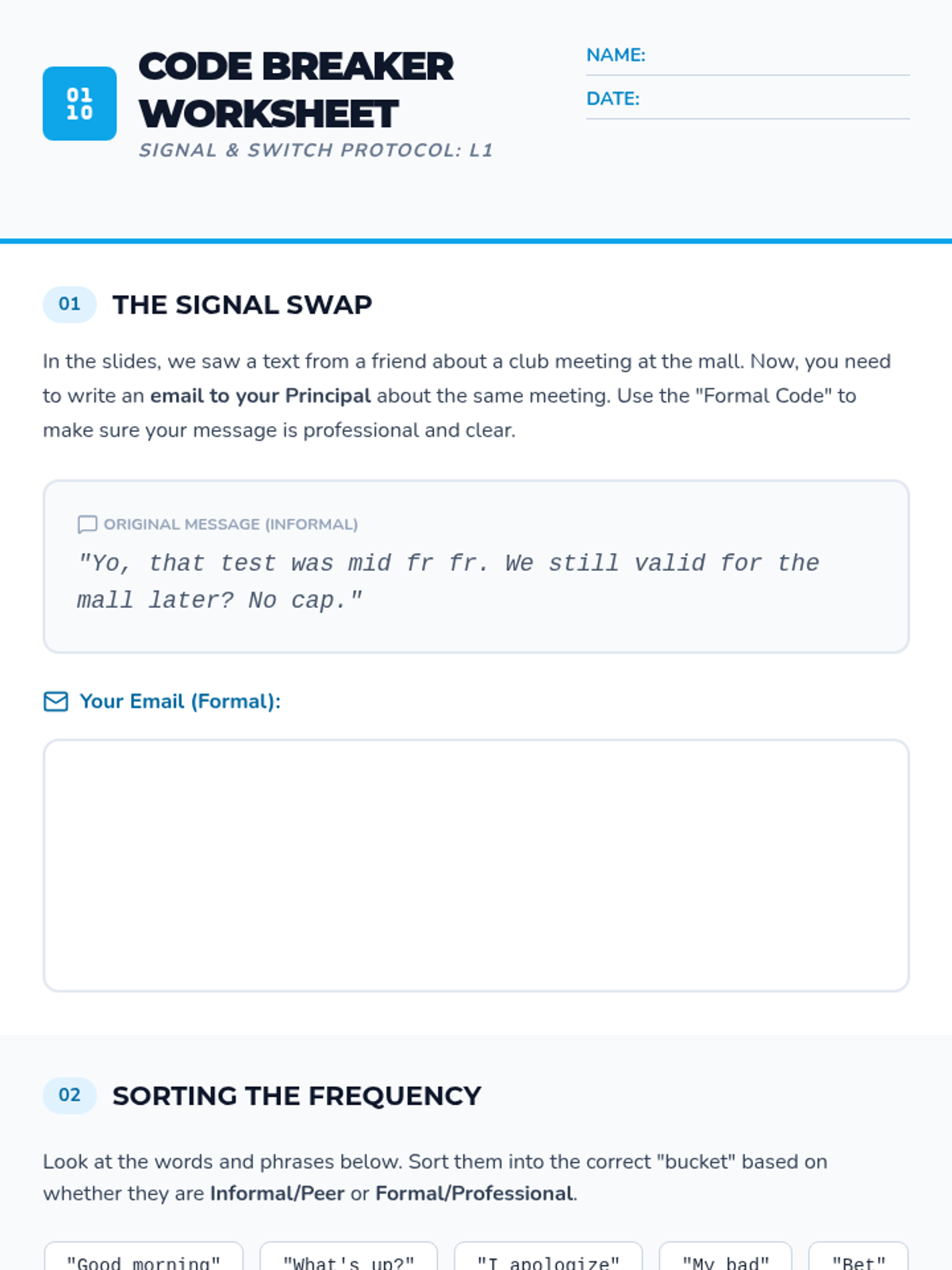 This sequence helps 10th-grade students understand and practice code-switching in school environments. It validates their natural peer language while teaching the skills needed to adapt their communication for authority figures and formal situations.